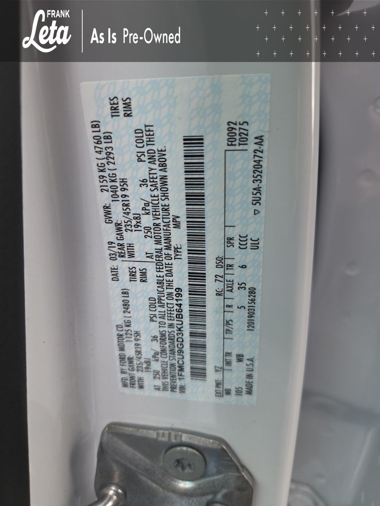 2019 Ford Escape SE Oxford White Escape SE, 1.5L EcoBoost, 4WD, Chromite Gray/Charcoal Black w/Heated Partial Leather Front Sport Bucket Seats, AppLink/Apple CarPlay and Android Auto, Exterior Parking Camera Rear, Front dual zone A/C, Front fog lights, Fully automatic headlights, Heated front seats, Heated Partial Leather Front Sport Bucket Seats, Wheels: 19" Premium Ebony Black-Painted Aluminum, 3.51 Axle Ratio, 4-Wheel Disc Brakes, 6 Speakers, ABS brakes, Air Conditioning, AM/FM radio: SiriusXM, Automatic temperature control, Black Beltline Molding, Black Roof-Rack Side Rails, Brake assist, Bumpers: body-color, Compass, Delay-off headlights, Driver door bin, Driver vanity mirror, Dual front impact airbags, Dual front side impact airbags, Electronic Stability Control, Emergency communication system: SYNC 3 911 Assist, FordPass Connect, Four wheel independent suspension, Front & Rear Gloss Black-Painted Skid Plates, Front anti-roll bar, Front Bucket Seats, Front Center Armrest, Front reading lights, Gloss Black-Painted Sideview Mirror Caps, Gloss Black-Painted Upper Grille Bars & Plinth, Halogen Projector Headlamps w/Black Bezels, Illuminated entry, Knee airbag, Leather-Wrapped Steering Wheel & Shift Knob, Low tire pressure warning, Occupant sensing airbag, Outside temperature display, Overhead airbag, Overhead console, Panic alarm, Passenger door bin, Passenger vanity mirror, Power door mirrors, Power driver seat, Power steering, Power windows, Radio data system, Radio: AM/FM Stereo w/MP3 Capable, Rear anti-roll bar, Rear seat center armrest, Rear window defroster, Rear window wiper, Remote keyless entry, SE Sport Appearance Package, Security system, Speed control, Speed-sensing steering, Split folding rear seat, Steering wheel mounted audio controls, SYNC 3 Communications & Entertainment System, Tachometer, Taillamps w/Black Bezel, Telescoping steering wheel, Tilt steering wheel, Traction control, Trip computer, Variably intermittent wipers, Escape SE, 1.5L EcoBoost, 4WD, Chromite Gray/Charcoal Black w/Heated Partial Leather Front Sport Bucket Seats, AppLink/Apple CarPlay and Android Auto, Exterior Parking Camera Rear, Front dual zone A/C, Front fog lights, Fully automatic headlights, Heated front seats, Heated Partial Leather Front Sport Bucket Seats, Wheels: 19" Premium Ebony Black-Painted Aluminum. 1.5L EcoBoost 6-Speed Automatic 4WD 4D Sport Utility 22/28 City/Highway MPG