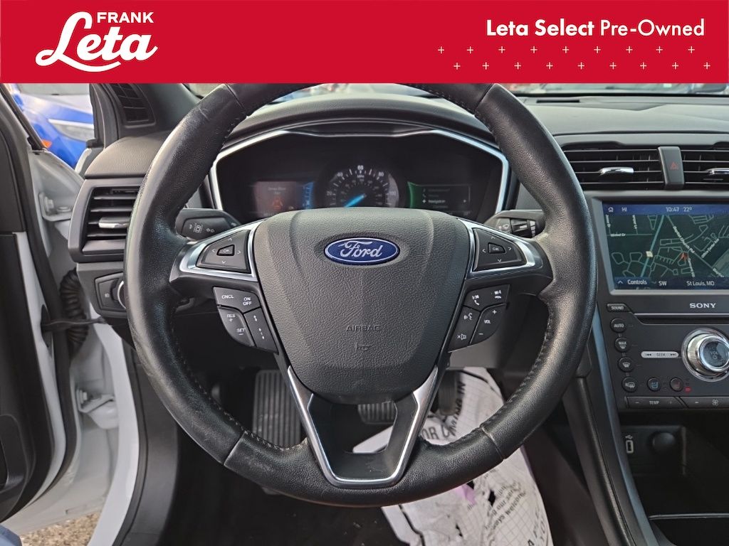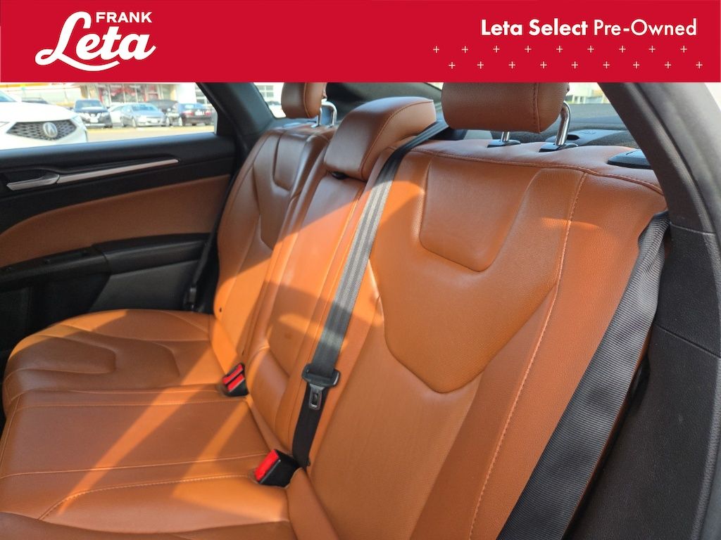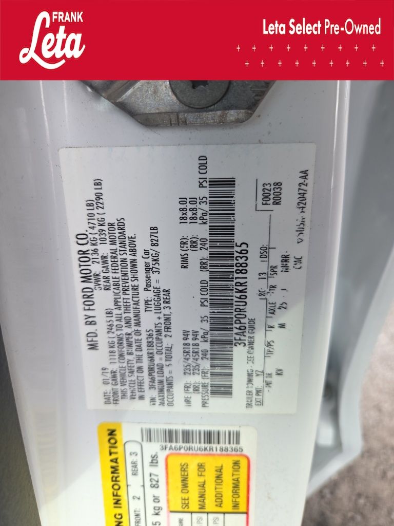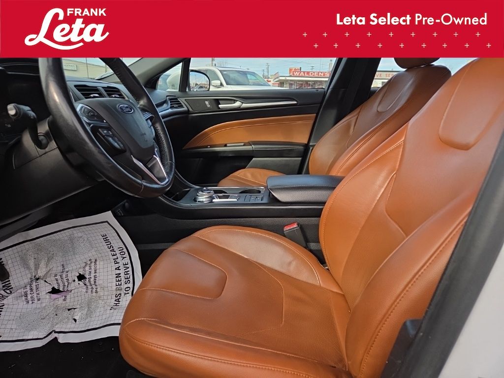 2019 Ford Fusion Hybrid Titanium Oxford White Fusion Hybrid Titanium, Frank Leta Select Certified, I4 Hybrid, Oxford White, Russet Leather, 12 Speakers, Auto-dimming door mirrors, Auto-dimming Rear-View mirror, Exterior Parking Camera Rear, Front dual zone A/C, Front fog lights, Fully automatic headlights, Garage door transmitter, Heated door mirrors, Heated front seats, Heated steering wheel, Lane Departure Warning System, Memory seat, Navigation System, Power moonroof, Rear Parking Sensors, Ventilated front seats, Wheels: 18" Premium-Painted Aluminum, 4-Wheel Disc Brakes, ABS brakes, Air Conditioning, AM/FM radio: SiriusXM, Auto High-beam Headlights, Automatic temperature control, Brake assist, Bumpers: body-color, CD player, Compass, Delay-off headlights, Driver door bin, Driver vanity mirror, Dual front impact airbags, Dual front side impact airbags, Electronic Stability Control, Emergency communication system: SYNC 3 911 Assist, Equipment Group 650A, Four wheel independent suspension, Front anti-roll bar, Front Bucket Seats, Front Center Armrest, Front reading lights, Illuminated entry, Knee airbag, Leather Heated/Cooled Sport Bucket Seats, Low tire pressure warning, Occupant sensing airbag, Outside temperature display, Overhead airbag, Overhead console, Panic alarm, Passenger door bin, Passenger vanity mirror, Power door mirrors, Power driver seat, Power passenger seat, Power steering, Power windows, Radio data system, Radio: AM/FM Stereo w/MP3/Single-CD Player, Rain sensing wipers, Rear anti-roll bar, Rear reading lights, Rear seat center armrest, Rear window defroster, Remote keyless entry, Security system, Speed control, Speed-sensing steering, Speed-Sensitive Wipers, Split folding rear seat, Spoiler, Steering wheel mounted audio controls, SYNC 3 Communications & Entertainment System, Tachometer, Telescoping steering wheel, Tilt steering wheel, Traction control, Trip computer, Turn signal indicator mirrors, Variably intermittent wipers, Fusion Hybrid Titanium, I4 Hybrid, Oxford White, Russet Leather, 12 Speakers, Auto-dimming door mirrors, Auto-dimming Rear-View mirror, Exterior Parking Camera Rear, Front dual zone A/C, Front fog lights, Fully automatic headlights, Garage door transmitter, Heated door mirrors, Heated front seats, Heated steering wheel, Lane Departure Warning System, Memory seat, Navigation System, Power moonroof, Rear Parking Sensors, Ventilated front seats, Wheels: 18" Premium-Painted Aluminum. I4 Hybrid eCVT FWD 4D Sedan 43/41 City/Highway MPG