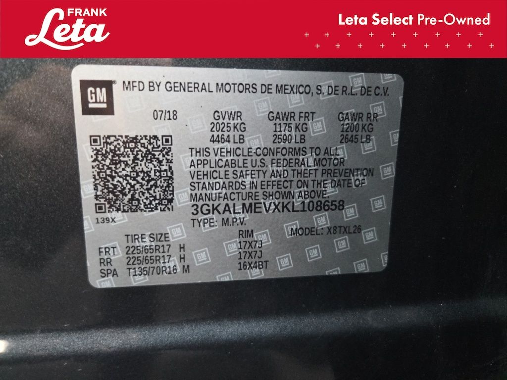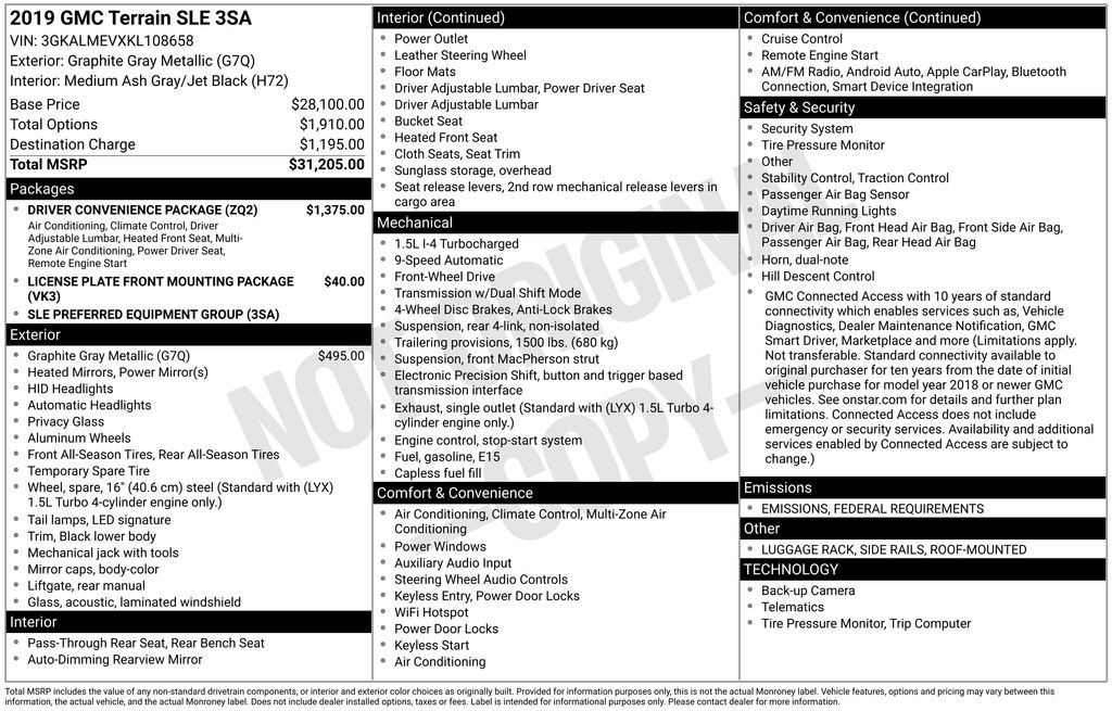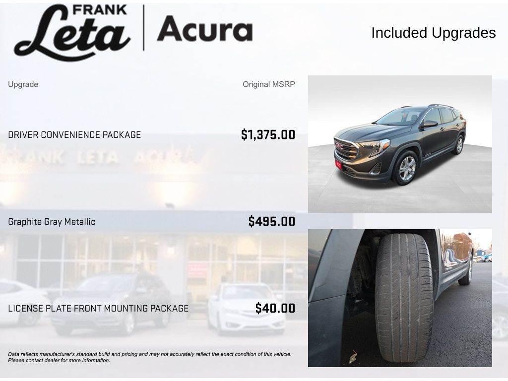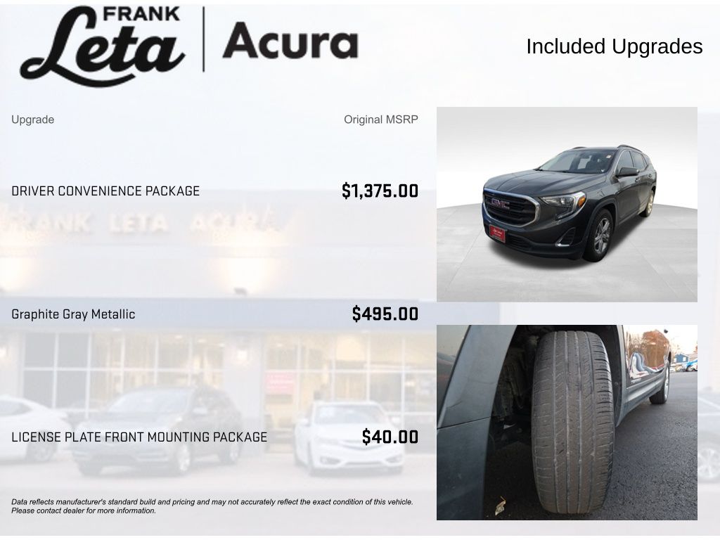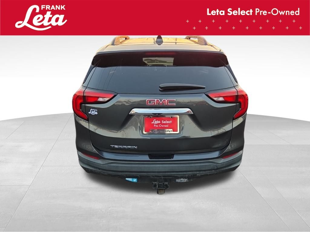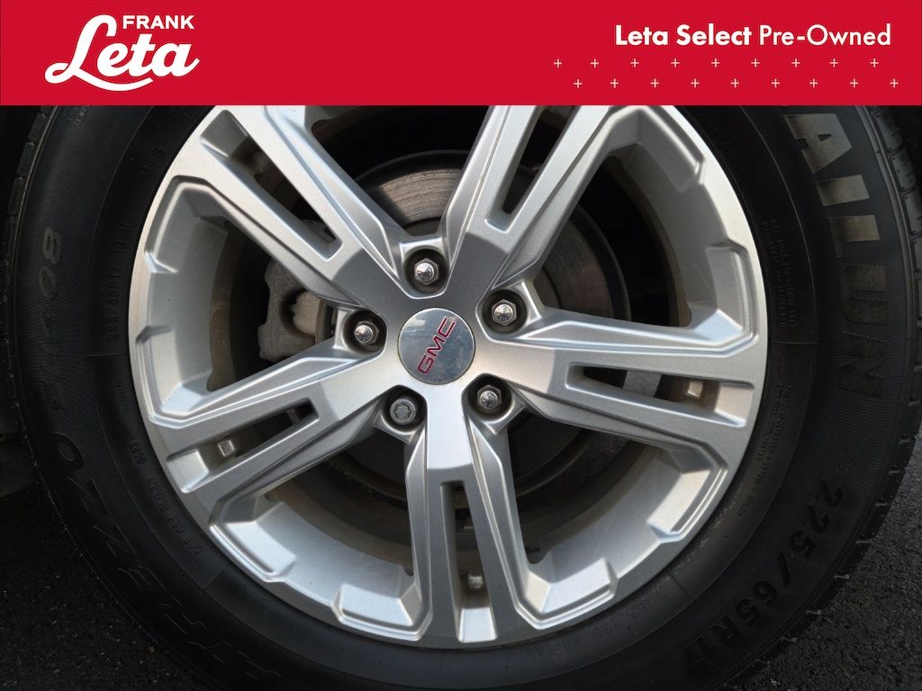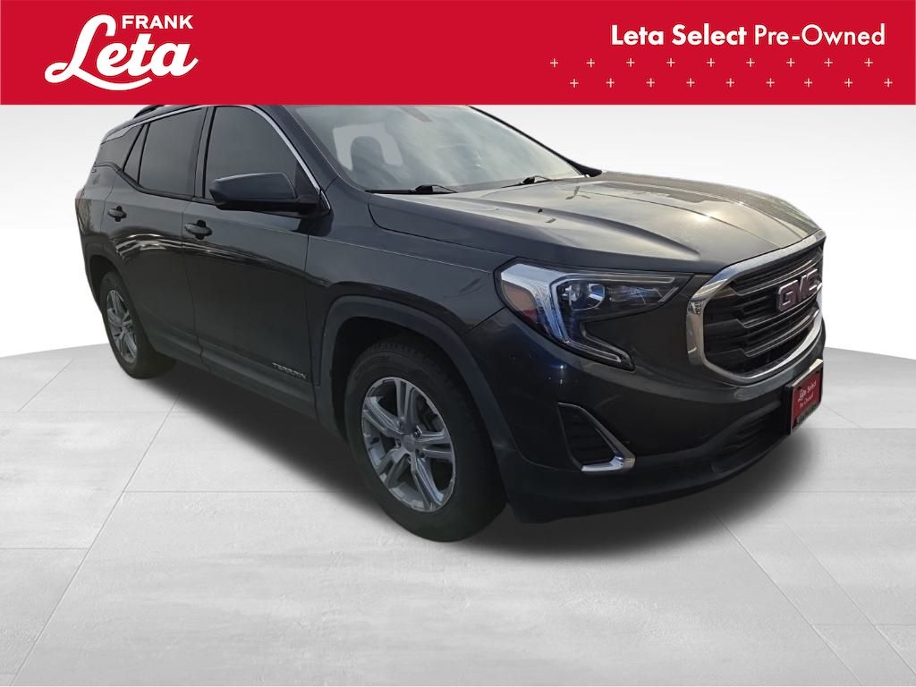 2019 GMC Terrain SLE Graphite Gray Metallic Terrain SLE, Frank Leta Select Certified, Graphite Gray Metallic, Medium Ash Gray/Jet Black Cloth, Apple CarPlay/Android Auto, Auto-dimming Rear-View mirror, Bluetooth For Phone, Dual-Zone Automatic Climate Control, Exterior Parking Camera Rear, Fully automatic headlights, Heated door mirrors, High-Intensity Discharge Headlights, Remote Start, Wheels: 17" x 7" Silver Painted Aluminum, 2 USB Data Ports w/Auxiliary Input Jack, 3.47 Axle Ratio, 4-Way Manual Driver's Seat, 4-Way Manual Front Passenger Seat, 4-Wheel Disc Brakes, 6 Speakers, 6-Speaker Audio System Feature, 8-Way Power Driver Seat Adjuster, ABS brakes, Air Conditioning, AM/FM radio, Brake assist, Bumpers: body-color, Compass, Delay-off headlights, Driver & Front Passenger Heated Seats, Driver Convenience Package, Driver door bin, Driver vanity mirror, Dual front impact airbags, Dual front side impact airbags, Electronic Stability Control, Emergency communication system, Four wheel independent suspension, Front anti-roll bar, Front Bucket Seats, Front Center Armrest, Front reading lights, Illuminated entry, License Plate Front Mounting Package, Low tire pressure warning, Occupant sensing airbag, Outside temperature display, Overhead airbag, Overhead console, Panic alarm, Passenger door bin, Passenger vanity mirror, Power door mirrors, Power Driver Lumbar Control, Power steering, Power windows, Preferred Equipment Group 3SA, Premium Cloth Seat Trim, Radio data system, Radio: GMC Infotainment Audio System w/7" Display, Rear anti-roll bar, Rear seat center armrest, Rear window defroster, Rear window wiper, Remote keyless entry, Roof-Mounted Luggage Rack Black Side Rails, Security system, Speed control, Speed-sensing steering, Split folding rear seat, Spoiler, Steering wheel mounted audio controls, Tachometer, Telescoping steering wheel, Tilt steering wheel, Traction control, Trip computer, Variably intermittent wipers, Terrain SLE, Graphite Gray Metallic, Medium Ash Gray/Jet Black Cloth, Apple CarPlay/Android Auto, Auto-dimming Rear-View mirror, Bluetooth For Phone, Dual-Zone Automatic Climate Control, Exterior Parking Camera Rear, Fully automatic headlights, Heated door mirrors, High-Intensity Discharge Headlights, Remote Start, Wheels: 17" x 7" Silver Painted Aluminum. 1.5L DOHC 9-Speed Automatic FWD 4D Sport Utility 26/30 City/Highway MPG Awards: