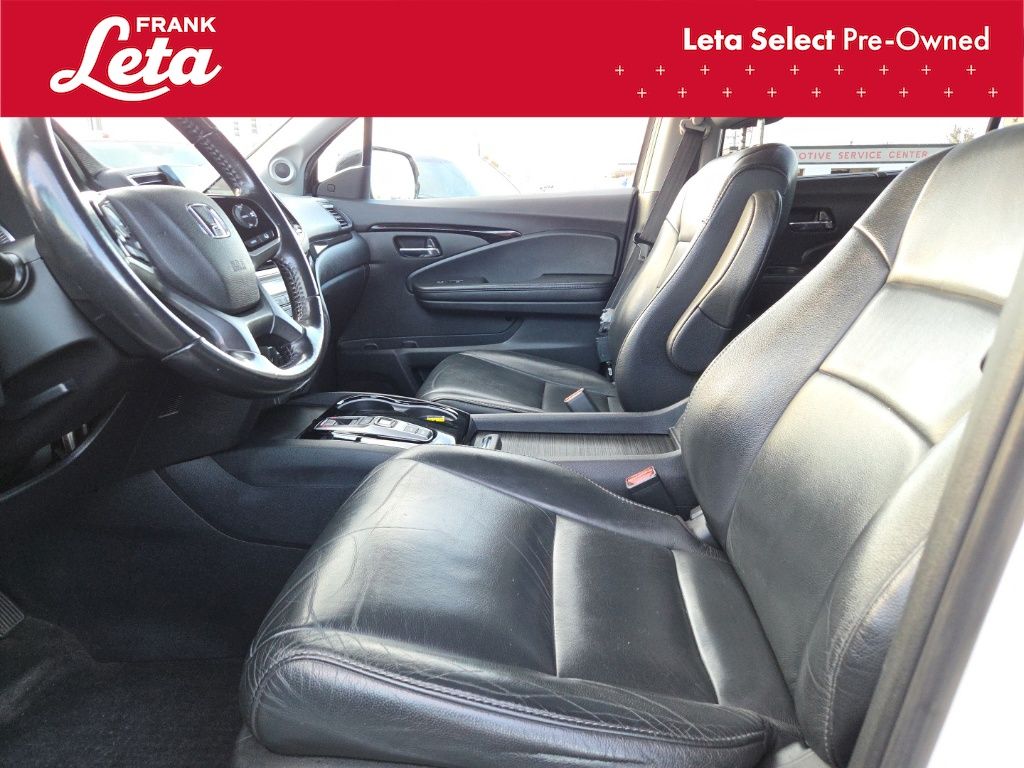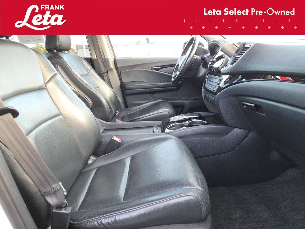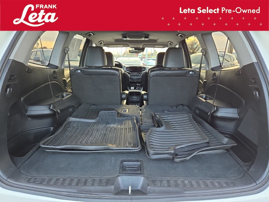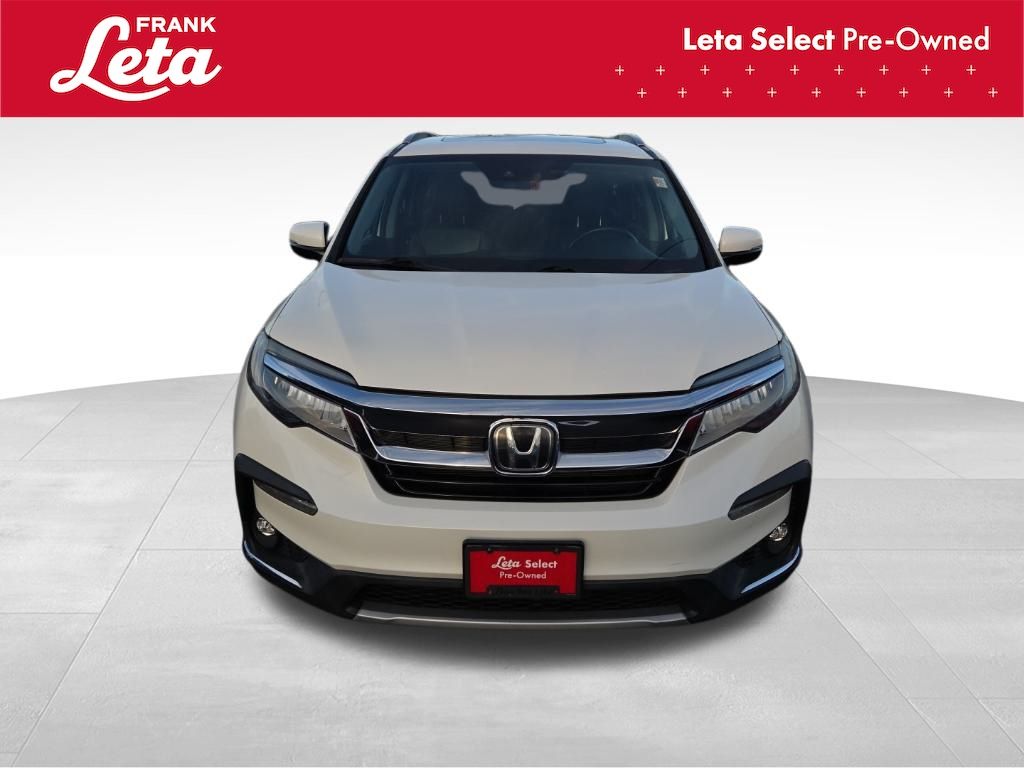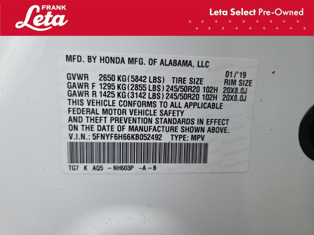 2019 Honda Pilot Touring 7 Passenger White Diamond Pearl Pilot Touring 7 Passenger, Frank Leta Select Certified, 3.5L V6 24V SOHC i-VTEC, AWD, White Diamond Pearl, Black w/Leather-Trimmed Seats, 10 Speakers, 3rd row seats: split-bench, Apple CarPlay/Android Auto, Auto-dimming Rear-View mirror, Blind Spot Information (BSI) System warning, Exterior Parking Camera Rear, Forward collision: Collision Mitigation Braking System (CMBS) + FCW mitigation, Front dual zone A/C, Front fog lights, Fully automatic headlights, Garage door transmitter: HomeLink, Heated front seats, Heated rear seats, Lane departure: Lane Keeping Assist System (LKAS) active, Memory seat, Navigation system: Honda Satellite-Linked Navigation System, Power Liftgate, Power moonroof, Rear air conditioning, Wheels: 20" Machine-Finished Alloy, 4-Wheel Disc Brakes, 4.334 Axle Ratio, A/V remote: CabinControl, ABS brakes, Air Conditioning, AM/FM radio: SiriusXM, Auto High-beam Headlights, Automatic temperature control, Brake assist, Bumpers: body-color, Compass, Delay-off headlights, Driver door bin, Driver vanity mirror, Dual front impact airbags, Dual front side impact airbags, Electronic Stability Control, Emergency communication system: HondaLink, Four wheel independent suspension, Front anti-roll bar, Front Bucket Seats, Front Center Armrest, Front reading lights, Headphones, Heated door mirrors, Heated Front Bucket Seats, Illuminated entry, Leather-Trimmed Seats, Low tire pressure warning, Occupant sensing airbag, Outside temperature display, Overhead airbag, Overhead console, Panic alarm, Passenger door bin, Passenger vanity mirror, Power door mirrors, Power driver seat, Power passenger seat, Power steering, Power windows, Radio data system, Radio: AM/FM Premium Audio System, Rear anti-roll bar, Rear reading lights, Rear window defroster, Rear window wiper, Reclining 3rd row seat, Remote keyless entry, Roof rack: rails only, Security system, Speed control, Speed-sensing steering, Speed-Sensitive Wipers, Split folding rear seat, Spoiler, Steering wheel mounted audio controls, Tachometer, Telescoping steering wheel, Tilt steering wheel, Traction control, Trip computer, Turn signal indicator mirrors, Variably intermittent wipers, Pilot Touring 7 Passenger, 3.5L V6 24V SOHC i-VTEC, AWD, White Diamond Pearl, Black w/Leather-Trimmed Seats, 10 Speakers, 3rd row seats: split-bench, Apple CarPlay/Android Auto, Auto-dimming Rear-View mirror, Blind Spot Information (BSI) System warning, Exterior Parking Camera Rear, Forward collision: Collision Mitigation Braking System (CMBS) + FCW mitigation, Front dual zone A/C, Front fog lights, Fully automatic headlights, Garage door transmitter: HomeLink, Heated front seats, Heated rear seats, Lane departure: Lane Keeping Assist System (LKAS) active, Memory seat, Navigation system: Honda Satellite-Linked Navigation System, Power Liftgate, Power moonroof, Rear air conditioning, Wheels: 20" Machine-Finished Alloy. 3.5L V6 24V SOHC i-VTEC 9-Speed Automatic AWD 4D Sport Utility Odometer is 26044 miles below market average! 19/26 City/Highway MPG Awards:
