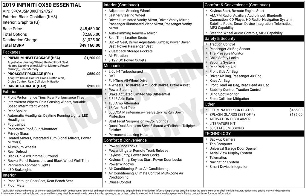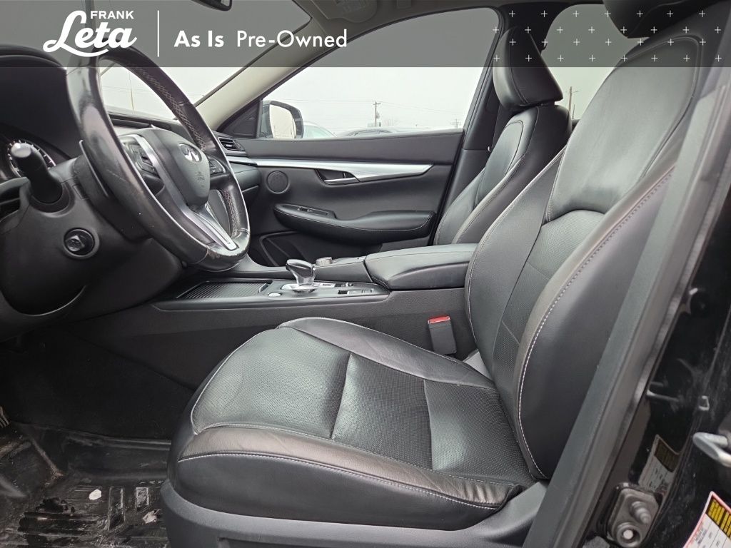 2019 INFINITI QX50 ESSENTIAL Black Obsidian QX50 ESSENTIAL, AWD, Black Obsidian, Graphite Leather, Back-Up Collision Intervention (BCI), Distance Control Assist, Exterior Parking Camera Rear, Front dual zone A/C, Front fog lights, Garage door transmitter: HomeLink, Heated door mirrors, Heated Front Seats, Heated Steering Wheel, Intelligent Cruise Control, Memory Seats, Navigation system: INFINITI InTouch Navigation, Power Liftgate, Power moonroof, Power Tilt & Telescopic Steering Wheel, Premium Heat Package, ProASSIST Package, Rear air conditioning, Rear Cross Traffic Alert, Reverse Synchronization Mirrors, Wheels: 19" x 7.5J Silver Painted Aluminum Alloy, 4-Wheel Disc Brakes, 5.846 Axle Ratio, 6 Speakers, ABS brakes, Activation Disclaimer, Air Conditioning, AM/FM radio: SiriusXM, AM/FM/CD Audio System, Anti-whiplash front head restraints, Auto-dimming Rear-View mirror, Automatic temperature control, Brake assist, Bumpers: body-color, Cargo Package, CD player, Delay-off headlights, Driver door bin, Driver vanity mirror, Dual front impact airbags, Dual front side impact airbags, Electronic Stability Control, Emergency communication system: INFINITI Connection, Floor Mats, Four wheel independent suspension, Front anti-roll bar, Front Bucket Seats, Front Center Armrest, Front reading lights, Illuminated entry, Illuminated Kick Plates, Knee airbag, Leather Shift Knob, Literature Kit, Low tire pressure warning, Occupant sensing airbag, Outside temperature display, Overhead airbag, Overhead console, Panic alarm, Passenger door bin, Passenger vanity mirror, Power door mirrors, Power driver seat, Power passenger seat, Power steering, Power windows, Radio data system, Rain sensing wipers, Rear anti-roll bar, Rear reading lights, Rear seat center armrest, Rear window defroster, Rear window wiper, Remote keyless entry, Roof rack: rails only, Security system, Speed control, Speed-sensing steering, Speed-Sensitive Wipers, Splash Guards (Set of 4), Split folding rear seat, Spoiler, Standard Leather Seat Trim, Steering wheel mounted audio controls, Tachometer, Telescoping steering wheel, Tilt steering wheel, Traction control, Trip computer, Turn signal indicator mirrors, Variably intermittent wipers, QX50 ESSENTIAL, AWD, Black Obsidian, Graphite Leather, Back-Up Collision Intervention (BCI), Distance Control Assist, Exterior Parking Camera Rear, Front dual zone A/C, Front fog lights, Garage door transmitter: HomeLink, Heated door mirrors, Heated Front Seats, Heated Steering Wheel, Intelligent Cruise Control, Memory Seats, Navigation system: INFINITI InTouch Navigation, Power Liftgate, Power moonroof, Power Tilt & Telescopic Steering Wheel, Premium Heat Package, ProASSIST Package, Rear air conditioning, Rear Cross Traffic Alert, Reverse Synchronization Mirrors, Wheels: 19" x 7.5J Silver Painted Aluminum Alloy. I4 CVT AWD 4D Sport Utility 24/30 City/Highway MPG