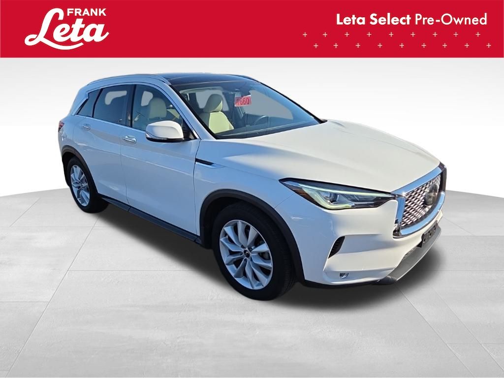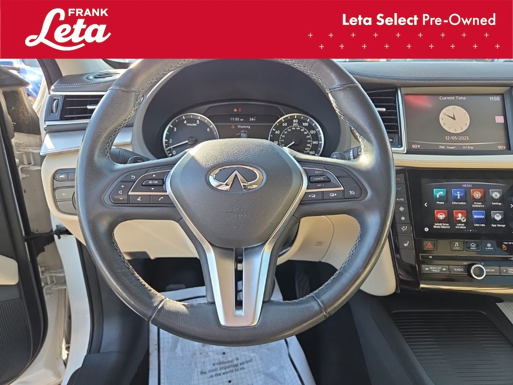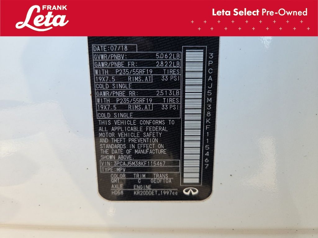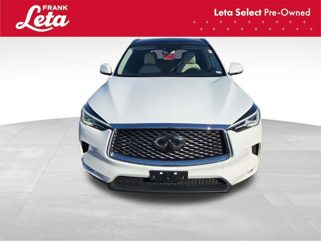 2019 INFINITI QX50 LUXE Lunar White QX50 LUXE, Frank Leta Select Certified, AWD, Lunar White, Wheat/Black w/Leatherette Appointed Seat Trim, Auto-dimming Rear-View mirror, Exterior Parking Camera Rear, Front dual zone A/C, Front fog lights, Garage door transmitter: HomeLink, Power Liftgate, Power moonroof, Wheels: 19" x 7.5J Silver Painted Aluminum Alloy, 4-Wheel Disc Brakes, 5.846 Axle Ratio, 6 Speakers, ABS brakes, Activation Disclaimer, Air Conditioning, AM/FM radio: SiriusXM, AM/FM/CD Audio System, Anti-whiplash front head restraints, Automatic temperature control, Brake assist, Bumpers: body-color, Cargo Package, CD player, Delay-off headlights, Driver door bin, Driver vanity mirror, Dual front impact airbags, Dual front side impact airbags, Electronic Stability Control, Floor Mats, Four wheel independent suspension, Front anti-roll bar, Front Bucket Seats, Front Center Armrest, Front reading lights, Illuminated entry, Knee airbag, Leather Shift Knob, Leatherette Appointed Seat Trim, Literature Kit, Low tire pressure warning, Occupant sensing airbag, Outside temperature display, Overhead airbag, Overhead console, Panic alarm, Passenger door bin, Passenger vanity mirror, Power door mirrors, Power driver seat, Power passenger seat, Power steering, Power windows, Radio data system, Rear anti-roll bar, Rear reading lights, Rear seat center armrest, Rear window defroster, Rear window wiper, Remote keyless entry, Roof rack: rails only, Security system, Speed control, Speed-sensing steering, Speed-Sensitive Wipers, Splash Guards (Set of 4), Split folding rear seat, Spoiler, Steering wheel mounted audio controls, Tachometer, Telescoping steering wheel, Tilt steering wheel, Traction control, Trip computer, Turn signal indicator mirrors, Variably intermittent wipers, QX50 LUXE, AWD, Lunar White, Wheat/Black w/Leatherette Appointed Seat Trim, Auto-dimming Rear-View mirror, Exterior Parking Camera Rear, Front dual zone A/C, Front fog lights, Garage door transmitter: HomeLink, Power Liftgate, Power moonroof, Wheels: 19" x 7.5J Silver Painted Aluminum Alloy. I4 CVT AWD 4D Sport Utility 24/30 City/Highway MPG