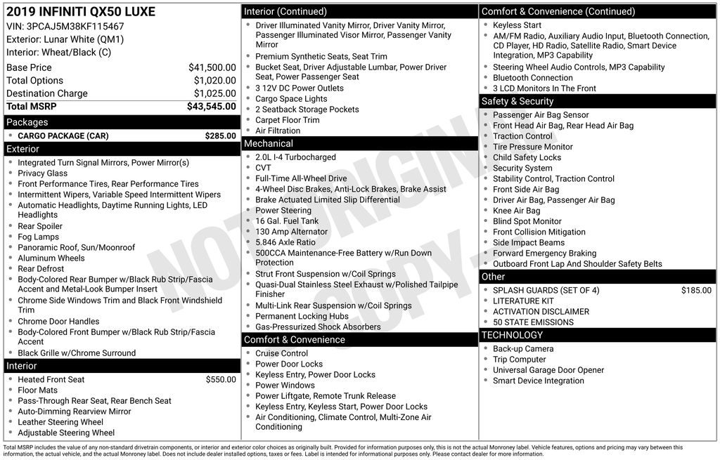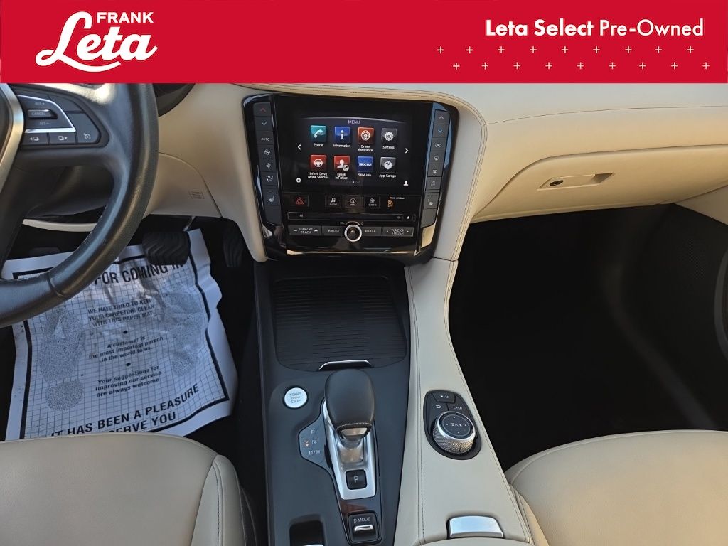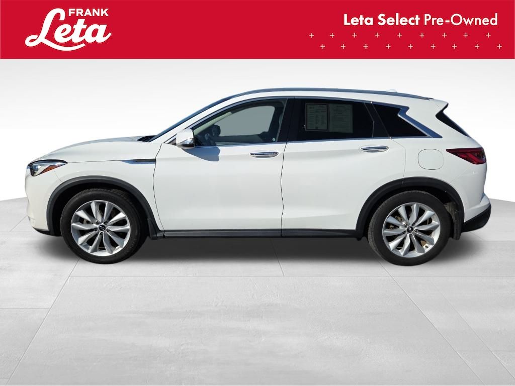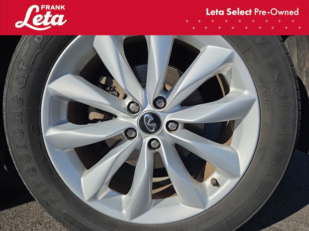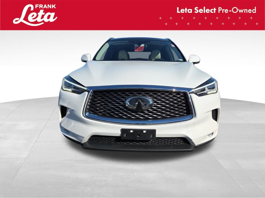 2019 INFINITI QX50 LUXE Lunar White QX50 LUXE, Frank Leta Select Certified, AWD, Lunar White, Wheat/Black w/Leatherette Appointed Seat Trim, Auto-dimming Rear-View mirror, Exterior Parking Camera Rear, Front dual zone A/C, Front fog lights, Garage door transmitter: HomeLink, Power Liftgate, Power moonroof, Wheels: 19" x 7.5J Silver Painted Aluminum Alloy, 4-Wheel Disc Brakes, 5.846 Axle Ratio, 6 Speakers, ABS brakes, Activation Disclaimer, Air Conditioning, AM/FM radio: SiriusXM, AM/FM/CD Audio System, Anti-whiplash front head restraints, Automatic temperature control, Brake assist, Bumpers: body-color, Cargo Package, CD player, Delay-off headlights, Driver door bin, Driver vanity mirror, Dual front impact airbags, Dual front side impact airbags, Electronic Stability Control, Floor Mats, Four wheel independent suspension, Front anti-roll bar, Front Bucket Seats, Front Center Armrest, Front reading lights, Illuminated entry, Knee airbag, Leather Shift Knob, Leatherette Appointed Seat Trim, Literature Kit, Low tire pressure warning, Occupant sensing airbag, Outside temperature display, Overhead airbag, Overhead console, Panic alarm, Passenger door bin, Passenger vanity mirror, Power door mirrors, Power driver seat, Power passenger seat, Power steering, Power windows, Radio data system, Rear anti-roll bar, Rear reading lights, Rear seat center armrest, Rear window defroster, Rear window wiper, Remote keyless entry, Roof rack: rails only, Security system, Speed control, Speed-sensing steering, Speed-Sensitive Wipers, Splash Guards (Set of 4), Split folding rear seat, Spoiler, Steering wheel mounted audio controls, Tachometer, Telescoping steering wheel, Tilt steering wheel, Traction control, Trip computer, Turn signal indicator mirrors, Variably intermittent wipers, QX50 LUXE, AWD, Lunar White, Wheat/Black w/Leatherette Appointed Seat Trim, Auto-dimming Rear-View mirror, Exterior Parking Camera Rear, Front dual zone A/C, Front fog lights, Garage door transmitter: HomeLink, Power Liftgate, Power moonroof, Wheels: 19" x 7.5J Silver Painted Aluminum Alloy. I4 CVT AWD 4D Sport Utility 24/30 City/Highway MPG