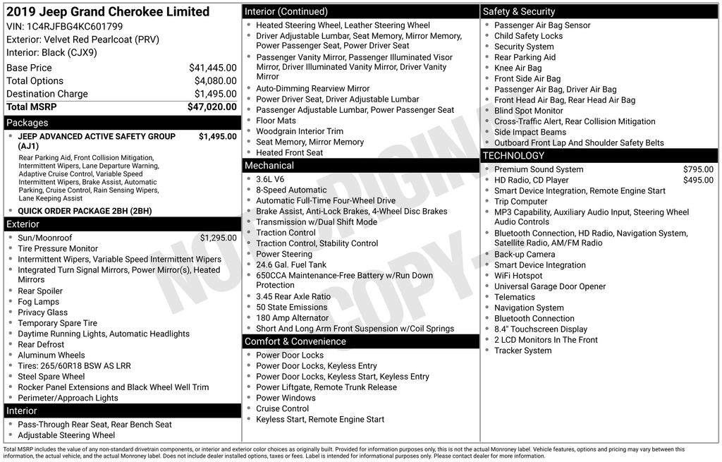This 2019 Jeep Grand Cherokee Limited has been meticulously inspected and certified by our experienced technicians. With its powerful 3.6L V6 engine and capable 4-wheel drive system, this Grand Cherokee delivers a confident and capable driving experience both on and off the road. The exterior's bold red paint and sleek styling are sure to turn heads, while the spacious and well-appointed interior offers premium comfort and convenience features.