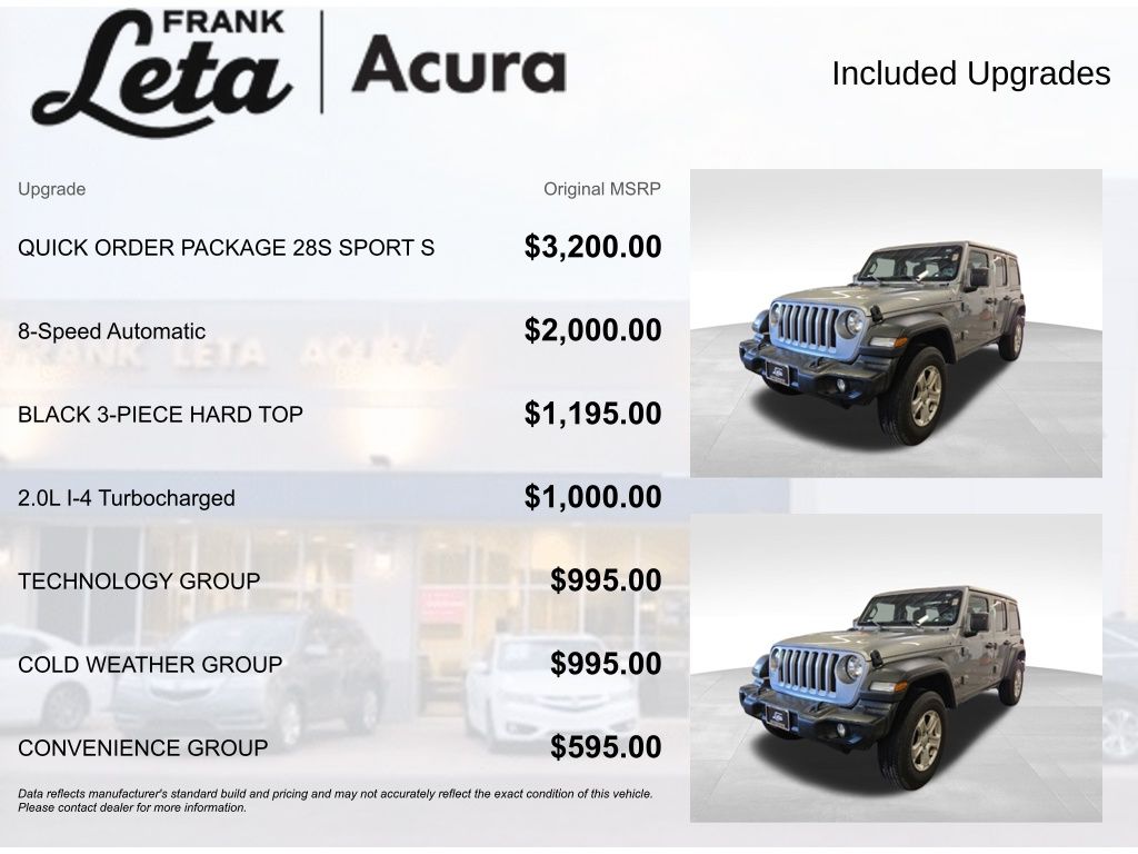Designed for both adventure and everyday driving, the Wrangler Unlimited Sport S offers unparalleled versatility. The available Black 3-Piece Hard Top provides exceptional security and protection, while the Convenience Group's universal garage door opener adds an extra layer of convenience to your daily routine.