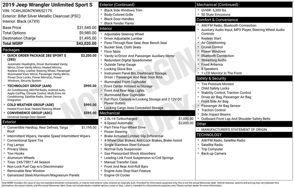 Discover the ultimate in off-road capability and on-road comfort with this 2019 Jeep Wrangler Unlimited Sport S. Powered by a 2.0L I4 DOHC DI Turbo eTorque engine and equipped with an 8-speed automatic transmission, this Wrangler delivers impressive performance and efficiency, with EPA-estimated fuel economy ratings of 22 MPG in the city and 24 MPG on the highway.
