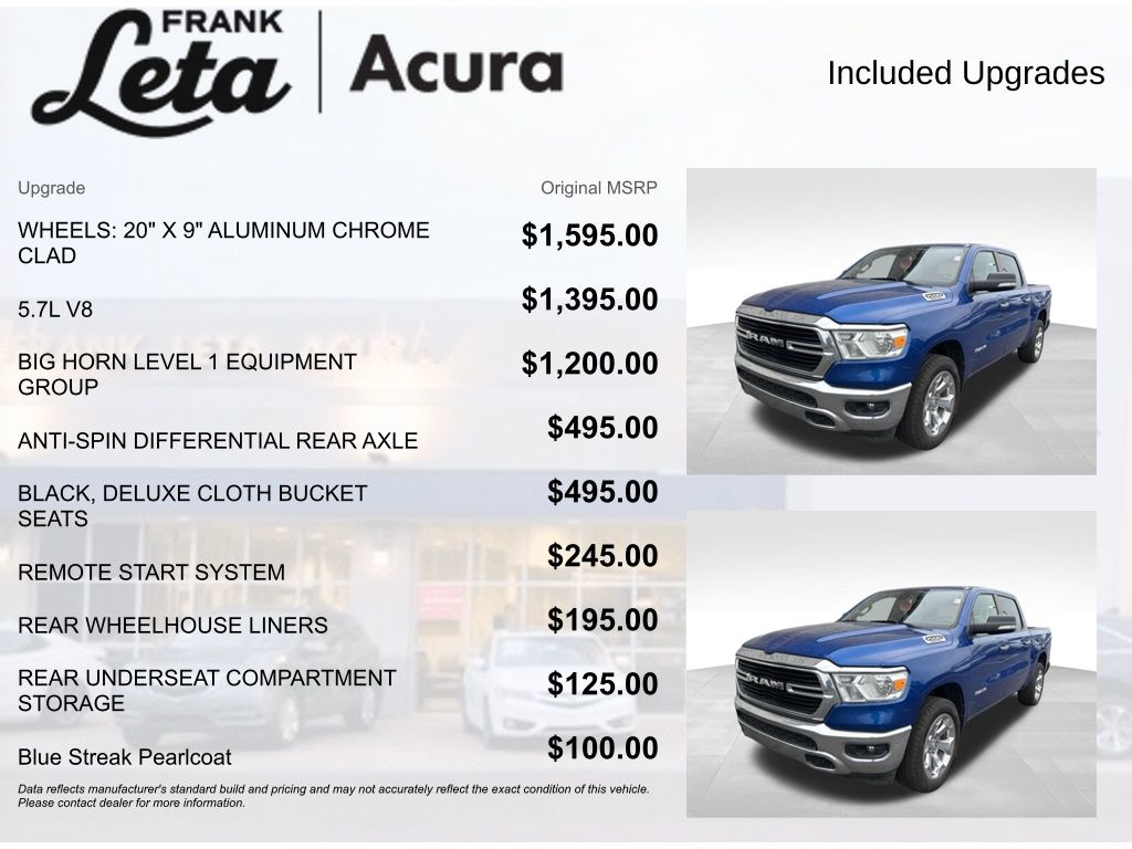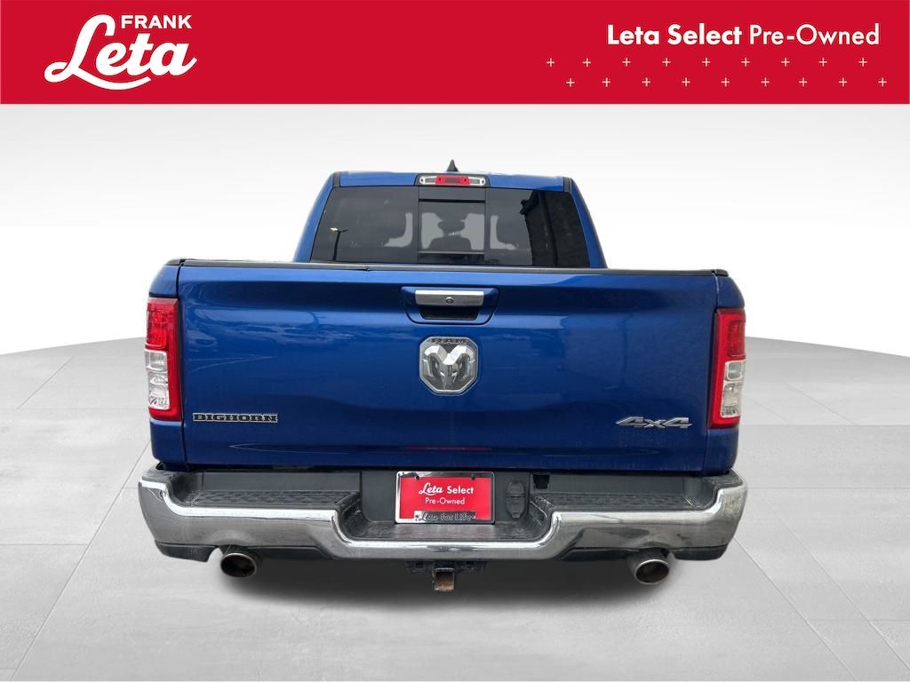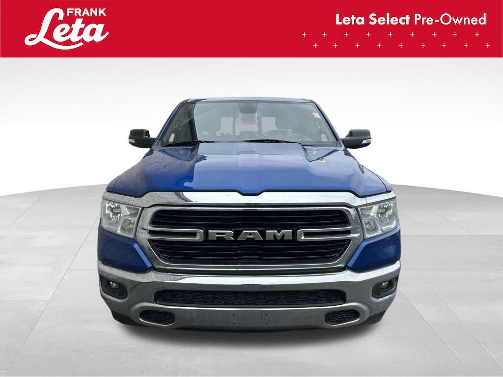 2019 Ram 1500 Big Horn/Lone Star Blue Streak Pearlcoat Frank Leta Select Certified, HEMI 5.7L V8 Multi Displacement VVT, 4WD, Blue Streak Pearlcoat, Anti-Spin Differential Rear Axle, Front fog lights, Fully automatic headlights, Heated door mirrors, ParkView Rear Back-Up Camera, Wheels: 20" x 9" Aluminum Chrome Clad, 3 Rear Seat Head Restraints, 3.21 Rear Axle Ratio, 4 Way Front Headrests, 4-Wheel Disc Brakes, 48V Belt Starter Generator, 6 Speakers, ABS brakes, Air Conditioning, AM/FM radio, Big Horn Level 1 Equipment Group, Brake assist, Bumpers: chrome, Cloth Bench Seat, Compass, Delay-off headlights, Driver door bin, Dual front impact airbags, Dual front side impact airbags, Electronic Stability Control, Front anti-roll bar, Front Center Armrest w/Storage, Front reading lights, Front Seat Back Map Pockets, Front wheel independent suspension, GPS Antenna Input, Illuminated entry, Leather steering wheel, Low tire pressure warning, Occupant sensing airbag, Outside temperature display, Overhead airbag, Overhead console, Panic alarm, Passenger door bin, Passenger vanity mirror, Power door mirrors, Power steering, Power windows, Quick Order Package 25Z Big Horn/Lone Star, Radio data system, Radio: Uconnect 4 w/8.4" Display, Rear 60/40 Folding Seat, Rear anti-roll bar, Rear seat center armrest, Rear step bumper, Rear Underseat Compartment Storage, Rear Wheelhouse Liners, Remote keyless entry, Remote Start System, Single Disc Remote CD Player, Speed control, Split folding rear seat, Tachometer, Telescoping steering wheel, Tilt steering wheel, Traction control, Trip computer, Variably intermittent wipers, Voltmeter, HEMI 5.7L V8 Multi Displacement VVT, 4WD, Blue Streak Pearlcoat, Anti-Spin Differential Rear Axle, Front fog lights, Fully automatic headlights, Heated door mirrors, ParkView Rear Back-Up Camera, Wheels: 20" x 9" Aluminum Chrome Clad. HEMI 5.7L V8 Multi Displacement VVT 8-Speed Automatic 4WD 4D Crew Cab Odometer is 39765 miles below market average! Awards:
