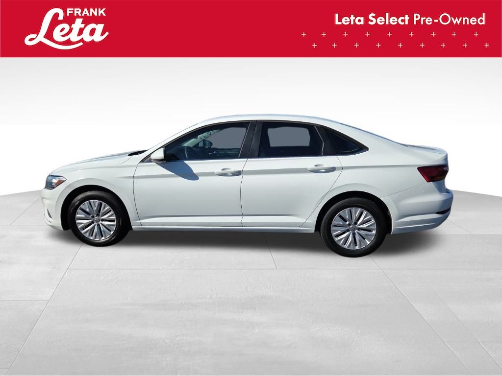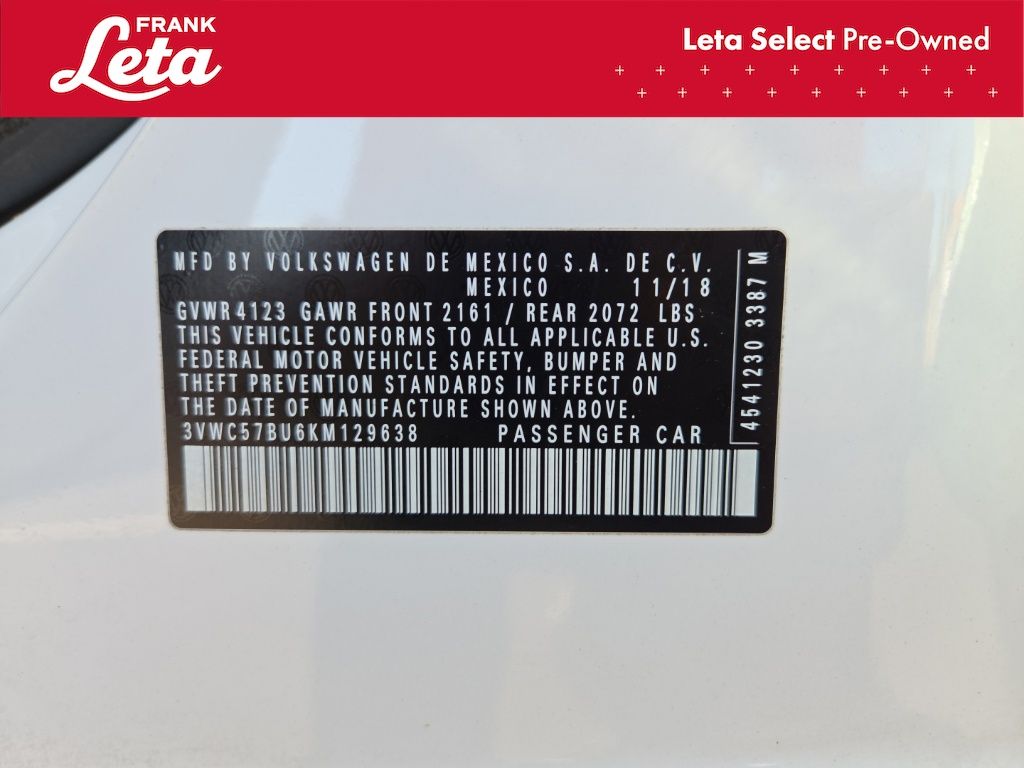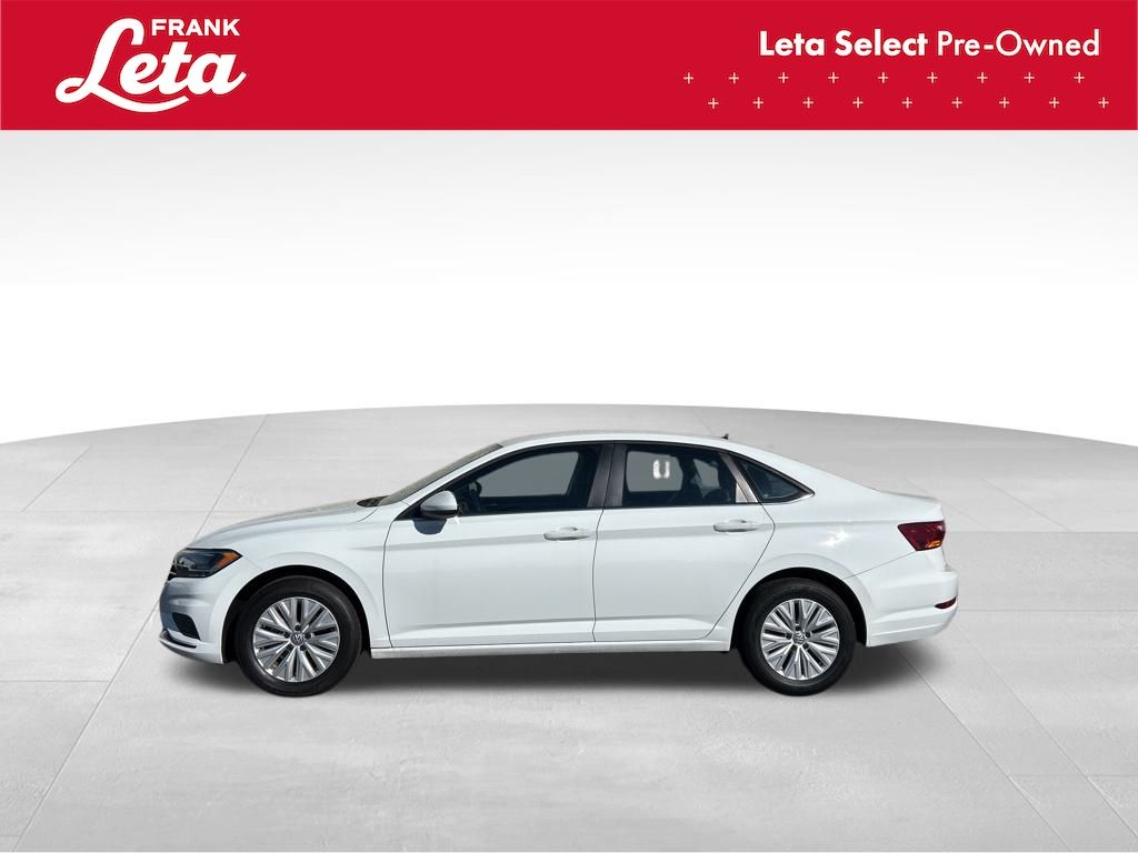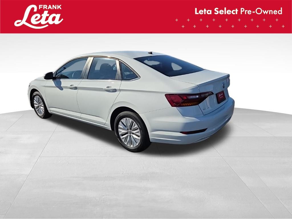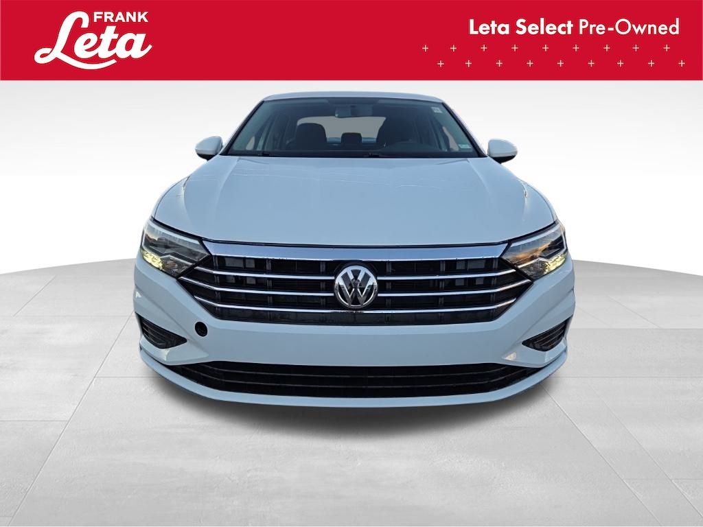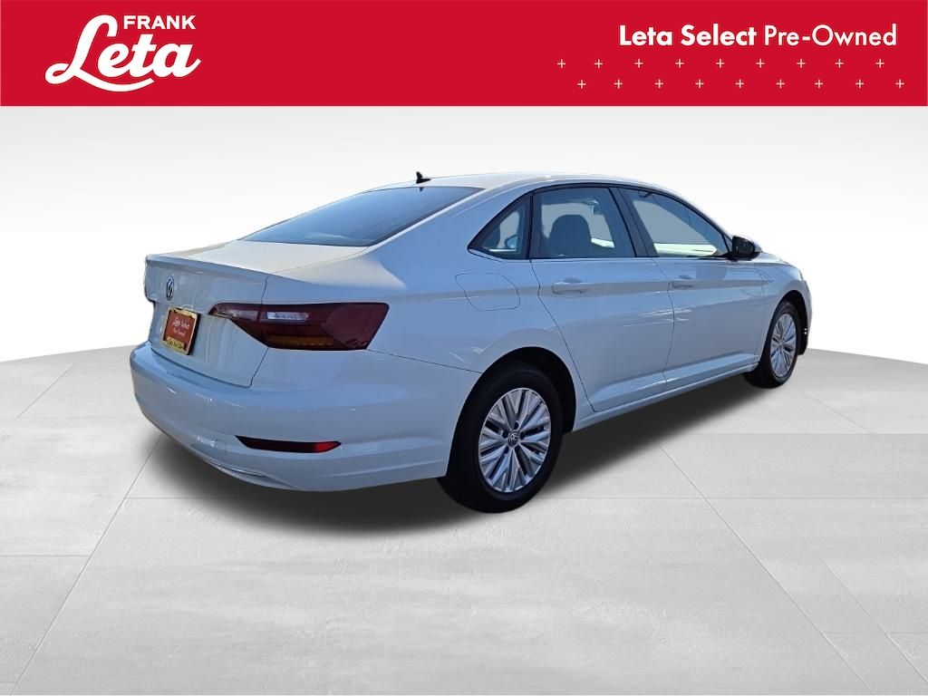 2019 Volkswagen Jetta 1.4T SE Pure White Jetta 1.4T SE, Frank Leta Select Certified, 1.4L TSI, Pure White, Titan Black w/Perforated V-Tex Leatherette Seat Trim, Exterior Parking Camera Rear, Front dual zone A/C, Fully automatic headlights, Heated front seats, Power moonroof, Wheels: 16" Two-Tone Rama Black, 4 Speakers, 4-Wheel Disc Brakes, ABS brakes, Air Conditioning, AM/FM radio, Automatic temperature control, Brake assist, Bumpers: body-color, Delay-off headlights, Driver door bin, Driver vanity mirror, Dual front impact airbags, Dual front side impact airbags, Electronic Stability Control, Front anti-roll bar, Front Bucket Seats, Front Center Armrest, Front reading lights, Front wheel independent suspension, Heated door mirrors, Heated Front Comfort Seats, Illuminated entry, Leather Shift Knob, Low tire pressure warning, Occupant sensing airbag, Outside temperature display, Overhead airbag, Overhead console, Panic alarm, Passenger door bin, Passenger vanity mirror, Perforated V-Tex Leatherette Seat Trim, Power door mirrors, Power steering, Power windows, Radio data system, Radio: Composition Color w/6.5" Touchscreen, Rear anti-roll bar, Rear reading lights, Rear seat center armrest, Rear window defroster, Remote keyless entry, Speed control, Speed-sensing steering, Split folding rear seat, Steering wheel mounted audio controls, Tachometer, Telescoping steering wheel, Tilt steering wheel, Traction control, Trip computer, Variably intermittent wipers, Jetta 1.4T SE, 1.4L TSI, Pure White, Titan Black w/Perforated V-Tex Leatherette Seat Trim, Exterior Parking Camera Rear, Front dual zone A/C, Fully automatic headlights, Heated front seats, Power moonroof, Wheels: 16" Two-Tone Rama Black. 1.4L TSI 8-Speed Automatic with Tiptronic FWD 4D Sedan 30/40 City/Highway MPG Awards: