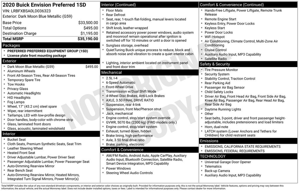 CARFAX One-Owner. 2020 Buick Envision Preferred Dark Moon Blue Metallic 3.50 Final Drive Axle Ratio, 4-Wheel Disc Brakes, 6 Speakers, 6-Speaker Audio System Feature, ABS brakes, Air Conditioning, Alloy wheels, AM/FM radio: SiriusXM, Apple CarPlay/Android Auto, Auto-dimming door mirrors, Auto-dimming Rear-View mirror, Automatic temperature control, Brake assist, Bumpers: body-color, Cloth w/Leatherette Seat Trim, Compass, Delay-off headlights, Driver 8-Way Power Seat Adjuster, Driver door bin, Driver vanity mirror, Dual front impact airbags, Dual front side impact airbags, Dual USB Charging-Only Ports, Dual USB Ports w/Single Auxiliary Input Jack, Electronic Stability Control, Emergency communication system: OnStar and Buick connected services capable, Exterior Parking Camera Rear, Four wheel independent suspension, Front anti-roll bar, Front Bucket Seats, Front Center Armrest, Front dual zone A/C, Front fog lights, Front Passenger 8-Way Power Seat Adjuster, Front reading lights, Fully automatic headlights, Garage door transmitter, Heated door mirrors, Heated Driver & Front Passenger Seats, Heated front seats, High-Intensity Discharge Headlights, Illuminated entry, Knee airbag, Leather Shift Knob, Low tire pressure warning, Occupant sensing airbag, Outside temperature display, Overhead airbag, Overhead console, Panic alarm, Passenger door bin, Passenger vanity mirror, Power door mirrors, Power driver seat, Power Liftgate, Power passenger seat, Power steering, Power windows, Preferred Equipment Group 1SD, Radio data system, Radio: Buick Infotainment System AM/FM Stereo, Rear anti-roll bar, Rear reading lights, Rear seat center armrest, Rear side impact airbag, Rear window defroster, Rear window wiper, Remote keyless entry, Security system, SiriusXM Radio, Speed control, Speed-sensing steering, Split folding rear seat, Spoiler, Steering wheel mounted audio controls, Tachometer, Telescoping steering wheel, Tilt steering wheel, Traction control, Trip computer, Turn signal indicator mirrors, Variably intermittent wipers, Wheels: 18" 10-Spoke Painted Aluminum. 2.5L 4-Cylinder DGI DOHC VVT 6-Speed Automatic FWD 4D Sport Utility 22/29 City/Highway MPG