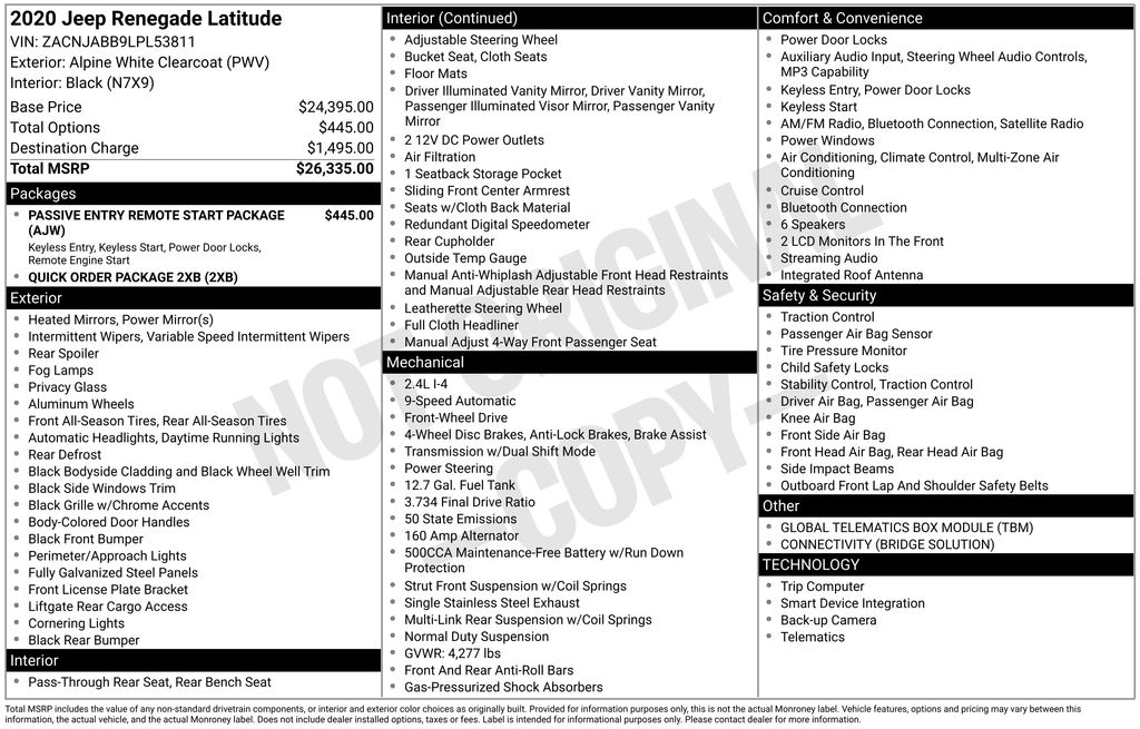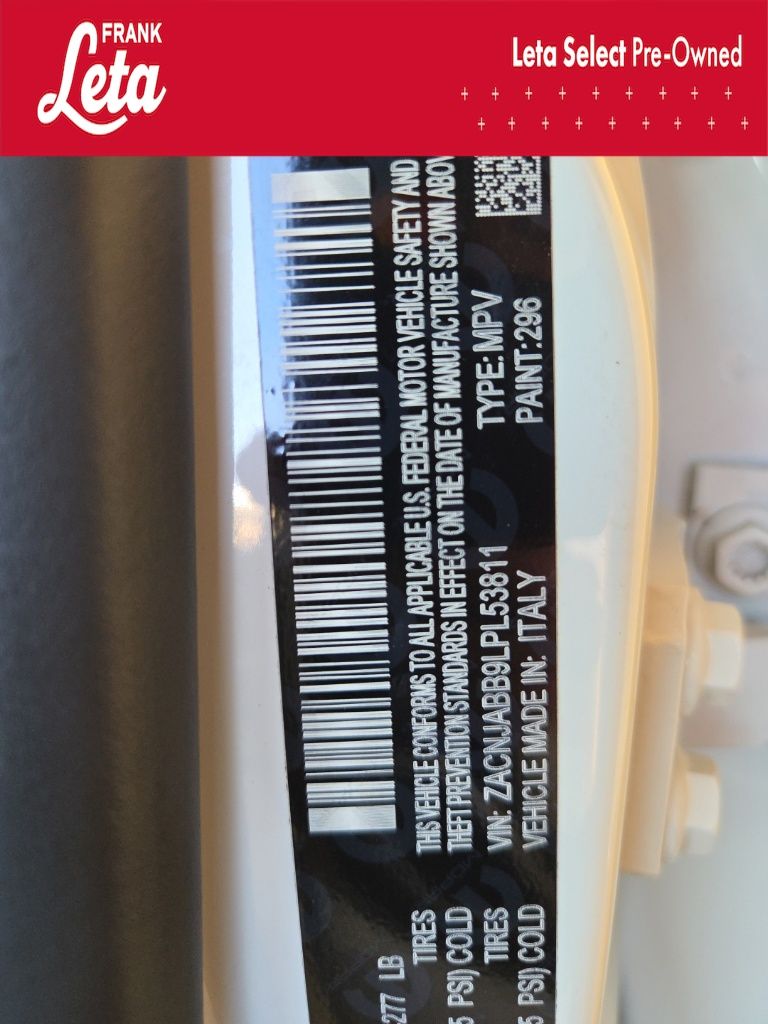 2020 Jeep Renegade Latitude Alpine White Clearcoat Renegade Latitude, Frank Leta Select Certified, 2.4L I4, 9-Speed 948TE Automatic, FWD, Alpine White Clearcoat, Black w/Cloth Low-Back Bucket Seats, 17" x 7.0" Aluminum Wheels, Apple CarPlay/Android Auto, Front dual zone A/C, Front fog lights, Fully automatic headlights, Keyless Entry w/Panic Alarm, ParkView Rear Back-Up Camera, Passive Entry Remote Start Package, 3.734 Final Drive Ratio, 4-Wheel Disc Brakes, 6 Speakers, ABS brakes, Air Conditioning, AM/FM radio: SiriusXM, Anti-whiplash front head restraints, Automatic temperature control, Brake assist, Compass, Connectivity (Bridge Solution) (DISC), Delay-off headlights, Driver door bin, Driver vanity mirror, Dual front impact airbags, Dual front side impact airbags, Electronic Stability Control, Emergency communication system, Four wheel independent suspension, Front anti-roll bar, Front Bucket Seats, Front Center Armrest, Front reading lights, Global Telematics Box Module (TBM) (DISC), Heated door mirrors, Illuminated entry, Knee airbag, Low tire pressure warning, Manual Adjust 4-Way Front Passenger Seat, Normal Duty Suspension, Occupant sensing airbag, Outside temperature display, Overhead airbag, Panic alarm, Passenger door bin, Passenger vanity mirror, Power door mirrors, Power steering, Power windows, Premium Cloth Bucket Seats, Quick Order Package 2XB, Radio data system, Radio: Uconnect 4 w/7" Display, Rear anti-roll bar, Rear window defroster, Rear window wiper, Remote keyless entry, Roof rack: rails only, Speed control, Split folding rear seat, Spoiler, Steering wheel mounted audio controls, Tachometer, Telescoping steering wheel, Tilt steering wheel, Traction control, Trip computer, Variably intermittent wipers, Voltmeter, Renegade Latitude, 2.4L I4, 9-Speed 948TE Automatic, FWD, Alpine White Clearcoat, Black w/Cloth Low-Back Bucket Seats, 17" x 7.0" Aluminum Wheels, Apple CarPlay/Android Auto, Front dual zone A/C, Front fog lights, Fully automatic headlights, Keyless Entry w/Panic Alarm, ParkView Rear Back-Up Camera, Passive Entry Remote Start Package. 2.4L I4 9-Speed 948TE Automatic FWD 4D Sport Utility 22/30 City/Highway MPG