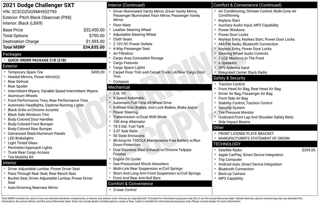 2021 Dodge Challenger SXT Pitch Black Clearcoat Challenger SE, 3.6L V6 24V VVT, 8-Speed Automatic, AWD, Pitch Black Clearcoat, Apple CarPlay, Apple CarPlay/Android Auto, Auto-dimming Rear-View mirror, Front dual zone A/C, Fully automatic headlights, Google Android Auto, ParkView Rear Back-Up Camera, Wheels: 20" x 8" Satin Carbon AWD, 4-Wheel Disc Brakes, 6 Speakers, ABS brakes, Air Conditioning, AM/FM radio, Anti-whiplash front head restraints, Automatic temperature control, Brake assist, Bumpers: body-color, Compass, Delay-off headlights, Driver door bin, Driver vanity mirror, Dual front impact airbags, Dual front side impact airbags, Electronic Stability Control, Four wheel independent suspension, Front anti-roll bar, Front Bucket Seats, Front Center Armrest, Front License Plate Bracket, Front reading lights, GPS Antenna Input, Heated door mirrors, Houndstooth Cloth Sport Seat, Illuminated entry, Integrated Center Stack Radio, Integrated Voice Command w/Bluetooth, Leather Shift Knob, Low tire pressure warning, Media Hub (2 USB, AUX), Outside temperature display, Overhead airbag, Overhead console, Panic alarm, Passenger door bin, Passenger vanity mirror, Power door mirrors, Power driver seat, Power steering, Power windows, Quick Order Package 21B, Radio data system, Radio: Uconnect 4 w/7" Display, Rear anti-roll bar, Rear reading lights, Rear seat center armrest, Rear window defroster, Remote keyless entry, Security system, SiriusXM Radio Service, SiriusXM Satellite Radio, Speed control, Speed-sensing steering, Split folding rear seat, Spoiler, Steering wheel mounted audio controls, Tachometer, Telescoping steering wheel, Tilt steering wheel, Traction control, Trip computer, USB Host Flip, Variably intermittent wipers, Challenger SE, 3.6L V6 24V VVT, 8-Speed Automatic, AWD, Pitch Black Clearcoat, Apple CarPlay, Apple CarPlay/Android Auto, Auto-dimming Rear-View mirror, Front dual zone A/C, Fully automatic headlights, Google Android Auto, ParkView Rear Back-Up Camera, Wheels: 20" x 8" Satin Carbon AWD. 3.6L V6 24V VVT 8-Speed Automatic AWD 2D Coupe 18/27 City/Highway MPG