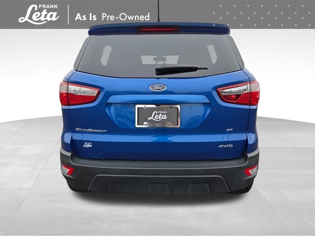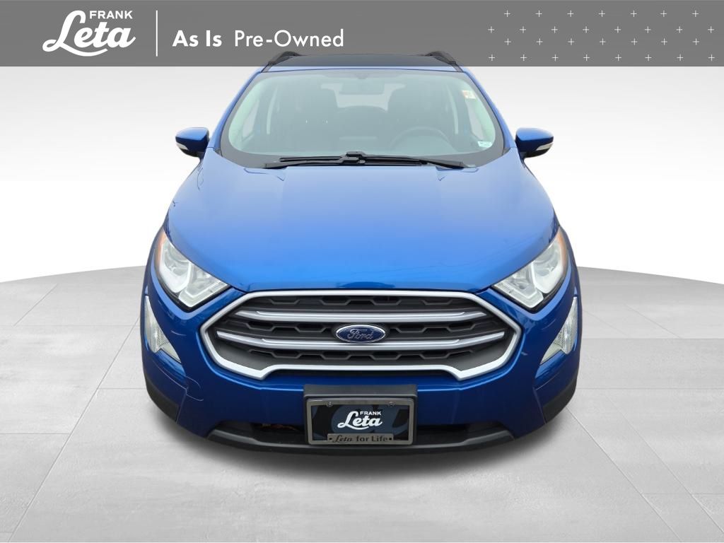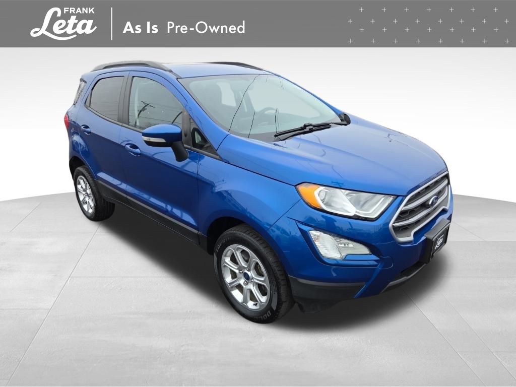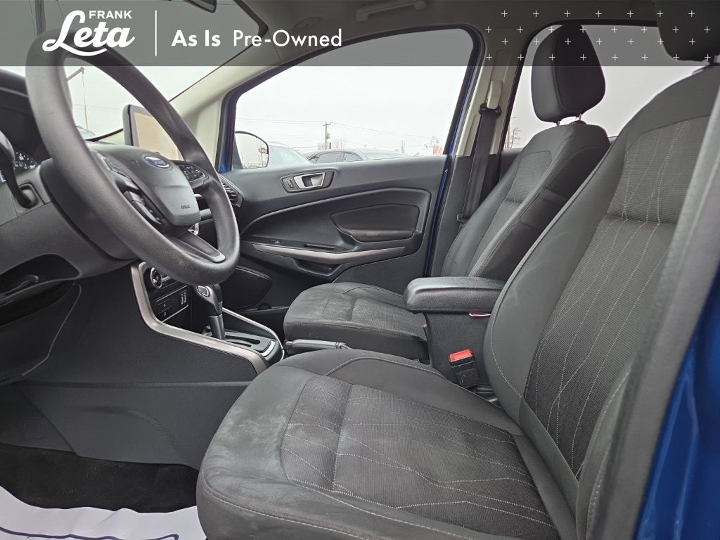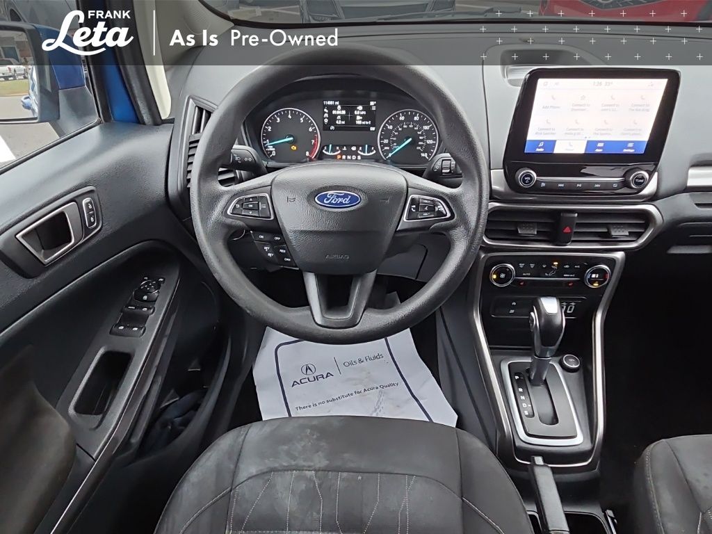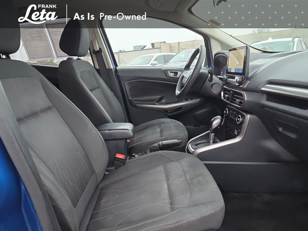 CARFAX One-Owner. 2021 Ford EcoSport SE Lightning Blue EcoSport SE, 2.0L I4 Ti-VCT GDI, 4WD, Lightning Blue, Ebony Black w/Unique Cloth Heated Front Bucket Seats or Unique Cloth Heated Front Bucket Seats w/47A, AppLink/Apple CarPlay and Android Auto, Exterior Parking Camera Rear, Front fog lights, Fully automatic headlights, Heated front seats, Power moonroof, Rear Parking Sensors, Wheels: 16" Shadow Silver-Painted Aluminum, 3.51 Axle Ratio, 4-Wheel Disc Brakes, 6 Speakers, ABS brakes, Air Conditioning, AM/FM radio: SiriusXM, Automatic temperature control, Brake assist, Bumpers: body-color, Compass, Delay-off headlights, Driver door bin, Driver vanity mirror, Dual front impact airbags, Dual front side impact airbags, Electronic Stability Control, Emergency communication system: SYNC 3 911 Assist, Equipment Group 200A, Front anti-roll bar, Front Bucket Seats, Front Center Armrest, Front reading lights, Front wheel independent suspension, Illuminated entry, Knee airbag, Leather Shift Knob, Low tire pressure warning, Occupant sensing airbag, Outside temperature display, Overhead airbag, Overhead console, Panic alarm, Passenger door bin, Passenger vanity mirror, Power door mirrors, Power steering, Power windows, Radio data system, Radio: AM/FM/MP3 Stereo, Rear anti-roll bar, Rear seat center armrest, Rear side impact airbag, Rear window defroster, Rear window wiper, Remote keyless entry, Roof rack: rails only, SiriusXM Radio, Speed control, Speed-sensing steering, Split folding rear seat, Steering wheel mounted audio controls, SYNC 3 Communications & Entertainment System, Tachometer, Telescoping steering wheel, Tilt steering wheel, Traction control, Trip computer, Turn signal indicator mirrors, Unique Cloth Heated Front Bucket Seats, Variably intermittent wipers, EcoSport SE, 2.0L I4 Ti-VCT GDI, 4WD, Lightning Blue, Ebony Black w/Unique Cloth Heated Front Bucket Seats or Unique Cloth Heated Front Bucket Seats w/47A, AppLink/Apple CarPlay and Android Auto, Exterior Parking Camera Rear, Front fog lights, Fully automatic headlights, Heated front seats, Power moonroof, Rear Parking Sensors, Wheels: 16" Shadow Silver-Painted Aluminum. 2.0L I4 Ti-VCT GDI 6-Speed Automatic 4WD 4D Sport Utility 23/29 City/Highway MPG