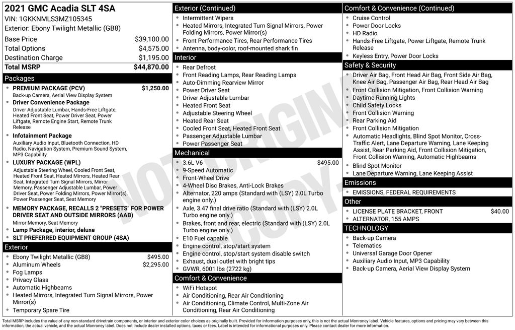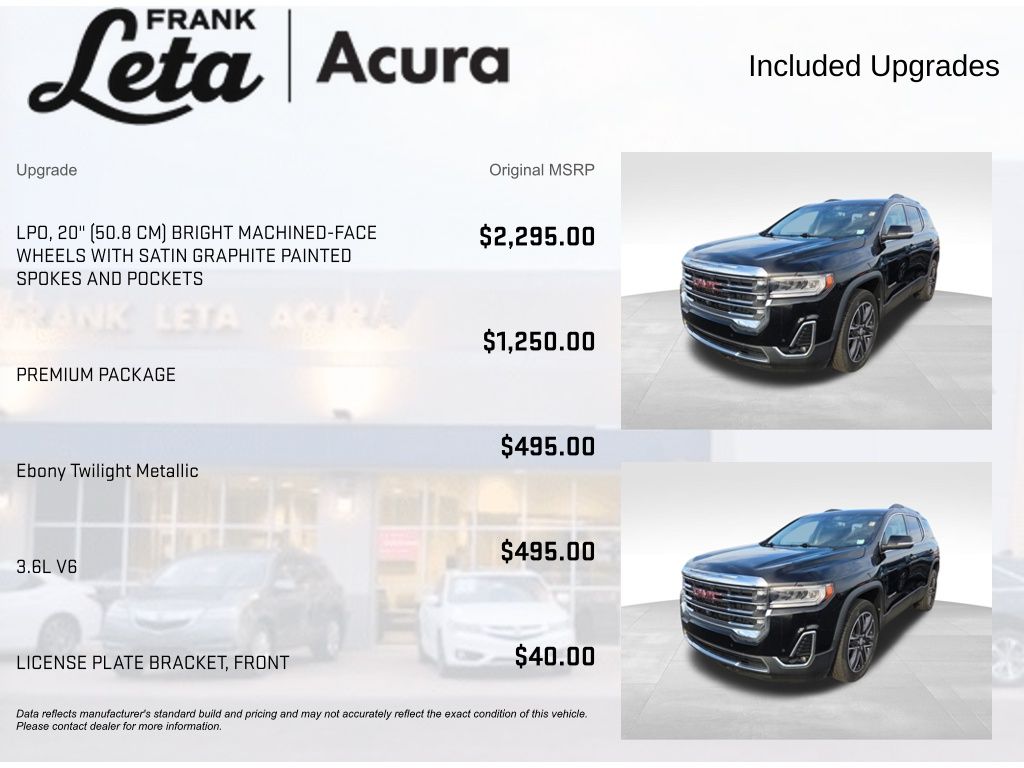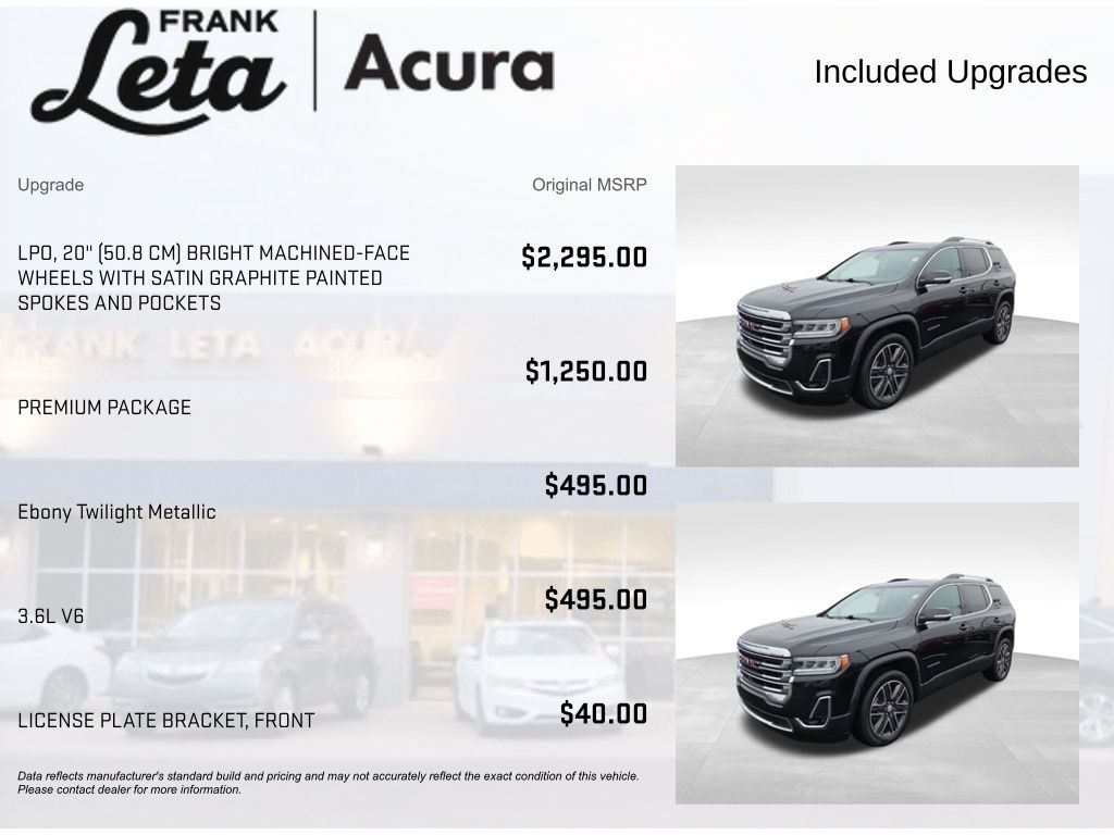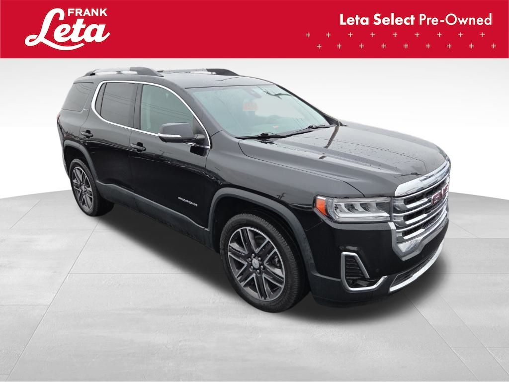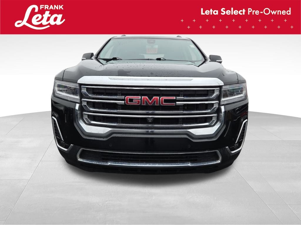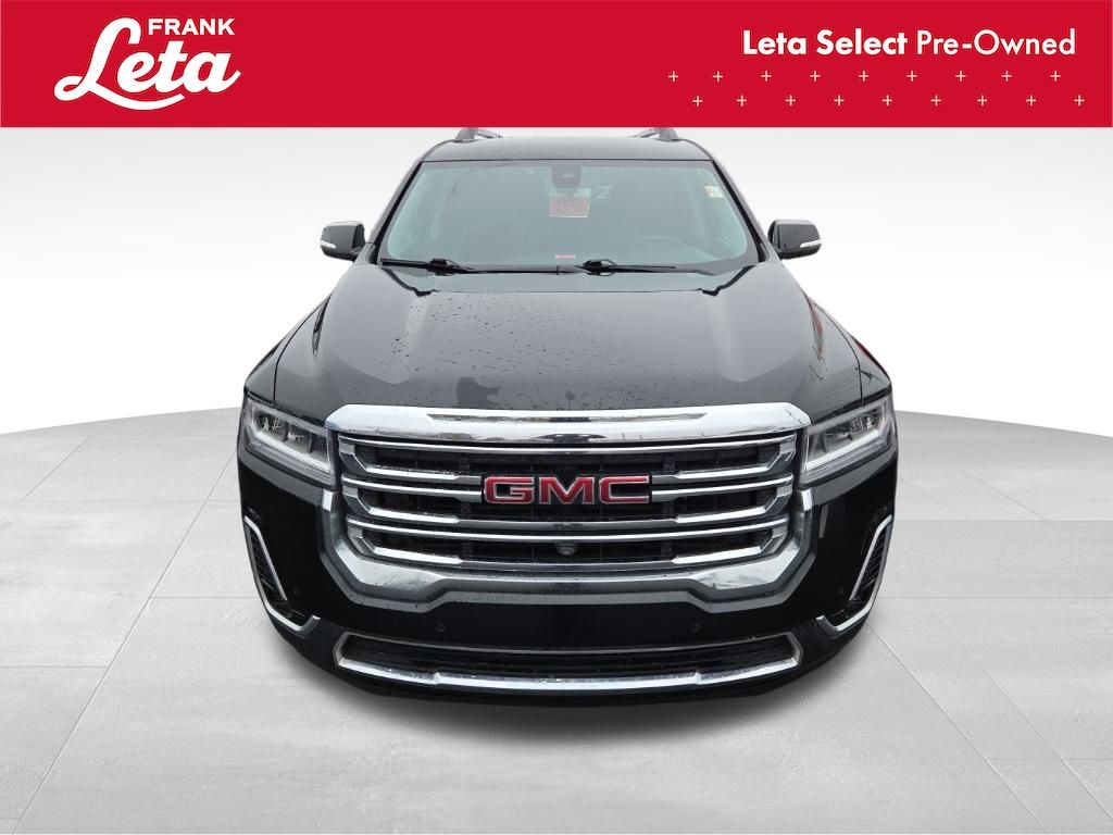 2021 GMC Acadia SLT Ebony Twilight Metallic Acadia SLT, Frank Leta Select Certified, 3.6L V6 SIDI, FWD, Ebony Twilight Metallic, Jet Black w/Perforated Leather-Appointed Seat Trim, 3rd row seats: split-bench, Apple CarPlay/Android Auto, Auto-dimming Rear-View mirror, Front dual zone A/C, Front fog lights, Fully automatic headlights, Garage door transmitter, Heated & Ventilated Driver & Front Passenger Seats, Heated front seats, Navigation System, Power Liftgate, Rear air conditioning, Wheels: 20" Bright Machined-Face (LPO), Wireless Apple CarPlay/Wireless Android Auto, 155 Amp Alternator, 4-Way Manual Passenger Seat Adjuster, 4-Wheel Disc Brakes, 6-Passenger (2-2-2 Seating Configuration), 8 Speakers, 8-Way Power Driver Seat Adjuster, 8-Way Power Passenger Seat Adjuster, ABS brakes, Air Conditioning, AM/FM radio: SiriusXM with 360L, Auto High-beam Headlights, Automatic temperature control, Bose Premium 8-Speaker Audio System Feature, Brake assist, Bumpers: body-color, Compass, Delay-off headlights, Driver door bin, Driver vanity mirror, Dual front impact airbags, Dual front side impact airbags, Electronic Stability Control, Emergency communication system: OnStar and GMC connected services capable, Four wheel independent suspension, Front anti-roll bar, Front Bucket Seats, Front Center Armrest, Front License Plate Bracket, Front reading lights, HD Radio, HD Surround Vision, Heated door mirrors, Heated Driver & Front Passenger Seats, Heated Rear Outboard Seating Positions, Illuminated entry, Knee airbag, Low tire pressure warning, Luxury Package, Memory Package, Occupant sensing airbag, Outside temperature display, Overhead airbag, Overhead console, Panic alarm, Passenger door bin, Passenger vanity mirror, Perforated Leather-Appointed Seat Trim, Power door mirrors, Power Driver Lumbar Control Seat Adjuster, Power driver seat, Power Passenger Lumbar Control Seat Adjuster, Power steering, Power Tilt & Telescopic Steering Column, Power windows, Power-Adjustable Body-Color Outside Heated Mirrors, Preferred Equipment Group 4SA, Premium audio system: GMC Infotainment System, Premium Package (DISC), Radio data system, Radio: AM/FM 8" Diagonal Multi-Touch Navigation, Rear anti-roll bar, Rear reading lights, Rear window defroster, Rear window wiper, Remote keyless entry, Roof rack: rails only, Security system, SiriusXM w/360L, Speed control, Speed-sensing steering, Spoiler, Steering wheel mounted audio controls, Tachometer, Telescoping steering wheel, Tilt steering wheel, Traction control, Trip computer, Turn signal indicator mirrors, Variably intermittent wipers, Voltmeter, Wheels: 20" x 8" Transit, Acadia SLT, 3.6L V6 SIDI, FWD, Ebony Twilight Metallic, Jet Black w/Perforated Leather-Appointed Seat Trim, 3rd row seats: split-bench, Apple CarPlay/Android Auto, Auto-dimming Rear-View mirror, Front dual zone A/C, Front fog lights, Fully automatic headlights, Garage door transmitter, Heated & Ventilated Driver & Front Passenger Seats, Heated front seats, Navigation System, Power Liftgate, Rear air conditioning, Wheels: 20" Bright Machined-Face (LPO), Wireless Apple CarPlay/Wireless Android Auto. 3.6L V6 SIDI 9-Speed Automatic FWD 4D Sport Utility 19/27 City/Highway MPG