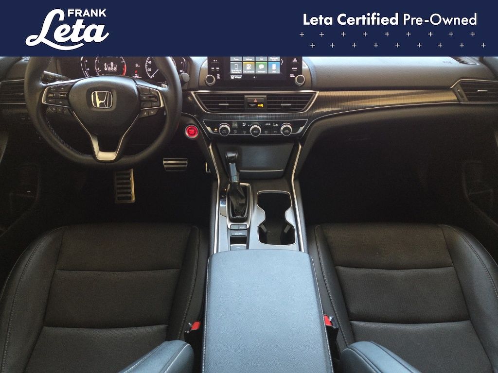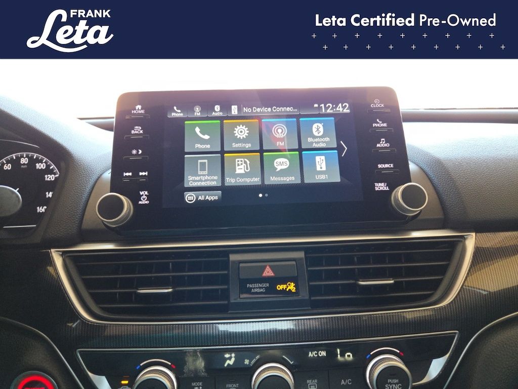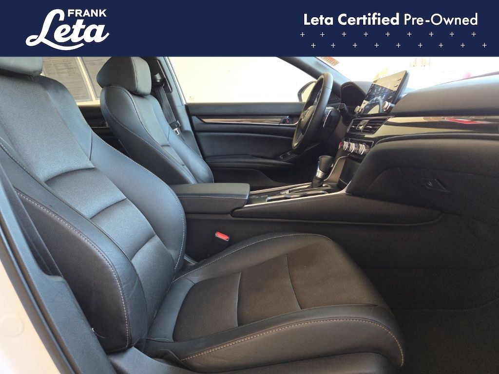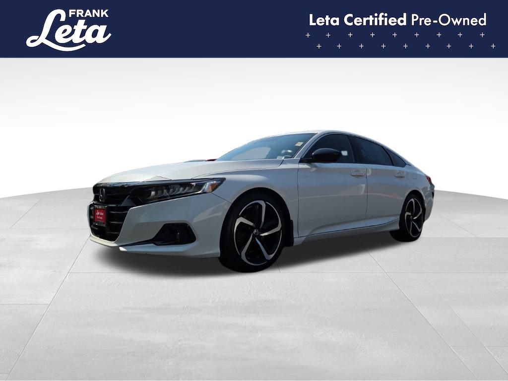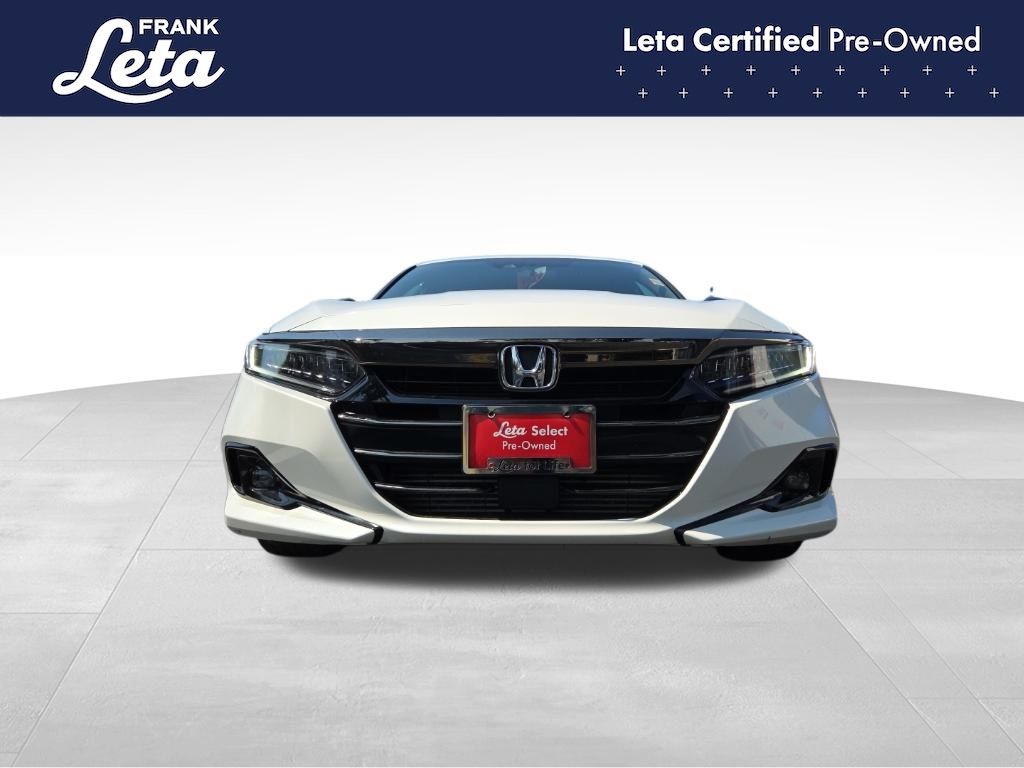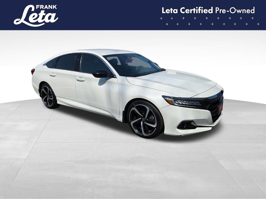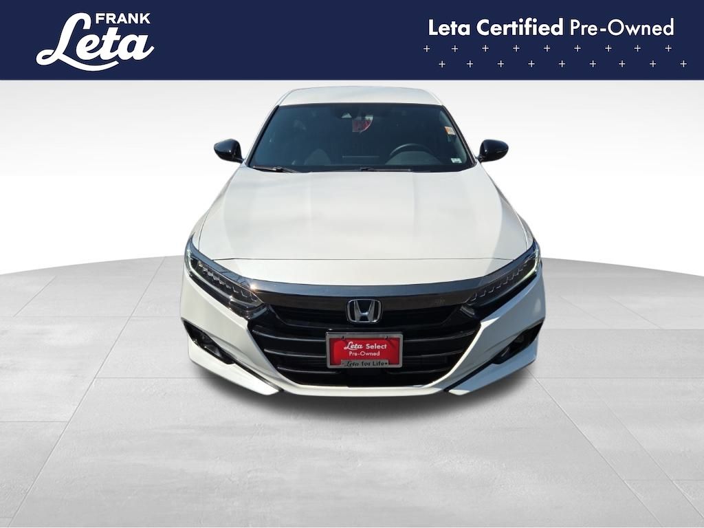 CARFAX One-Owner. 2021 Honda Accord Sport Platinum White Pearl Accord Sport, Frank Leta Certified Certified, 1.5T I4 DOHC 16V Turbocharged VTEC, FWD, Platinum White Pearl, Black w/Cloth Seat Trim, Adaptive Cruise Control: Adaptive Cruise Control (ACC) with Low-Speed Follow, Apple CarPlay/Android Auto, Brake assist, Exterior Parking Camera Rear, Forward collision: Collision Mitigation Braking System (CMBS) + FCW mitigation, Front dual zone A/C, Front fog lights, Fully automatic headlights, Lane Departure Warning System, Wheels: 19" Machine-Finished Alloy w/Black Inserts, 4-Wheel Disc Brakes, 8 Speakers, ABS brakes, Air Conditioning, AM/FM radio, Auto High-beam Headlights, Automatic temperature control, Bumpers: body-color, Cloth Seat Trim, Delay-off headlights, Driver door bin, Driver vanity mirror, Dual front impact airbags, Dual front side impact airbags, Electronic Stability Control, Emergency communication system: HondaLink, Four wheel independent suspension, Front anti-roll bar, Front Bucket Seats, Front Center Armrest, Front reading lights, Illuminated entry, Knee airbag, Leather Shift Knob, Leather steering wheel, Low tire pressure warning, Occupant sensing airbag, Outside temperature display, Overhead airbag, Overhead console, Panic alarm, Passenger door bin, Passenger vanity mirror, Power door mirrors, Power driver seat, Power steering, Power windows, Radio data system, Radio: 180-Watt AM/FM Audio System, Rear anti-roll bar, Rear seat center armrest, Rear window defroster, Remote keyless entry, Security system, Speed control, Speed-sensing steering, Speed-Sensitive Wipers, Split folding rear seat, Spoiler, Steering wheel mounted audio controls, Tachometer, Telescoping steering wheel, Tilt steering wheel, Traction control, Trip computer, Variably intermittent wipers, Accord Sport, 1.5T I4 DOHC 16V Turbocharged VTEC, FWD, Platinum White Pearl, Black w/Cloth Seat Trim, Adaptive Cruise Control: Adaptive Cruise Control (ACC) with Low-Speed Follow, Apple CarPlay/Android Auto, Brake assist, Exterior Parking Camera Rear, Forward collision: Collision Mitigation Braking System (CMBS) + FCW mitigation, Front dual zone A/C, Front fog lights, Fully automatic headlights, Lane Departure Warning System, Wheels: 19" Machine-Finished Alloy w/Black Inserts. 1.5T I4 DOHC 16V Turbocharged VTEC CVT FWD 4D Sedan 29/35 City/Highway MPG