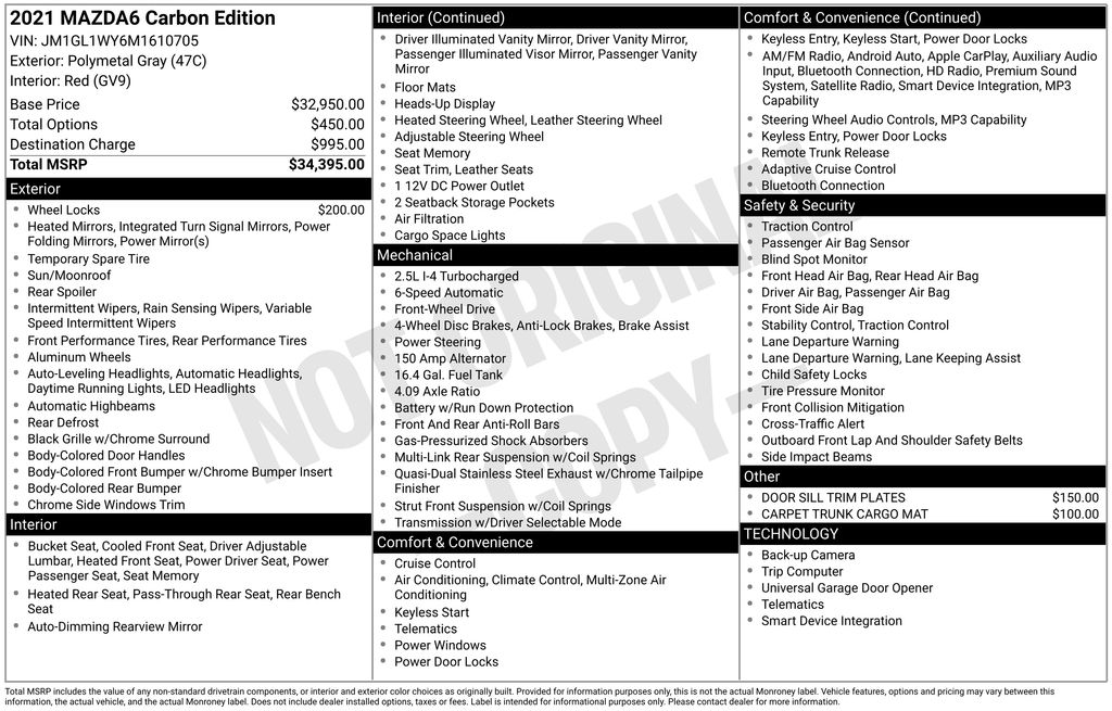 With its impressive list of features, exceptional fuel efficiency, and refined driving dynamics, this 2021 Mazda Mazda6 Carbon Edition is a must-see for any discerning car buyer. We invite you to experience the difference for yourself by scheduling a test drive at our showroom. This exceptional vehicle won't last long, so don't miss your chance to make it your own.