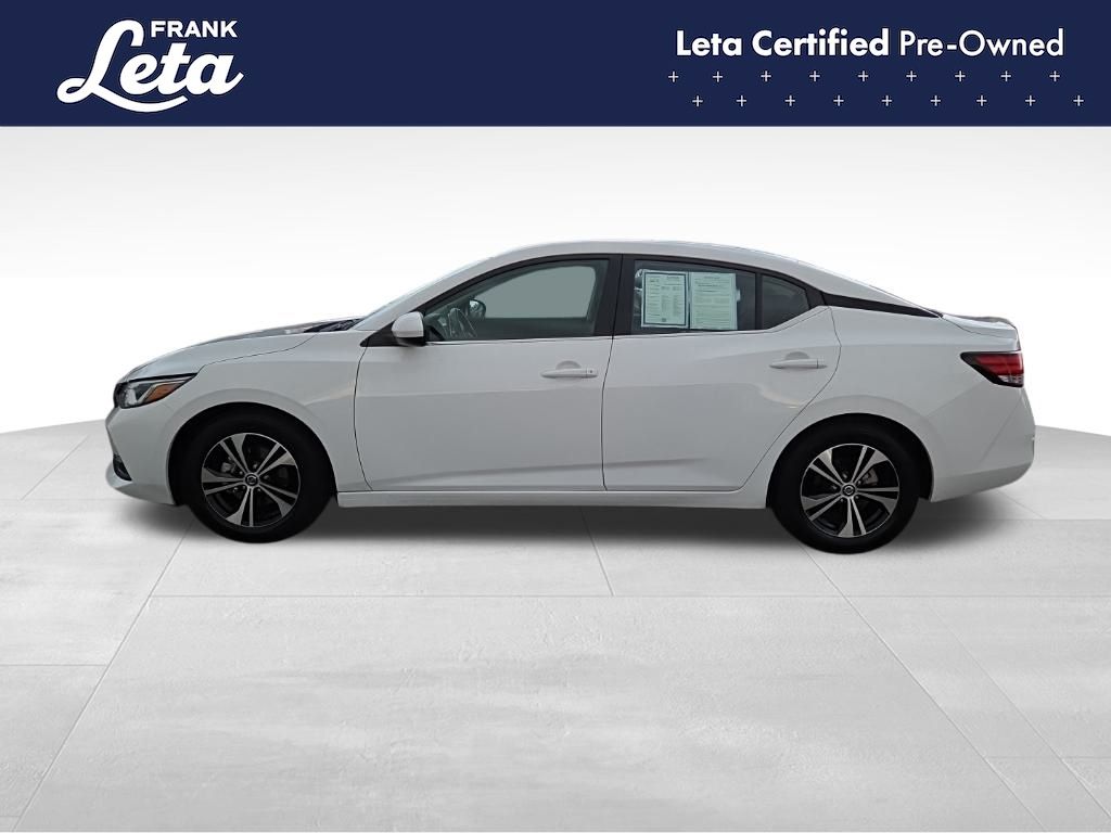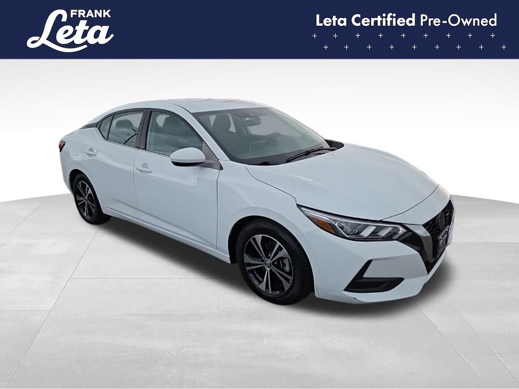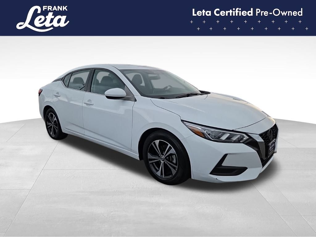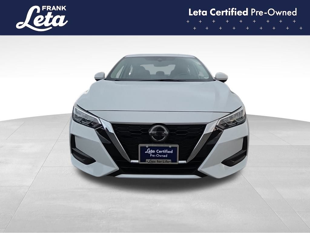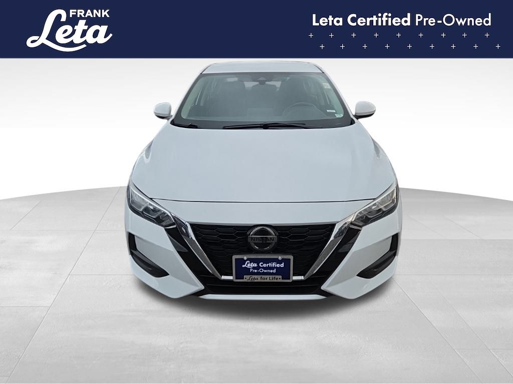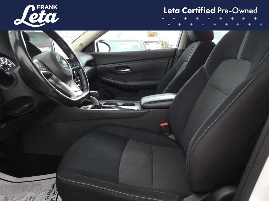 CARFAX One-Owner. 2021 Nissan Sentra SV Fresh Powder Sentra SV, Frank Leta Certified Certified, 2.0L DOHC, CVT with Xtronic, Fresh Powder, Charcoal Cloth, 16" Alloy Wheels, Blind Spot Warning, Front dual zone A/C, Fully automatic headlights, NissanConnect featuring Apple CarPlay and Android Auto, Rear Parking Sensors, 4-Wheel Disc Brakes, 6 Speakers, ABS brakes, Air Conditioning, AM/FM radio: SiriusXM, Auto High-beam Headlights, Automatic temperature control, Brake assist, Bumpers: body-color, Delay-off headlights, Driver door bin, Driver vanity mirror, Dual front impact airbags, Dual front side impact airbags, Electronic Stability Control, Four wheel independent suspension, Front anti-roll bar, Front Bucket Seats, Front Center Armrest, Front reading lights, Heated door mirrors, Illuminated entry, Knee airbag, Low tire pressure warning, Occupant sensing airbag, Outside temperature display, Overhead airbag, Overhead console, Panic alarm, Passenger door bin, Passenger vanity mirror, Power door mirrors, Power steering, Power windows, Radio data system, Radio: AM/FM w/RDS/MP3/Aux-In, Rear anti-roll bar, Rear seat center armrest, Rear side impact airbag, Rear window defroster, Remote keyless entry, Security system, Speed control, Speed-sensing steering, Split folding rear seat, Steering wheel mounted audio controls, Tachometer, Telescoping steering wheel, Tilt steering wheel, Traction control, Trip computer, Upgraded Cloth Seat Trim, Variably intermittent wipers, Sentra SV, 2.0L DOHC, CVT with Xtronic, Fresh Powder, Charcoal Cloth, 16" Alloy Wheels, Blind Spot Warning, Front dual zone A/C, Fully automatic headlights, NissanConnect featuring Apple CarPlay and Android Auto, Rear Parking Sensors. 2.0L DOHC CVT with Xtronic FWD 4D Sedan 29/39 City/Highway MPG Awards: