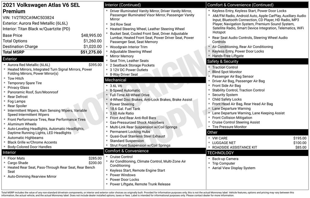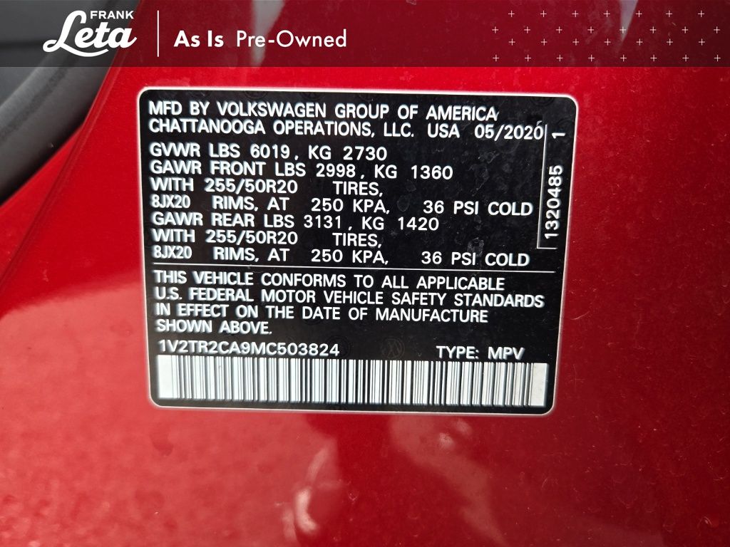 2021 Volkswagen Atlas SEL Premium Red Metallic Atlas SEL Premium, 3.6L V6, 8-Speed Automatic with Tiptronic, AWD, Red Metallic, Titan Black W/Quartzite Leather, 12 Speakers, 3rd row seats: split-bench, Auto-dimming Rear-View mirror, Front dual zone A/C, Front fog lights, Fully automatic headlights, Heated front seats, Heated rear seats, Heated steering wheel, Htd/Actively Ventilated Comfort Front Sport Seats, Memory seat, Navigation System, Power Liftgate, Power moonroof, Rear air conditioning, Ventilated front seats, Wheels: 20" 5-Spoke 2-Tone Machined Alloy, 3.60 Axle Ratio, 4-Wheel Disc Brakes, ABS brakes, Active Blind Spot Monitor, Air Conditioning, AM/FM radio: SiriusXM, Auto High-beam Headlights, Automatic temperature control, Brake assist, Bumpers: body-color, Compass, Delay-off headlights, Driver door bin, Driver vanity mirror, Dual front impact airbags, Dual front side impact airbags, Electronic Stability Control, Emergency communication system: VW Car-Net services (capabilities require enrollment or subscription), Four wheel independent suspension, Front anti-roll bar, Front Bucket Seats, Front Center Armrest, Front reading lights, Heated door mirrors, Heavy Duty Trunk Liner w/VW CarGo Blocks, Illuminated entry, Leather Shift Knob, Low tire pressure warning, Luggage Net, Occupant sensing airbag, Outside temperature display, Overhead airbag, Overhead console, Panic alarm, Passenger door bin, Passenger vanity mirror, Perforated Vienna Leather Seating Surfaces, Power door mirrors, Power driver seat, Power passenger seat, Power steering, Power windows, Privacy Cover, Radio data system, Rain sensing wipers, Rear anti-roll bar, Rear audio controls, Rear reading lights, Rear seat center armrest, Rear window defroster, Rear window wiper, Remote CD player, Remote keyless entry, Roadside Assistance Kit, Roof rack: rails only, Rubber Mats Kit - Bench Seat, Security system, Speed control, Speed-sensing steering, Split folding rear seat, Spoiler, Standard Suspension, Steering wheel mounted audio controls, Tachometer, Telescoping steering wheel, Tilt steering wheel, Traction control, Trip computer, Turn signal indicator mirrors, Variably intermittent wipers, Atlas SEL Premium, 3.6L V6, 8-Speed Automatic with Tiptronic, AWD, Red Metallic, Titan Black W/Quartzite Leather, 12 Speakers, 3rd row seats: split-bench, Auto-dimming Rear-View mirror, Front dual zone A/C, Front fog lights, Fully automatic headlights, Heated front seats, Heated rear seats, Heated steering wheel, Htd/Actively Ventilated Comfort Front Sport Seats, Memory seat, Navigation System, Power Liftgate, Power moonroof, Rear air conditioning, Ventilated front seats, Wheels: 20" 5-Spoke 2-Tone Machined Alloy. 3.6L V6 8-Speed Automatic with Tiptronic AWD 4D Sport Utility