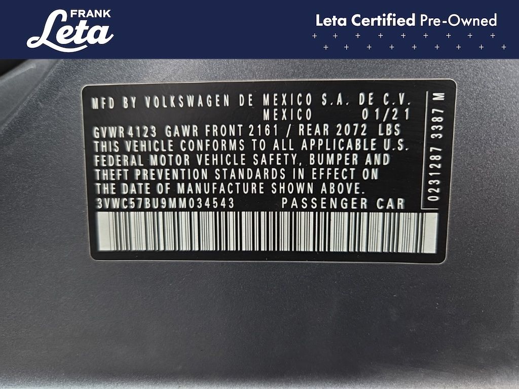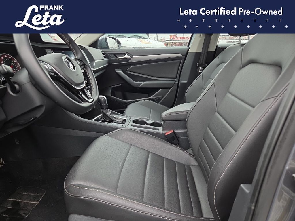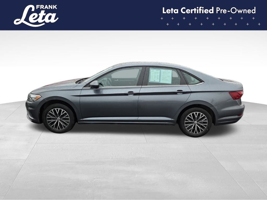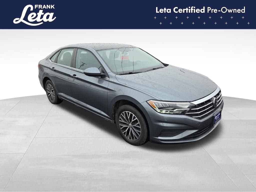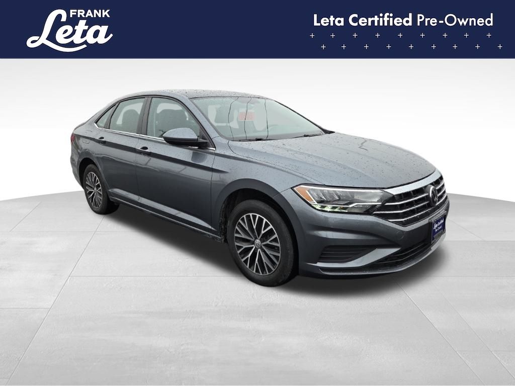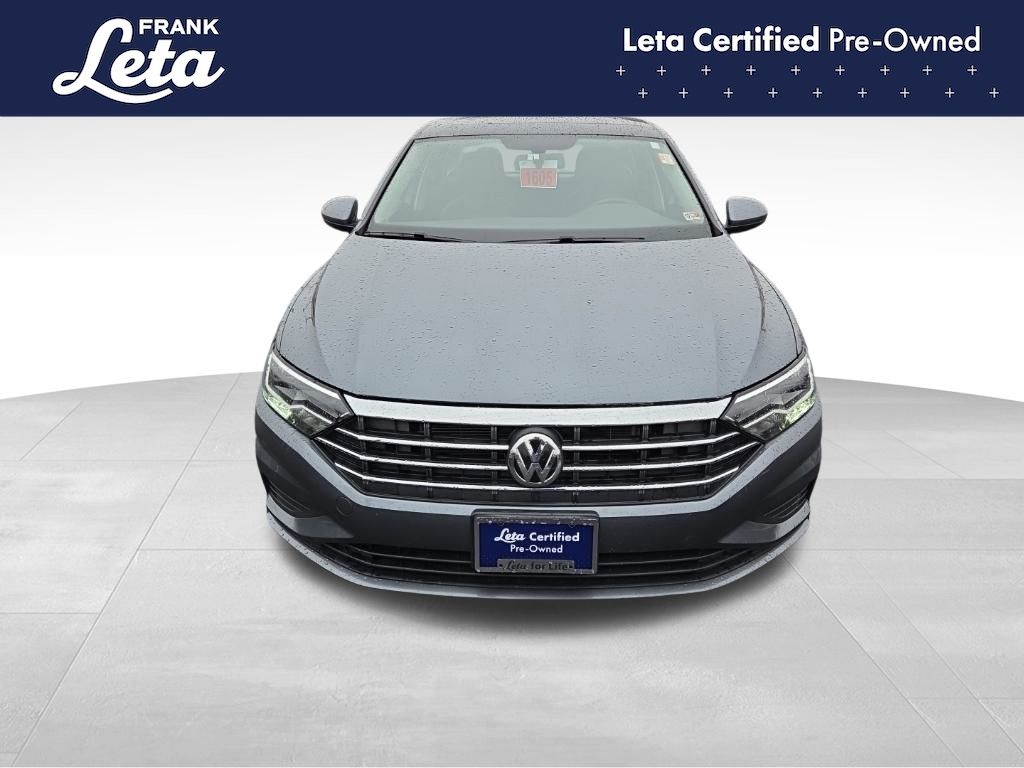2021 Volkswagen Jetta 1.4T SE Platinum Gray Metallic Jetta 1.4T SE, Frank Leta Certified Certified, 1.4L TSI, Platinum Gray Metallic, Titan Black w/Perforated V-Tex Leatherette Seat Trim, Exterior Parking Camera Rear, Front dual zone A/C, Fully automatic headlights, Heated door mirrors, Heated Front Comfort Sport Seats, Heated front seats, Power moonroof: Panoramic, Wheels: 16" 2-Tone Machined Alloy, 4 Speakers, 4-Wheel Disc Brakes, ABS brakes, Air Conditioning, AM/FM radio, Automatic temperature control, Brake assist, Bumpers: body-color, Delay-off headlights, Driver door bin, Driver vanity mirror, Dual front impact airbags, Dual front side impact airbags, Electronic Stability Control, Emergency communication system: VW Car-Net services (capabilities require enrollment or subscription), Front anti-roll bar, Front Bucket Seats, Front Center Armrest, Front reading lights, Front wheel independent suspension, Illuminated entry, Leather Shift Knob, Low tire pressure warning, Occupant sensing airbag, Outside temperature display, Overhead airbag, Overhead console, Panic alarm, Passenger door bin, Passenger vanity mirror, Perforated V-Tex Leatherette Seat Trim, Power door mirrors, Power driver seat, Power steering, Power windows, Radio data system, Radio: Composition Color w/6.5" Touchscreen, Rear anti-roll bar, Rear reading lights, Rear seat center armrest, Rear window defroster, Remote keyless entry, Speed control, Speed-sensing steering, Split folding rear seat, Steering wheel mounted audio controls, Tachometer, Telescoping steering wheel, Tilt steering wheel, Traction control, Trip computer, Variably intermittent wipers, Jetta 1.4T SE, 1.4L TSI, Platinum Gray Metallic, Titan Black w/Perforated V-Tex Leatherette Seat Trim, Exterior Parking Camera Rear, Front dual zone A/C, Fully automatic headlights, Heated door mirrors, Heated Front Comfort Sport Seats, Heated front seats, Power moonroof: Panoramic, Wheels: 16" 2-Tone Machined Alloy. 1.4L TSI 8-Speed Automatic FWD 4D Sedan 29/39 City/Highway MPG
