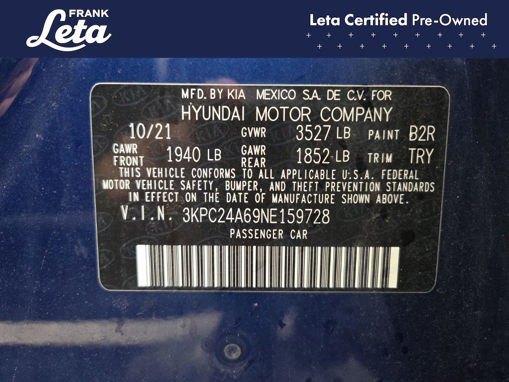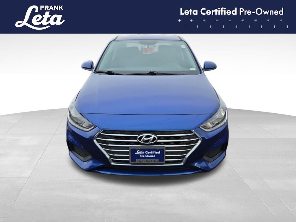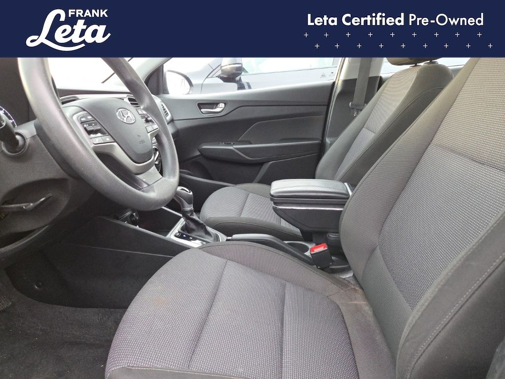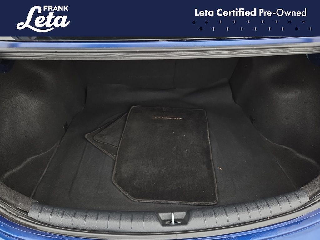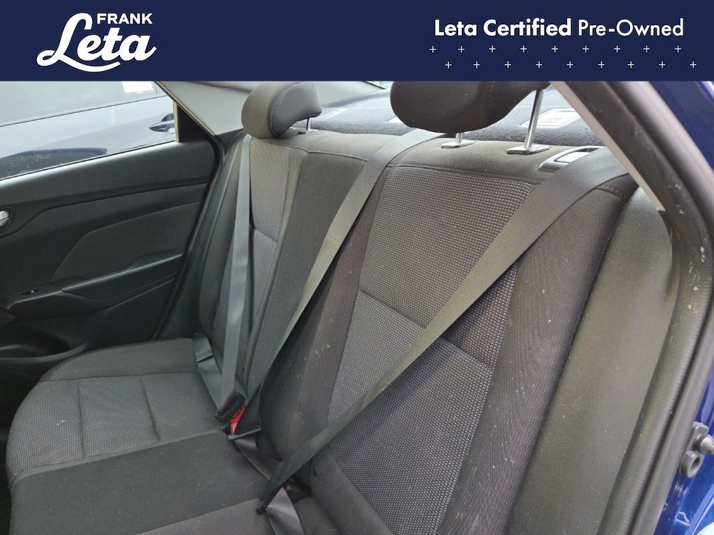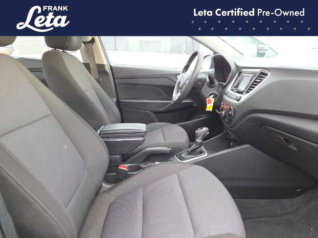 2022 Hyundai Accent SE Admiral Blue Pearl Accent SE, Frank Leta Certified Certified, 1.6L I4 PDI DOHC 16V LEV3-ULEV125 120hp, FWD, Admiral Blue Pearl, Black Cloth, Exterior Parking Camera Rear, 4 Speakers, ABS brakes, Air Conditioning, AM/FM radio, Anti-whiplash front head restraints, Brake assist, Bumpers: body-color, Carpeted Floor Mats, Cloth Seat Trim, Driver door bin, Driver vanity mirror, Dual front impact airbags, Dual front side impact airbags, Dual USB Charger, Electronic Stability Control, Front anti-roll bar, Front Bucket Seats, Front reading lights, Front wheel independent suspension, Illuminated entry, Low tire pressure warning, Occupant sensing airbag, Option Group 01, Outside temperature display, Overhead airbag, Overhead console, Panic alarm, Passenger door bin, Passenger vanity mirror, Power door mirrors, Power steering, Power windows, Radio: Audio 4.0B AM/FM, Rear window defroster, Remote keyless entry, Security system, Speed control, Speed-sensing steering, Split folding rear seat, Steering wheel mounted audio controls, Tachometer, Tilt steering wheel, Traction control, Trip computer, Wheels: 5.5J x 15" Steel w/Covers, Accent SE, 1.6L I4 PDI DOHC 16V LEV3-ULEV125 120hp, FWD, Admiral Blue Pearl, Black Cloth, Exterior Parking Camera Rear. 1.6L I4 PDI DOHC 16V LEV3-ULEV125 120hp CVT FWD 4D Sedan 33/41 City/Highway MPG