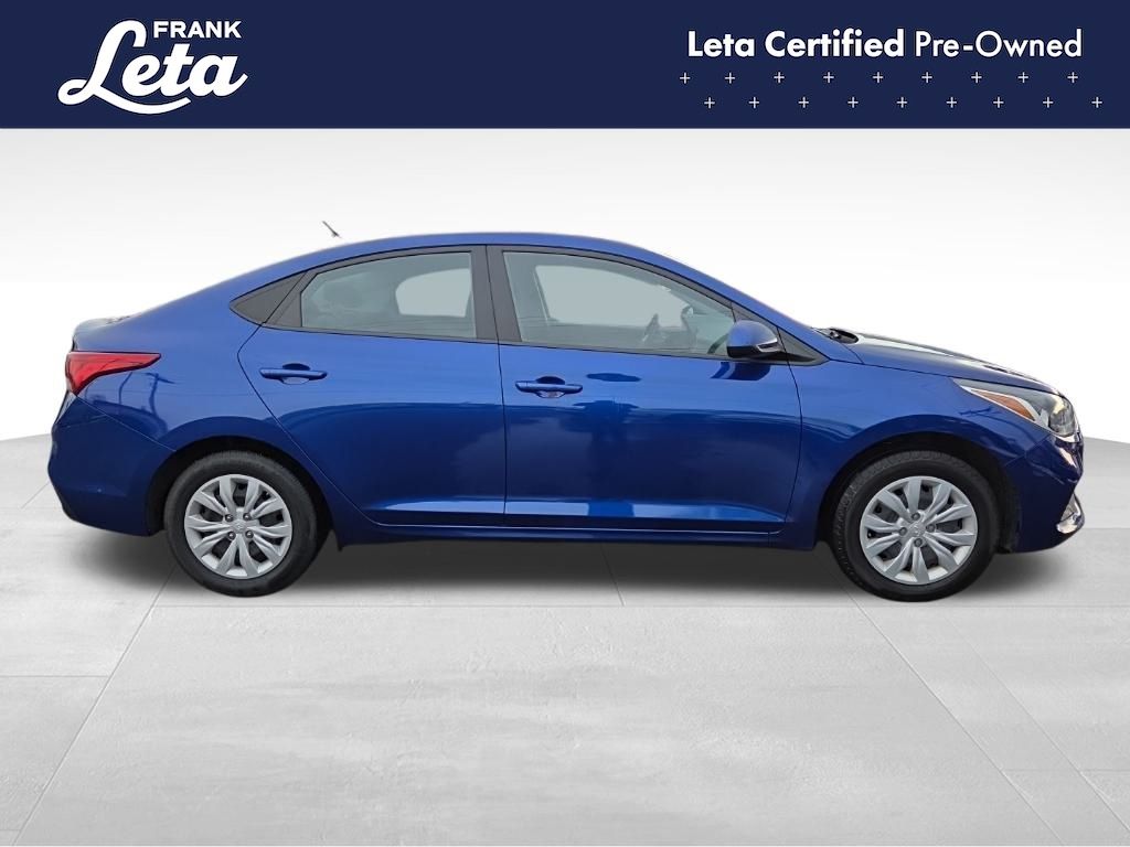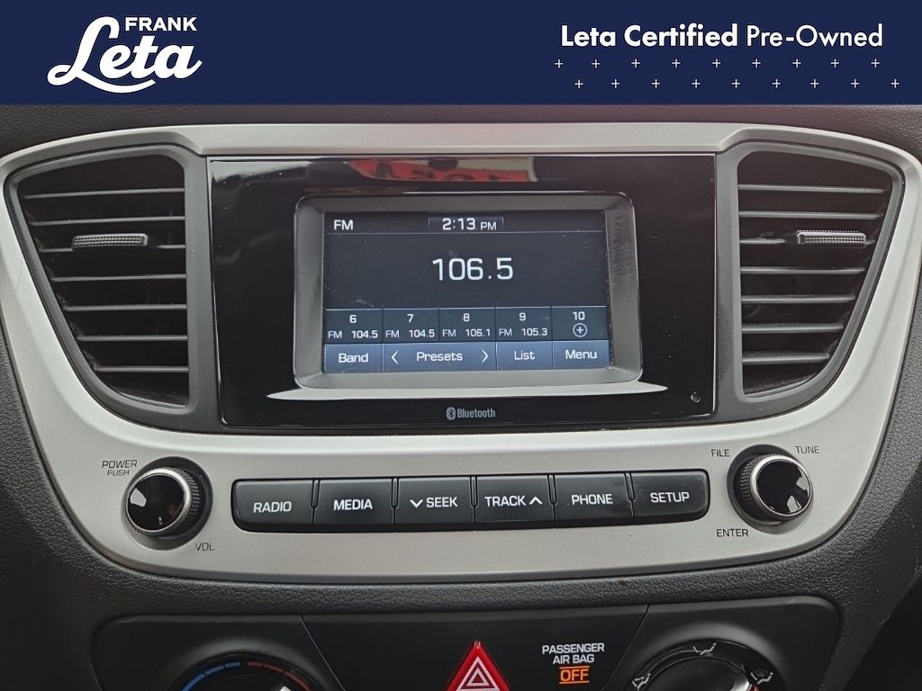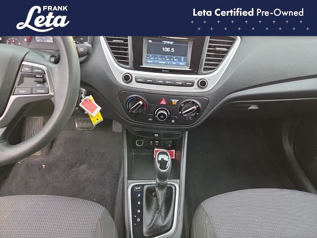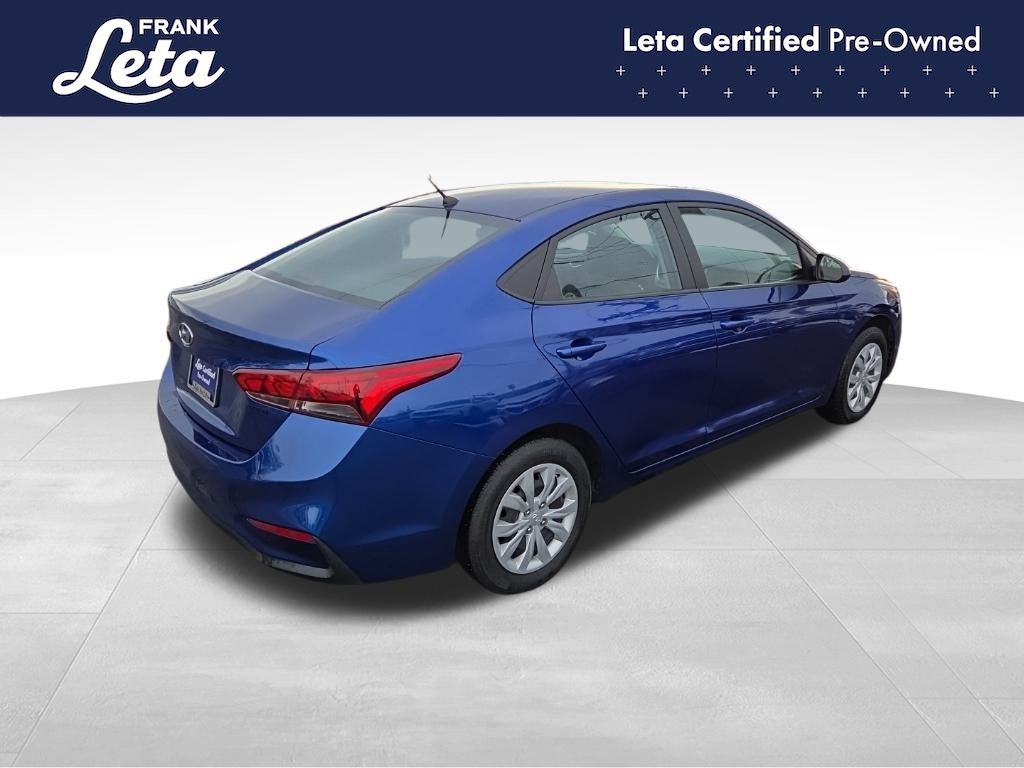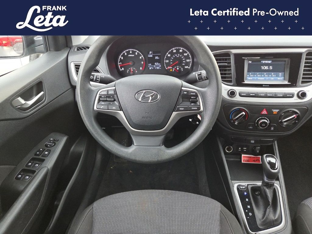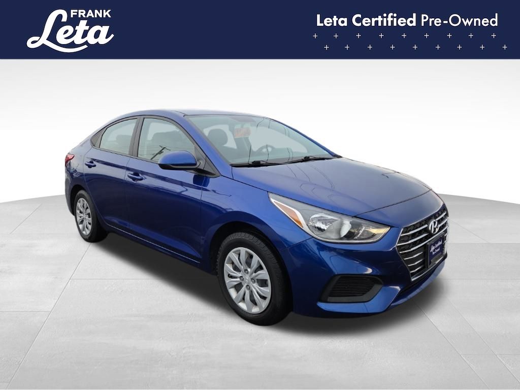 2022 Hyundai Accent SE Admiral Blue Pearl Accent SE, Frank Leta Certified Certified, 1.6L I4 PDI DOHC 16V LEV3-ULEV125 120hp, FWD, Admiral Blue Pearl, Black Cloth, Exterior Parking Camera Rear, 4 Speakers, ABS brakes, Air Conditioning, AM/FM radio, Anti-whiplash front head restraints, Brake assist, Bumpers: body-color, Carpeted Floor Mats, Cloth Seat Trim, Driver door bin, Driver vanity mirror, Dual front impact airbags, Dual front side impact airbags, Dual USB Charger, Electronic Stability Control, Front anti-roll bar, Front Bucket Seats, Front reading lights, Front wheel independent suspension, Illuminated entry, Low tire pressure warning, Occupant sensing airbag, Option Group 01, Outside temperature display, Overhead airbag, Overhead console, Panic alarm, Passenger door bin, Passenger vanity mirror, Power door mirrors, Power steering, Power windows, Radio: Audio 4.0B AM/FM, Rear window defroster, Remote keyless entry, Security system, Speed control, Speed-sensing steering, Split folding rear seat, Steering wheel mounted audio controls, Tachometer, Tilt steering wheel, Traction control, Trip computer, Wheels: 5.5J x 15" Steel w/Covers, Accent SE, 1.6L I4 PDI DOHC 16V LEV3-ULEV125 120hp, FWD, Admiral Blue Pearl, Black Cloth, Exterior Parking Camera Rear. 1.6L I4 PDI DOHC 16V LEV3-ULEV125 120hp CVT FWD 4D Sedan 33/41 City/Highway MPG