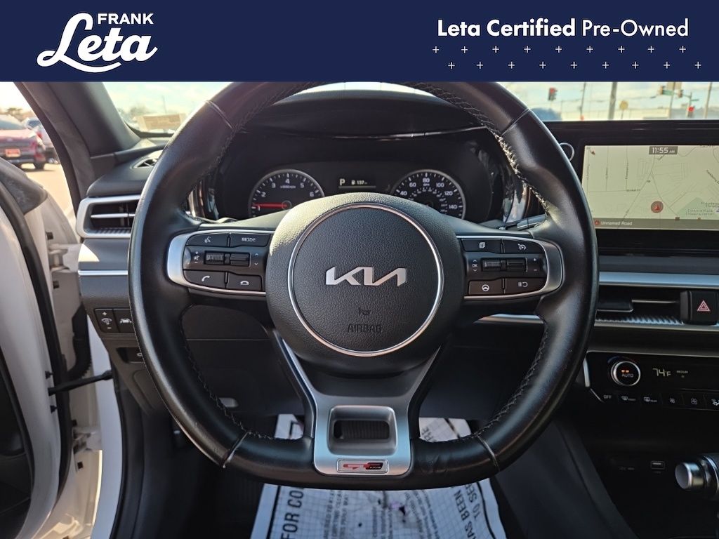 2022 Kia K5 GT-Line Glacial White Pearl K5 GT-Line, Glacial White Pearl, Black w/Cloth/Leatherette Seat Trim, Apple CarPlay & Android Auto, Front dual zone A/C, Front fog lights, Fully automatic headlights, Heated door mirrors, Navigation System, Sport steering wheel, Wheels: 7.5J x 18" Gloss Black Machined Finish Alloy, 4-Wheel Disc Brakes, 6 Speakers, ABS brakes, Air Conditioning, AM/FM radio: SiriusXM, Auto High-beam Headlights, Automatic temperature control, Brake assist, Bumpers: body-color, Cargo Tray, Carpeted Floor Mats, Cloth/Leatherette Seat Trim, Delay-off headlights, Driver door bin, Driver vanity mirror, Dual front impact airbags, Dual front side impact airbags, Electronic Stability Control, Four wheel independent suspension, Front anti-roll bar, Front Bucket Seats, Front Center Armrest, Front reading lights, Illuminated entry, Knee airbag, Low tire pressure warning, Occupant sensing airbag, Outside temperature display, Overhead airbag, Overhead console, Panic alarm, Passenger door bin, Passenger vanity mirror, Power door mirrors, Power driver seat, Power steering, Power windows, Radio data system, Radio: AM/FM/MP3 Audio System, Rear anti-roll bar, Rear seat center armrest, Rear side impact airbag, Rear window defroster, Remote keyless entry, Security system, Speed control, Speed-sensing steering, Split folding rear seat, Spoiler, Steering wheel mounted audio controls, Tachometer, Telescoping steering wheel, Tilt steering wheel, Traction control, Trip computer, Turn signal indicator mirrors, Variably intermittent wipers, K5 GT-Line, Glacial White Pearl, Black w/Cloth/Leatherette Seat Trim, Apple CarPlay & Android Auto, Front dual zone A/C, Front fog lights, Fully automatic headlights, Heated door mirrors, Navigation System, Sport steering wheel, Wheels: 7.5J x 18" Gloss Black Machined Finish Alloy. I4 8-Speed Automatic FWD 4D Sedan Odometer is 7209 miles below market average! 27/37 City/Highway MPG