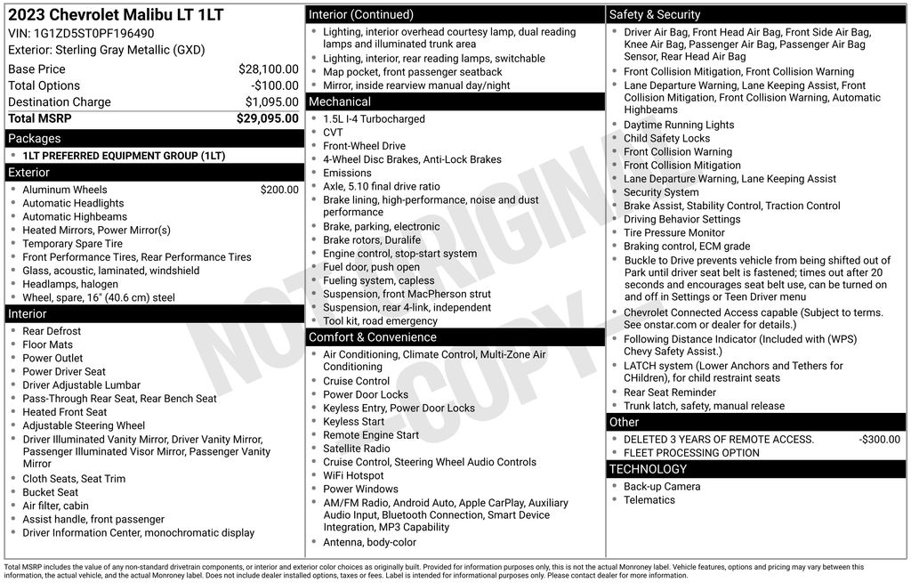 Recent Arrival! 2023 Chevrolet Malibu LT 1LT Sterling Gray Metallic Jet Black Cloth, 17" Aluminum Wheels, 18" Bright Machined Aluminum Wheels, 4-Wheel Disc Brakes, 6 Speakers, 6-Speaker Audio System Feature, 6-Way Manual Front Passenger Seat Adjuster, 8-Way Power Driver Seat Adjuster, ABS brakes, Air Conditioning, Alloy wheels, AM/FM radio: SiriusXM, Apple CarPlay/Android Auto, Auto High-beam Headlights, Automatic temperature control, Brake assist, Bumpers: body-color, Compass, Delay-off headlights, Deleted 3 Years of Remote Access, Driver door bin, Driver vanity mirror, Dual front impact airbags, Dual front side impact airbags, Electronic Stability Control, Emergency communication system: OnStar and Chevrolet connected services capable, Exterior Parking Camera Rear, Four wheel independent suspension, Front anti-roll bar, Front Bucket Seats, Front Center Armrest, Front dual zone A/C, Front reading lights, Fully automatic headlights, Heated door mirrors, Heated Driver & Front Passenger Seats, Heated front seats, Illuminated entry, Knee airbag, Low tire pressure warning, Occupant sensing airbag, Outside temperature display, Overhead airbag, Overhead console, Panic alarm, Passenger door bin, Passenger vanity mirror, Power door mirrors, Power Driver Lumbar Control Seat Adjuster, Power driver seat, Power steering, Power windows, Preferred Equipment Group 1LT, Premium audio system: Chevrolet Infotainment 3 Plus, Premium Cloth Seat Trim, Radio data system, Radio: Chevrolet Infotainment 3 System, Rear anti-roll bar, Rear reading lights, Rear seat center armrest, Rear side impact airbag, Rear window defroster, Remote keyless entry, Security system, SiriusXM Radio, Speed control, Split folding rear seat, Steering wheel mounted audio controls, Tachometer, Telescoping steering wheel, Tilt steering wheel, Traction control, Trip computer, Variably intermittent wipers, Voltmeter, Wireless Apple CarPlay/Android Auto, Jet Black Cloth. 1.5L DOHC CVT FWD 4D Sedan 27/35 City/Highway MPG