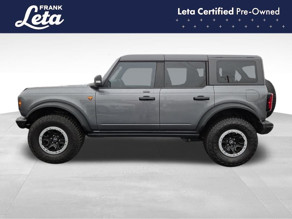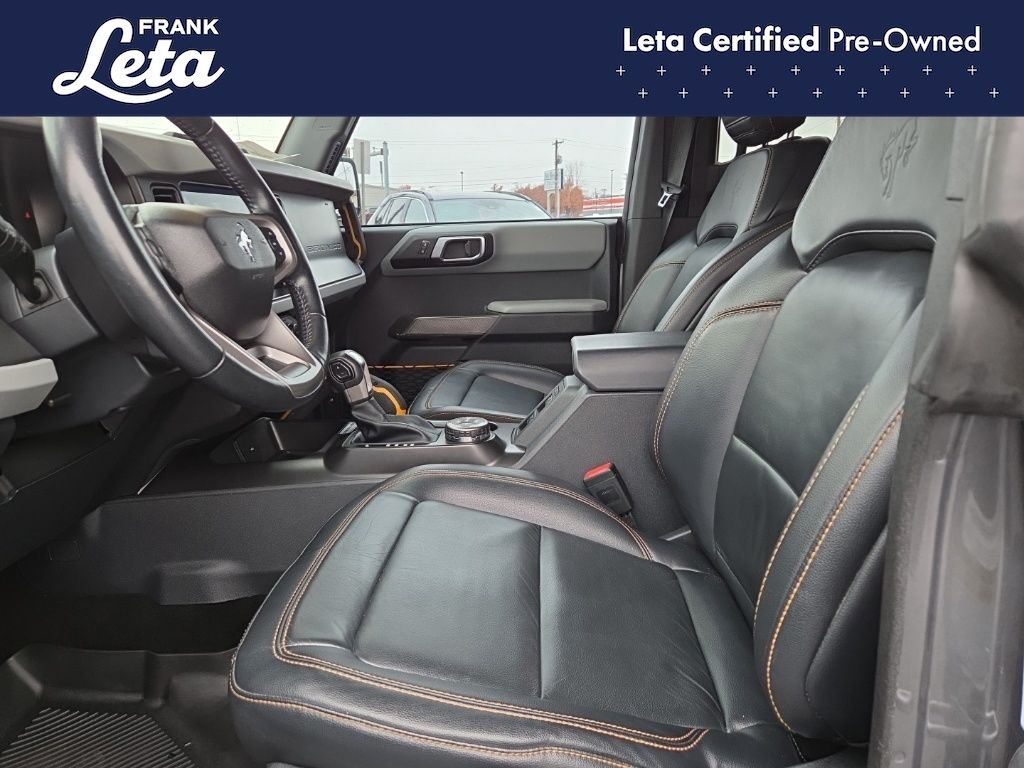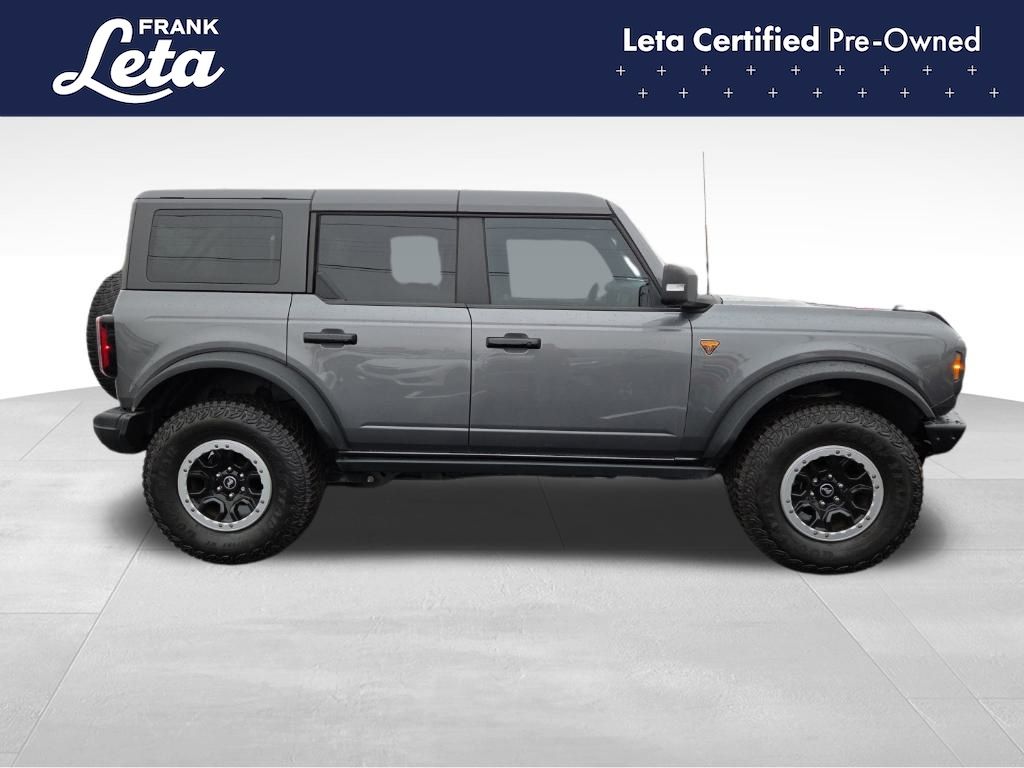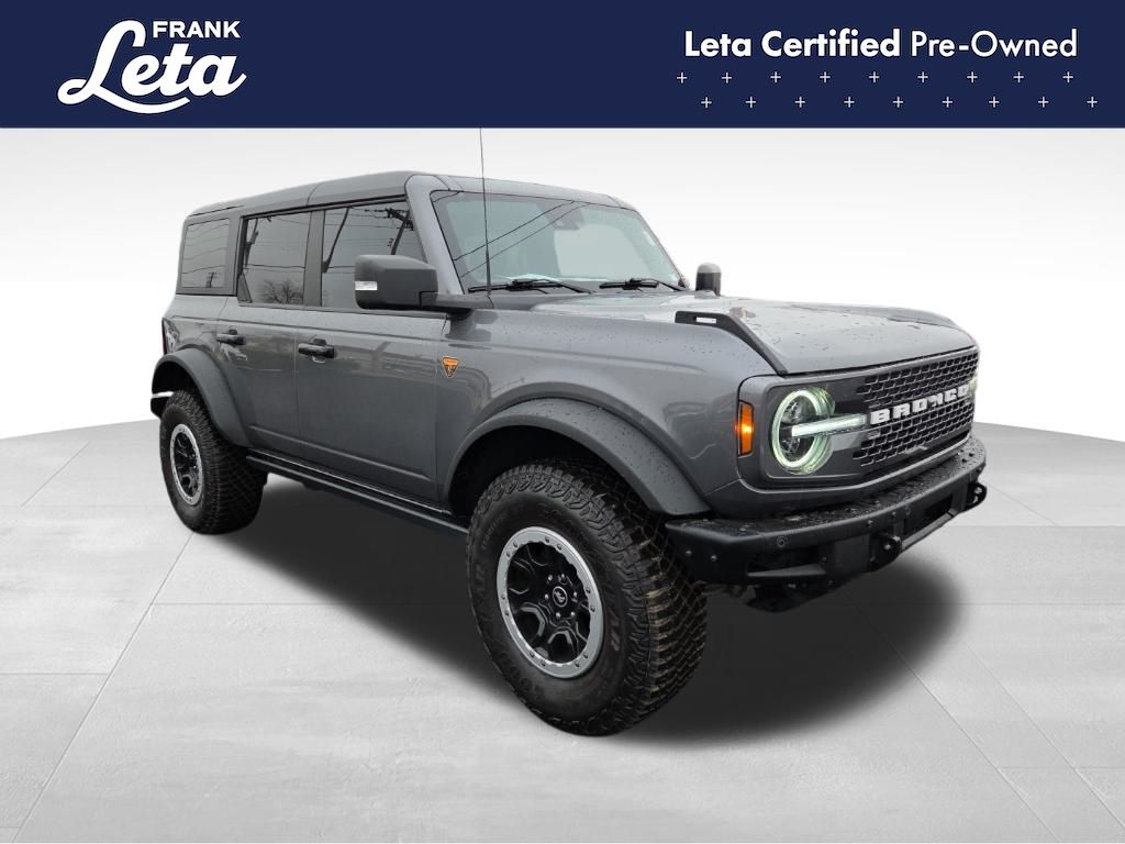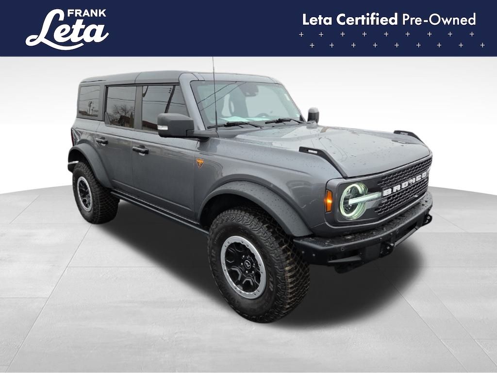 CARFAX One-Owner. 2023 Ford Bronco Badlands Carbonized Gray Metallic Bronco Badlands, Frank Leta Certified Certified, 2.7L EcoBoost V6, 4WD, Carbonized Gray Metallic, Black Onyx Leather, Carbonized Gray Molded-In-Color Hard Top, Front Row Top Panels Storage Bag, Fully automatic headlights, Hard Top Sound Deadening Headliner, Heated door mirrors, Rear-Window Defroster & Washer, Wheels: 17" Black High Gloss-Painted Aluminum, 4-Wheel Disc Brakes, 7 Speakers, ABS brakes, Air Conditioning, AM/FM radio: SiriusXM with 360L, AM/FM Stereo, Auto High-beam Headlights, Brake assist, Compass, Delay-off headlights, Driver door bin, Driver vanity mirror, Dual front impact airbags, Dual front side impact airbags, Electronic Stability Control, Emergency communication system: 911 Assist, Exterior Parking Camera Rear, Ford Performance Heavy-Duty Modular Front Bumper, Front & Rear Floor Liners w/o Carpet Floor Mats, Front anti-roll bar, Front Bucket Seats, Front Center Armrest, Front License Plate Bracket, Front reading lights, Front Row Top Panels & Door Storage Bags, Front wheel independent suspension, Illuminated entry, Integrated roll-over protection, Keyless Entry Keypad, Low tire pressure warning, Occupant sensing airbag, Outside temperature display, Overhead airbag, Overhead console, Panic alarm, Passenger door bin, Passenger vanity mirror, Power door mirrors, Power steering, Power windows, Radio data system, Remote keyless entry, Security system, SiriusXM Radio w/360L, Speed control, Split folding rear seat, Steering wheel mounted audio controls, SYNC 4, Tachometer, Telescoping steering wheel, Tilt steering wheel, Traction control, Trip computer, Variably intermittent wipers, Bronco Badlands, 2.7L EcoBoost V6, 4WD, Carbonized Gray Metallic, Black Onyx Leather, Carbonized Gray Molded-In-Color Hard Top, Front Row Top Panels Storage Bag, Fully automatic headlights, Hard Top Sound Deadening Headliner, Heated door mirrors, Rear-Window Defroster & Washer, Wheels: 17" Black High Gloss-Painted Aluminum. 2.7L EcoBoost V6 10-Speed Automatic 4WD 4D Sport Utility