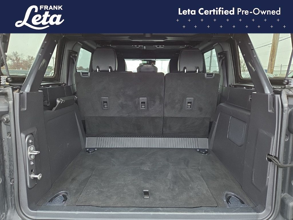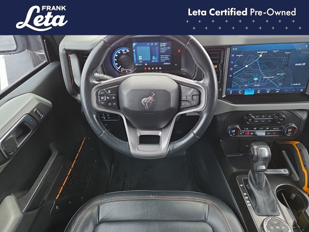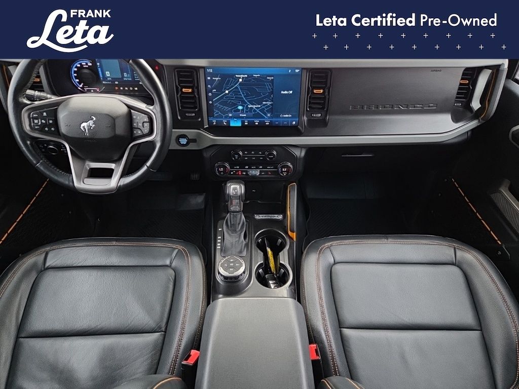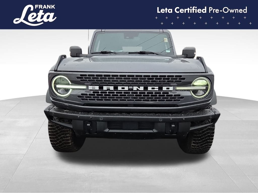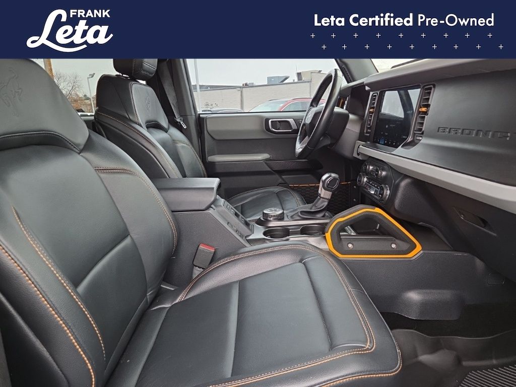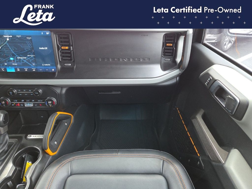 CARFAX One-Owner. 2023 Ford Bronco Badlands Carbonized Gray Metallic Bronco Badlands, Frank Leta Certified Certified, 2.7L EcoBoost V6, 4WD, Carbonized Gray Metallic, Black Onyx Leather, Carbonized Gray Molded-In-Color Hard Top, Front Row Top Panels Storage Bag, Fully automatic headlights, Hard Top Sound Deadening Headliner, Heated door mirrors, Rear-Window Defroster & Washer, Wheels: 17" Black High Gloss-Painted Aluminum, 4-Wheel Disc Brakes, 7 Speakers, ABS brakes, Air Conditioning, AM/FM radio: SiriusXM with 360L, AM/FM Stereo, Auto High-beam Headlights, Brake assist, Compass, Delay-off headlights, Driver door bin, Driver vanity mirror, Dual front impact airbags, Dual front side impact airbags, Electronic Stability Control, Emergency communication system: 911 Assist, Exterior Parking Camera Rear, Ford Performance Heavy-Duty Modular Front Bumper, Front & Rear Floor Liners w/o Carpet Floor Mats, Front anti-roll bar, Front Bucket Seats, Front Center Armrest, Front License Plate Bracket, Front reading lights, Front Row Top Panels & Door Storage Bags, Front wheel independent suspension, Illuminated entry, Integrated roll-over protection, Keyless Entry Keypad, Low tire pressure warning, Occupant sensing airbag, Outside temperature display, Overhead airbag, Overhead console, Panic alarm, Passenger door bin, Passenger vanity mirror, Power door mirrors, Power steering, Power windows, Radio data system, Remote keyless entry, Security system, SiriusXM Radio w/360L, Speed control, Split folding rear seat, Steering wheel mounted audio controls, SYNC 4, Tachometer, Telescoping steering wheel, Tilt steering wheel, Traction control, Trip computer, Variably intermittent wipers, Bronco Badlands, 2.7L EcoBoost V6, 4WD, Carbonized Gray Metallic, Black Onyx Leather, Carbonized Gray Molded-In-Color Hard Top, Front Row Top Panels Storage Bag, Fully automatic headlights, Hard Top Sound Deadening Headliner, Heated door mirrors, Rear-Window Defroster & Washer, Wheels: 17" Black High Gloss-Painted Aluminum. 2.7L EcoBoost V6 10-Speed Automatic 4WD 4D Sport Utility