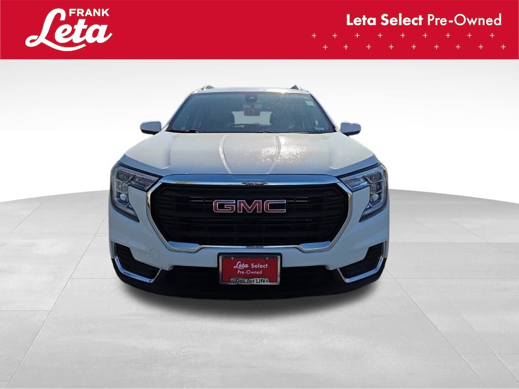 CARFAX One-Owner. 2023 GMC Terrain SLE Summit White Terrain SLE, Frank Leta Select Certified, 1.5L DOHC, AWD, Summit White, Jet Black w/Premium Cloth Seat Trim, Adaptive Cruise Control, Auto-dimming Rear-View mirror, Bluetooth For Phone, Dual-Zone Automatic Climate Control, Fully automatic headlights, Lane Departure Warning System, Power Programmable Rear Liftgate, Rear Park Assist, Wheels: 17" x 7" Silver Painted Aluminum, Wireless Apple CarPlay/Wireless Android Auto, 2 USB Data Ports w/Auxiliary Input Jack, 3.47 Axle Ratio, 4-Way Manual Driver's Seat, 4-Way Manual Front Passenger Seat, 4-Wheel Disc Brakes, 4.2" Multi-Color Driver Information Screen, 6 Speakers, 6-Speaker Audio System Feature, 8-Way Power Driver Seat Adjuster, ABS brakes, Air Conditioning, AM/FM radio: SiriusXM, Auto High-beam Headlights, Brake assist, Bumpers: body-color, Cargo Package (LPO), Cold Air Grille Shutter, Compass, Delay-off headlights, Driver & Front Passenger Heated Seats, Driver Convenience Package, Driver door bin, Driver vanity mirror, Dual front impact airbags, Dual front side impact airbags, Electronic Stability Control, Emergency communication system: OnStar and GMC connected services capable, Four wheel independent suspension, Front anti-roll bar, Front Bucket Seats, Front Center Armrest, Front reading lights, Heated door mirrors, Illuminated entry, Lane Change Alert w/Side Blind Zone Alert, License Plate Front Mounting Package, Low tire pressure warning, Occupant sensing airbag, Outside Heated Power-Adjustable Mirrors, Outside temperature display, Overhead airbag, Overhead console, Panic alarm, Passenger door bin, Passenger vanity mirror, Power door mirrors, Power Driver Lumbar Control, Power steering, Power windows, Preferred Equipment Group 3SA, Premium Cloth Seat Trim, Radio data system, Radio: GMC Infotainment Audio System w/7" Display, Rear anti-roll bar, Rear Cross-Traffic Alert, Rear seat center armrest, Rear window defroster, Rear window wiper, Remote keyless entry, Remote Start, Retractable Cargo Shade, Roof-Mounted Luggage Rack Side Rails, Safety Alert Seat, Security system, Side Blind Zone & Rear Cross Traffic, SiriusXM Radio, Speed control, Speed-sensing steering, Split folding rear seat, Spoiler, Steering wheel mounted audio controls, Tachometer, Telescoping steering wheel, Terrain Pro Safety Plus, Tilt steering wheel, Traction control, Trip computer, Variably intermittent wipers, Vertical Cargo Net (LPO), Terrain SLE, 1.5L DOHC, AWD, Summit White, Jet Black w/Premium Cloth Seat Trim, Adaptive Cruise Control, Auto-dimming Rear-View mirror, Bluetooth For Phone, Dual-Zone Automatic Climate Control, Fully automatic headlights, Lane Departure Warning System, Power Programmable Rear Liftgate, Rear Park Assist, Wheels: 17" x 7" Silver Painted Aluminum, Wireless Apple CarPlay/Wireless Android Auto. 1.5L DOHC 9-Speed Automatic AWD 4D Sport Utility 24/28 City/Highway MPG