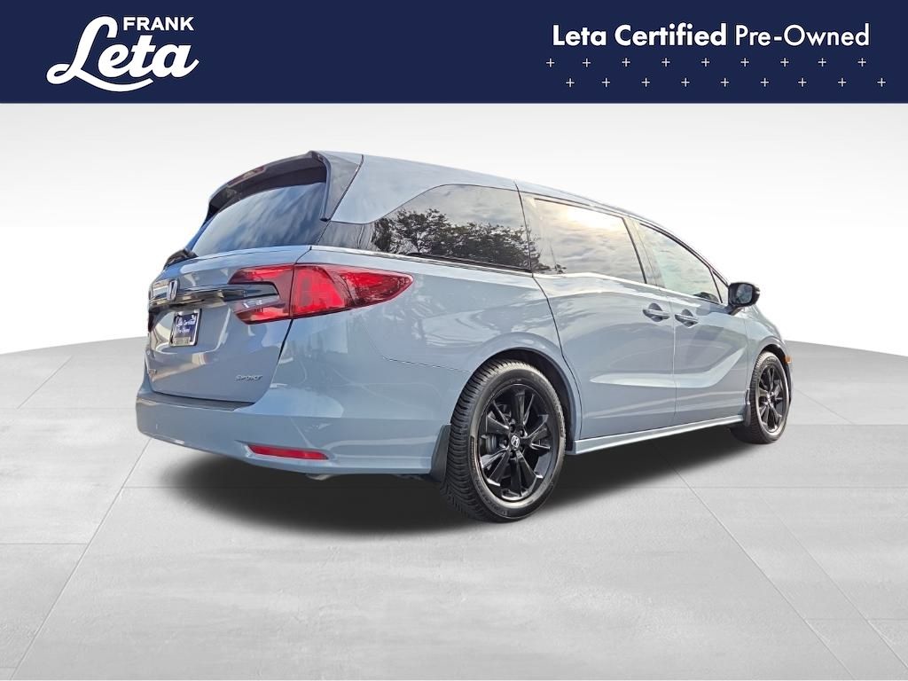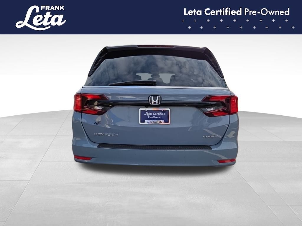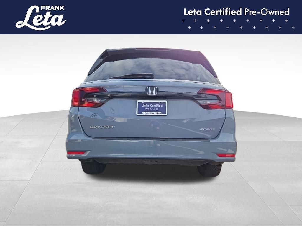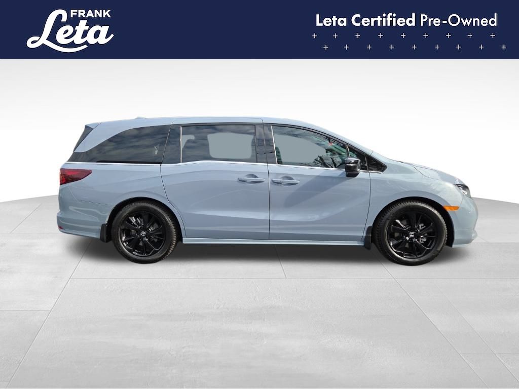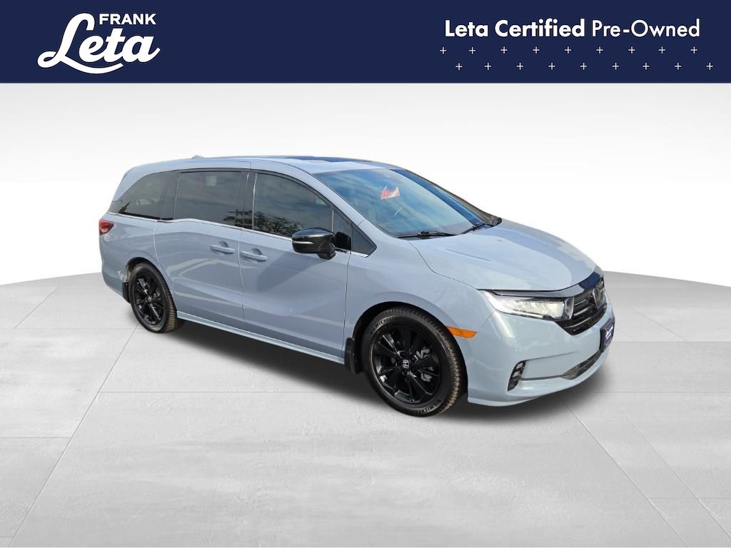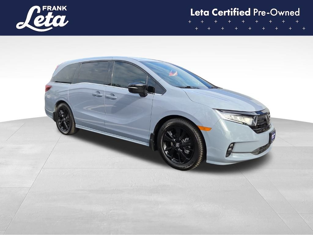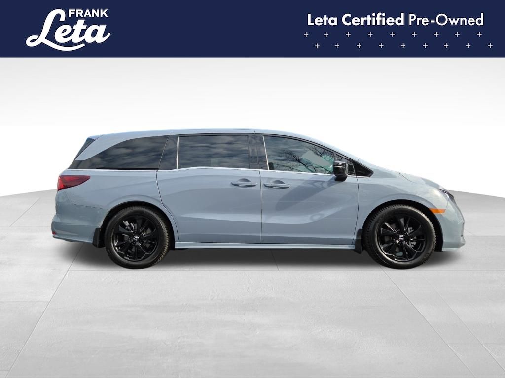 CARFAX One-Owner. 2023 Honda Odyssey Sport Sonic Gray Pearl Odyssey Sport, Frank Leta Certified Certified, 3.5L V6 SOHC i-VTEC 24V, Sonic Gray Pearl, Black w/Leather Seat Trim, 3rd row seats: split-bench, Adaptive Cruise Control: Adaptive Cruise Control (ACC) with Low-Speed Follow, Apple CarPlay/Android Auto, Auto-dimming Rear-View mirror, Blind Spot Information (BSI) System warning, Exterior Parking Camera Rear, Front dual zone A/C, Front fog lights, Fully automatic headlights, Garage door transmitter: HomeLink, Heated front seats, Memory seat, Power Liftgate, Power moonroof, Rear air conditioning, Wheels: 19" Gloss Black Alloy, 3.61 Axle Ratio, 4-Wheel Disc Brakes, 7 Speakers, A/V remote: CabinControl, ABS brakes, Air Conditioning, AM/FM radio: SiriusXM, Anti-whiplash front head restraints, Auto High-beam Headlights, Automatic temperature control, Brake assist, Bumpers: body-color, Delay-off headlights, Driver door bin, Driver vanity mirror, Driver's Seat Mounted Armrest, Dual front impact airbags, Dual front side impact airbags, Electronic Stability Control, Four wheel independent suspension, Front anti-roll bar, Front Bucket Seats, Front reading lights, Heated door mirrors, Heated Front Bucket Seats, Illuminated entry, Knee airbag, Lane departure: Lane Keeping Assist System (LKAS) active, Leather Seat Trim, Leather steering wheel, Low tire pressure warning, Occupant sensing airbag, Outside temperature display, Overhead airbag, Overhead console, Panic alarm, Passenger door bin, Passenger seat mounted armrest, Passenger vanity mirror, Power door mirrors, Power driver seat, Power passenger seat, Power steering, Power windows, Radio data system, Radio: 160-Watt AM/FM/HD/SiriusXM Audio System, Rear anti-roll bar, Rear reading lights, Rear seat center armrest, Rear window defroster, Rear window wiper, Reclining 3rd row seat, Remote keyless entry, Security system, Speed control, Speed-sensing steering, Speed-Sensitive Wipers, Split folding rear seat, Spoiler, Steering wheel mounted audio controls, Tachometer, Telescoping steering wheel, Tilt steering wheel, Traction control, Trip computer, Turn signal indicator mirrors, Variably intermittent wipers, Odyssey Sport, 3.5L V6 SOHC i-VTEC 24V, Sonic Gray Pearl, Black w/Leather Seat Trim, 3rd row seats: split-bench, Adaptive Cruise Control: Adaptive Cruise Control (ACC) with Low-Speed Follow, Apple CarPlay/Android Auto, Auto-dimming Rear-View mirror, Blind Spot Information (BSI) System warning, Exterior Parking Camera Rear, Front dual zone A/C, Front fog lights, Fully automatic headlights, Garage door transmitter: HomeLink, Heated front seats, Memory seat, Power Liftgate, Power moonroof, Rear air conditioning, Wheels: 19" Gloss Black Alloy. 3.5L V6 SOHC i-VTEC 24V 10-Speed Automatic FWD 4D Passenger Van 19/28 City/Highway MPG