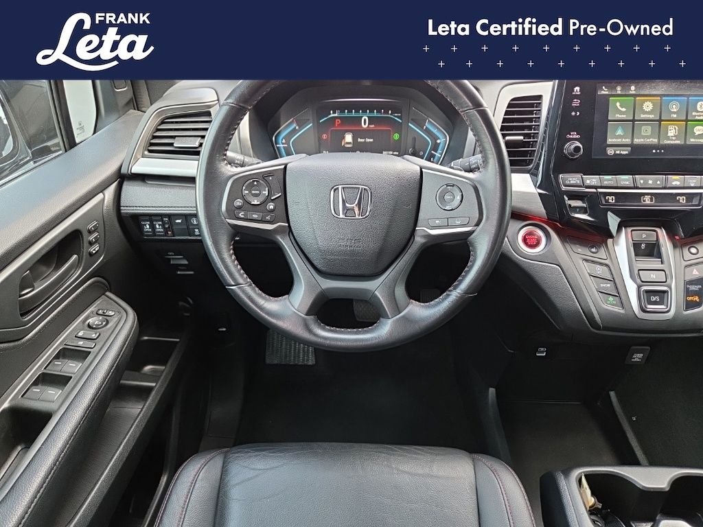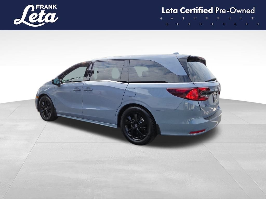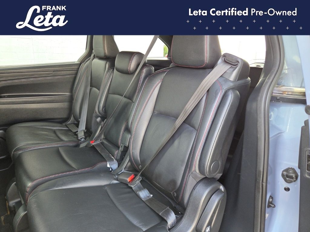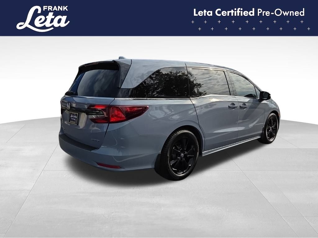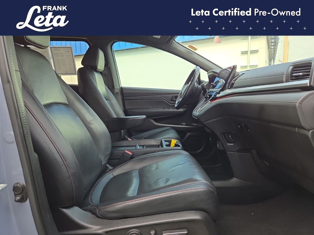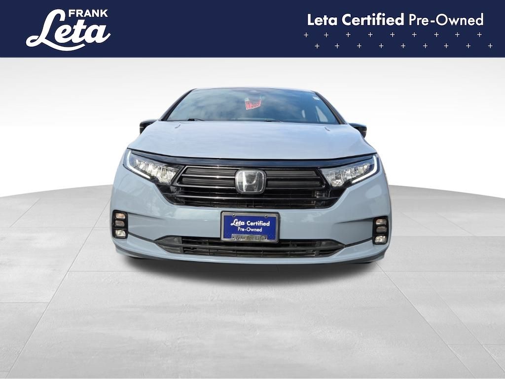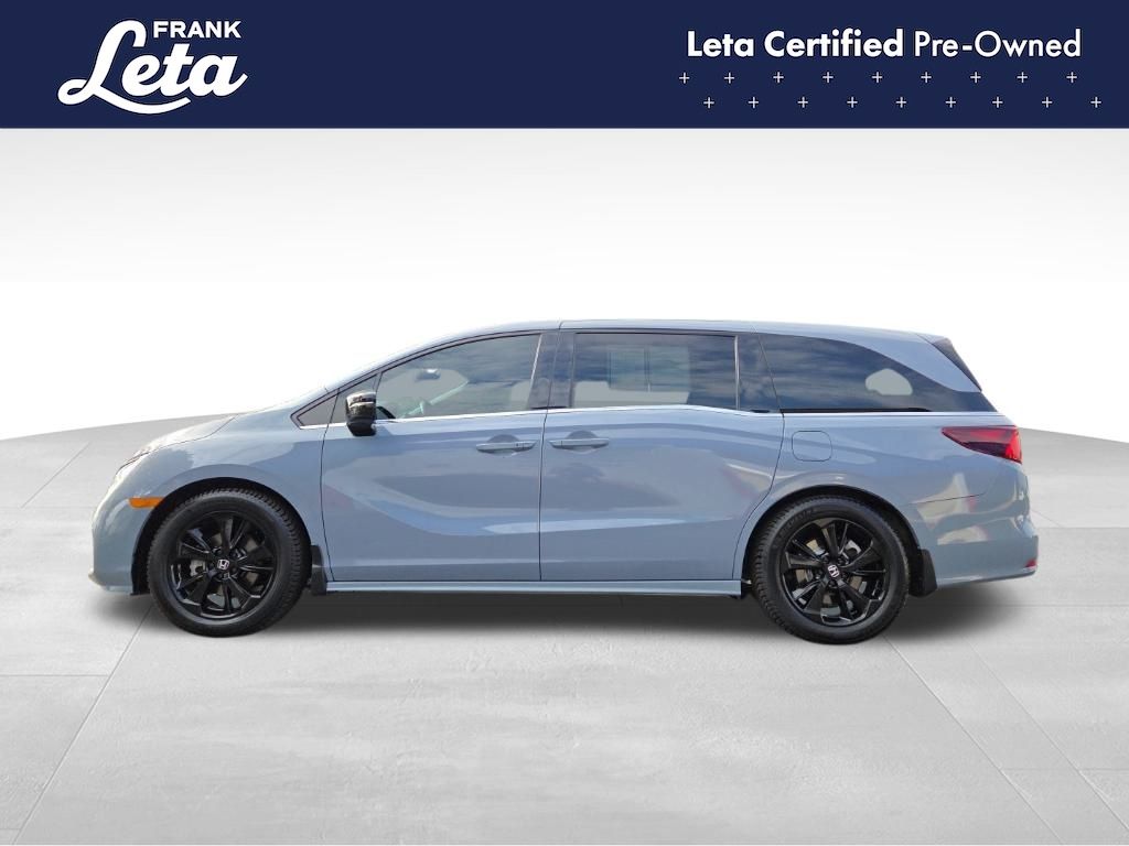 CARFAX One-Owner. 2023 Honda Odyssey Sport Sonic Gray Pearl Odyssey Sport, Frank Leta Certified Certified, 3.5L V6 SOHC i-VTEC 24V, Sonic Gray Pearl, Black w/Leather Seat Trim, 3rd row seats: split-bench, Adaptive Cruise Control: Adaptive Cruise Control (ACC) with Low-Speed Follow, Apple CarPlay/Android Auto, Auto-dimming Rear-View mirror, Blind Spot Information (BSI) System warning, Exterior Parking Camera Rear, Front dual zone A/C, Front fog lights, Fully automatic headlights, Garage door transmitter: HomeLink, Heated front seats, Memory seat, Power Liftgate, Power moonroof, Rear air conditioning, Wheels: 19" Gloss Black Alloy, 3.61 Axle Ratio, 4-Wheel Disc Brakes, 7 Speakers, A/V remote: CabinControl, ABS brakes, Air Conditioning, AM/FM radio: SiriusXM, Anti-whiplash front head restraints, Auto High-beam Headlights, Automatic temperature control, Brake assist, Bumpers: body-color, Delay-off headlights, Driver door bin, Driver vanity mirror, Driver's Seat Mounted Armrest, Dual front impact airbags, Dual front side impact airbags, Electronic Stability Control, Four wheel independent suspension, Front anti-roll bar, Front Bucket Seats, Front reading lights, Heated door mirrors, Heated Front Bucket Seats, Illuminated entry, Knee airbag, Lane departure: Lane Keeping Assist System (LKAS) active, Leather Seat Trim, Leather steering wheel, Low tire pressure warning, Occupant sensing airbag, Outside temperature display, Overhead airbag, Overhead console, Panic alarm, Passenger door bin, Passenger seat mounted armrest, Passenger vanity mirror, Power door mirrors, Power driver seat, Power passenger seat, Power steering, Power windows, Radio data system, Radio: 160-Watt AM/FM/HD/SiriusXM Audio System, Rear anti-roll bar, Rear reading lights, Rear seat center armrest, Rear window defroster, Rear window wiper, Reclining 3rd row seat, Remote keyless entry, Security system, Speed control, Speed-sensing steering, Speed-Sensitive Wipers, Split folding rear seat, Spoiler, Steering wheel mounted audio controls, Tachometer, Telescoping steering wheel, Tilt steering wheel, Traction control, Trip computer, Turn signal indicator mirrors, Variably intermittent wipers, Odyssey Sport, 3.5L V6 SOHC i-VTEC 24V, Sonic Gray Pearl, Black w/Leather Seat Trim, 3rd row seats: split-bench, Adaptive Cruise Control: Adaptive Cruise Control (ACC) with Low-Speed Follow, Apple CarPlay/Android Auto, Auto-dimming Rear-View mirror, Blind Spot Information (BSI) System warning, Exterior Parking Camera Rear, Front dual zone A/C, Front fog lights, Fully automatic headlights, Garage door transmitter: HomeLink, Heated front seats, Memory seat, Power Liftgate, Power moonroof, Rear air conditioning, Wheels: 19" Gloss Black Alloy. 3.5L V6 SOHC i-VTEC 24V 10-Speed Automatic FWD 4D Passenger Van 19/28 City/Highway MPG