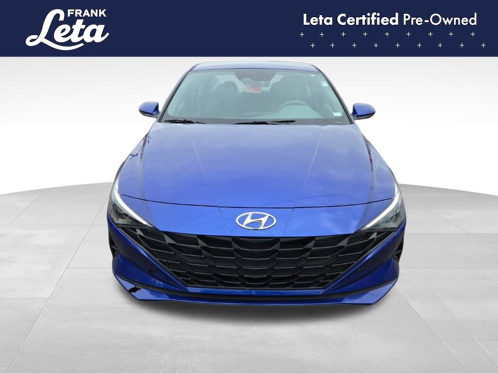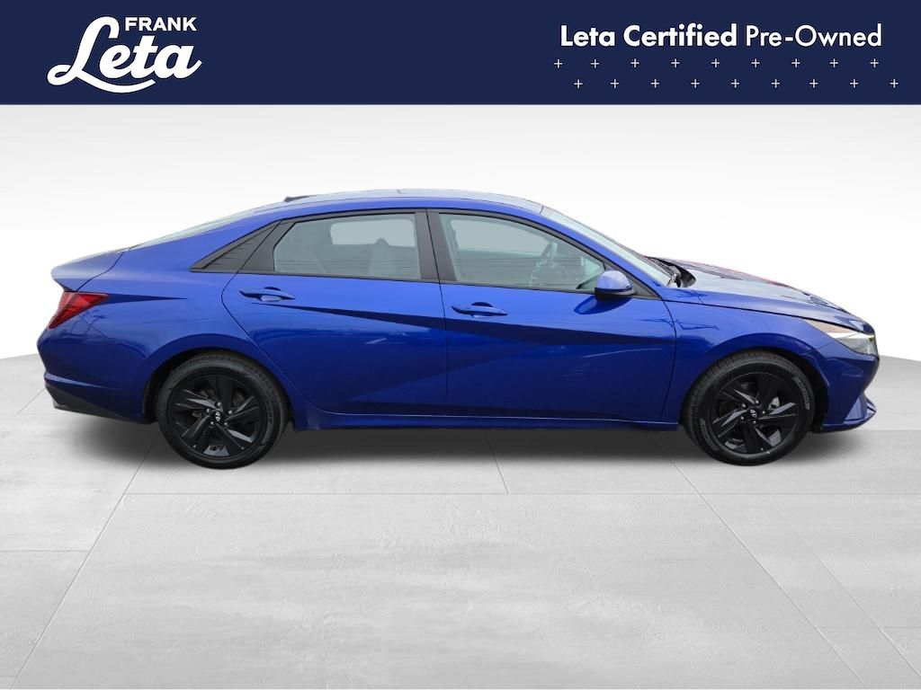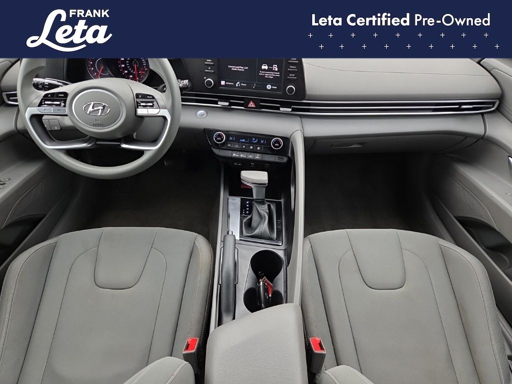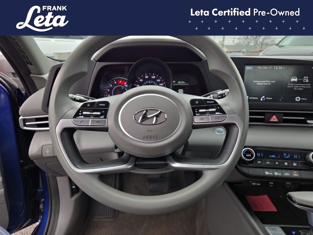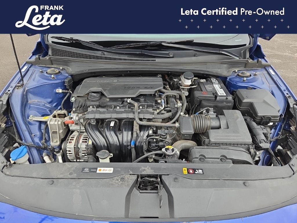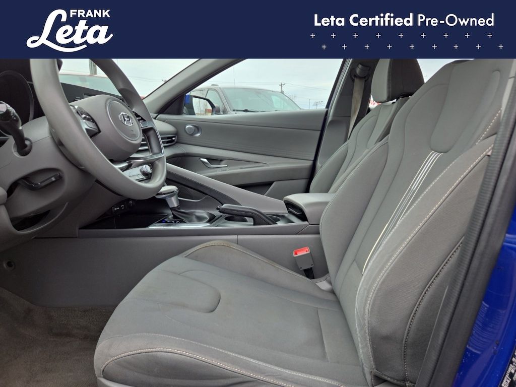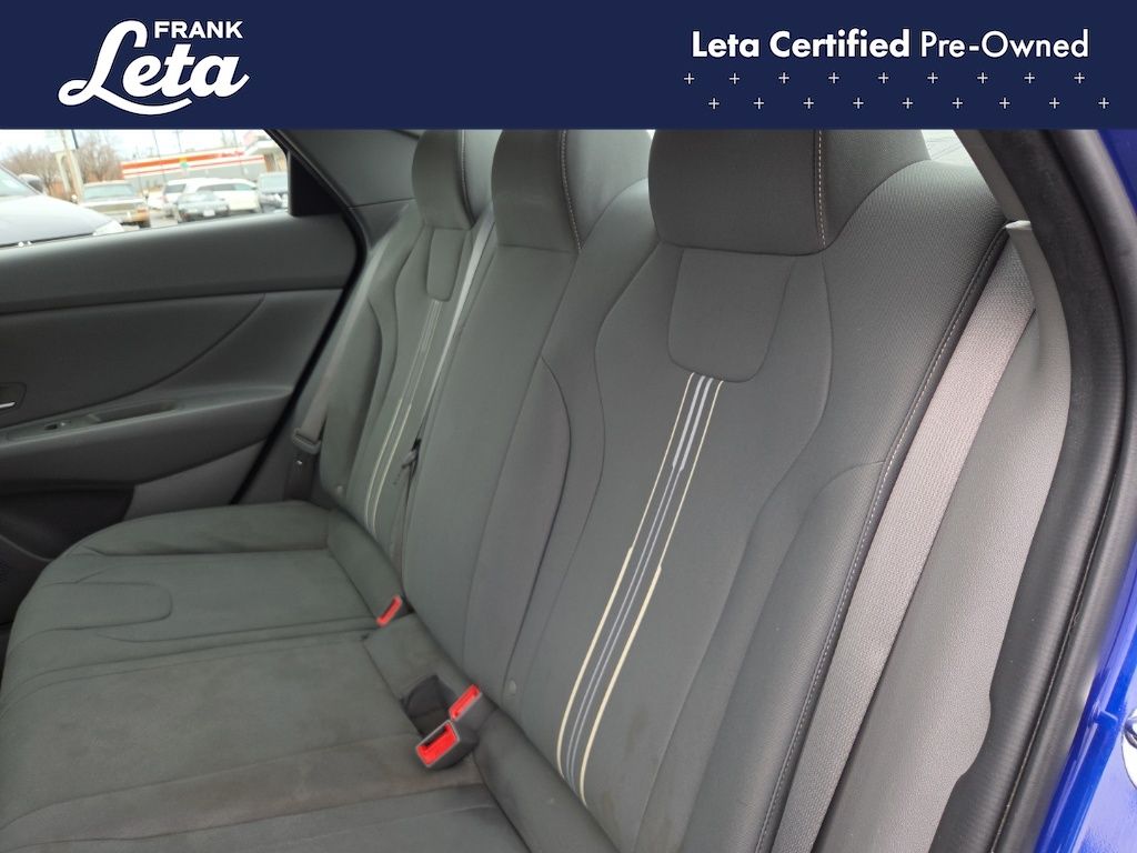 CARFAX One-Owner. 2023 Hyundai Elantra SEL Intense Blue Elantra SEL, Frank Leta Certified Certified, I4, FWD, Intense Blue, 16" x 6.5J Alloy Wheels, Apple CarPlay & Android Auto, Exterior Parking Camera Rear, Front dual zone A/C, Fully automatic headlights, 4-Wheel Disc Brakes, 6 Speakers, ABS brakes, Air Conditioning, AM/FM radio: SiriusXM, Auto High-beam Headlights, Automatic temperature control, Brake assist, Bumpers: body-color, Cargo Net, Cargo Side Bins, Carpeted Floor Mats, Cloth Seat Trim, Delay-off headlights, Driver door bin, Driver vanity mirror, Dual front impact airbags, Dual front side impact airbags, Electronic Stability Control, Emergency communication system: Blue Link Connected Car Service (3-year complimentary subscription), First Aid Kit, Front anti-roll bar, Front Bucket Seats, Front Center Armrest, Front reading lights, Front wheel independent suspension, Illuminated entry, Low tire pressure warning, Occupant sensing airbag, Option Group 01, Outside temperature display, Overhead airbag, Overhead console, Panic alarm, Passenger door bin, Passenger vanity mirror, Power door mirrors, Power steering, Power windows, Preferred Accessory Package, Radio: AM/FM/HD/SiriusXM Display Audio, Rear window defroster, Remote keyless entry, Security system, Speed control, Speed-sensing steering, Steering wheel mounted audio controls, Tachometer, Telescoping steering wheel, Tilt steering wheel, Traction control, Trip computer, Trunk/Cargo Hook, Variably intermittent wipers, Elantra SEL, I4, FWD, Intense Blue, 16" x 6.5J Alloy Wheels, Apple CarPlay & Android Auto, Exterior Parking Camera Rear, Front dual zone A/C, Fully automatic headlights. I4 CVT FWD 4D Sedan 30/40 City/Highway MPG