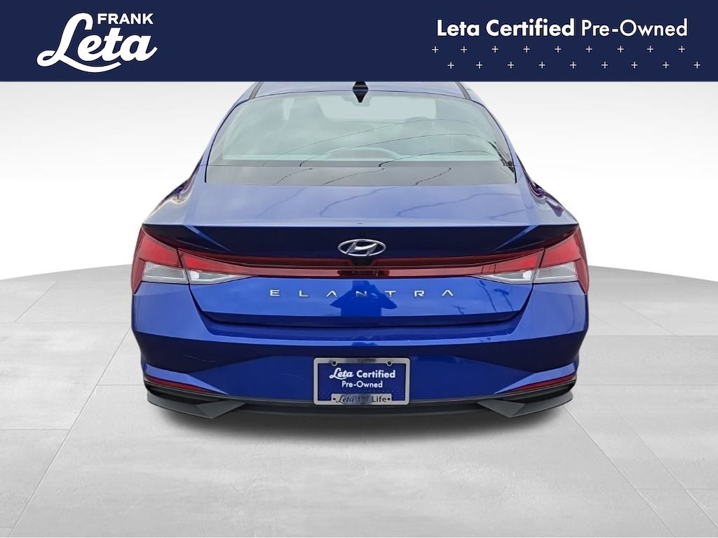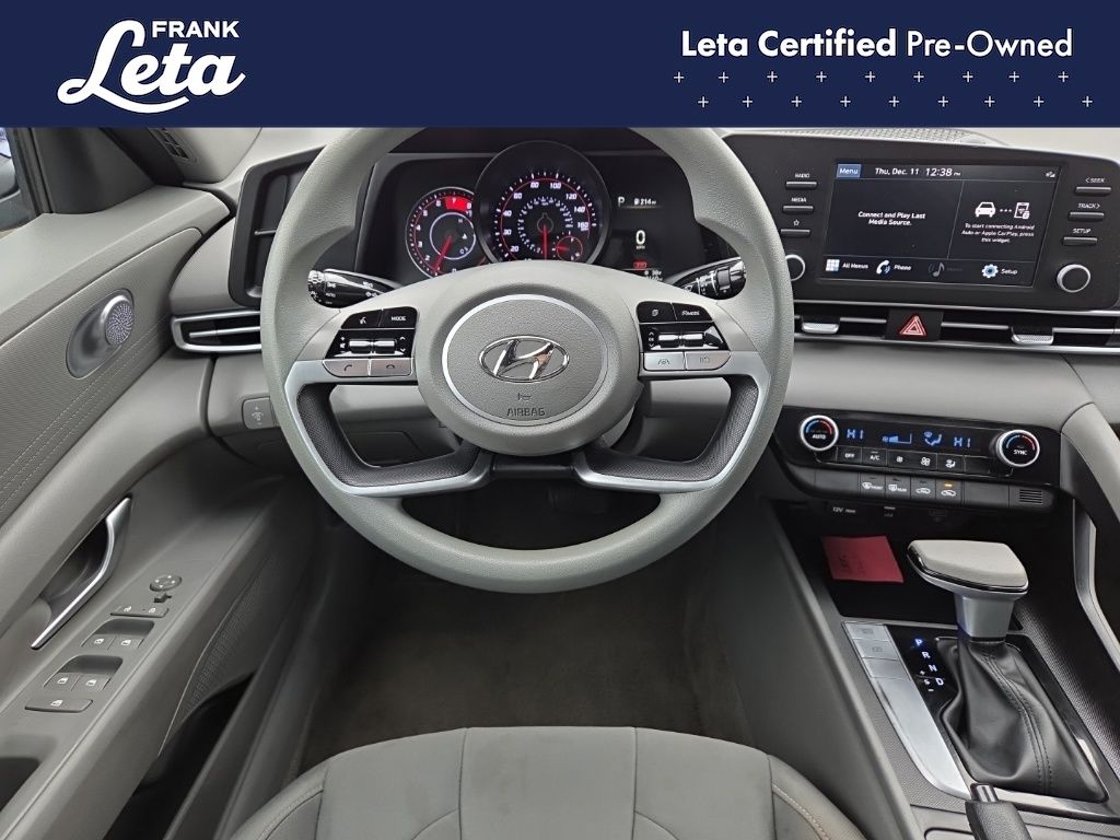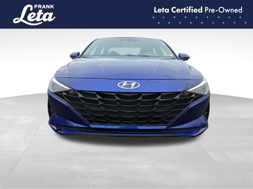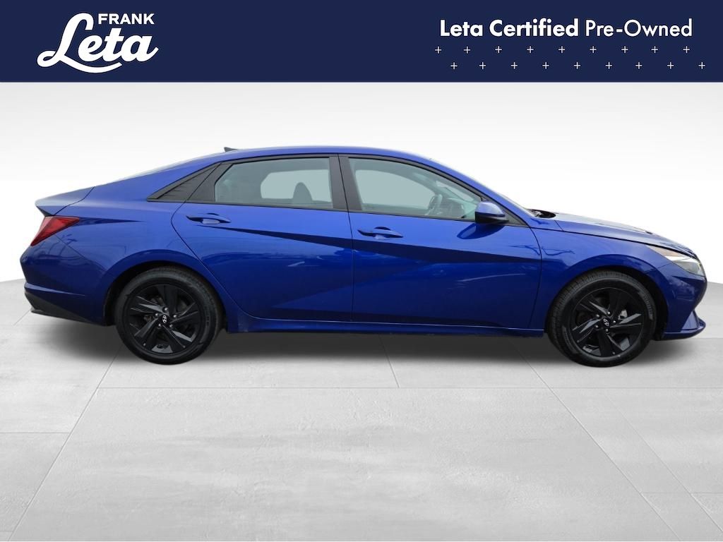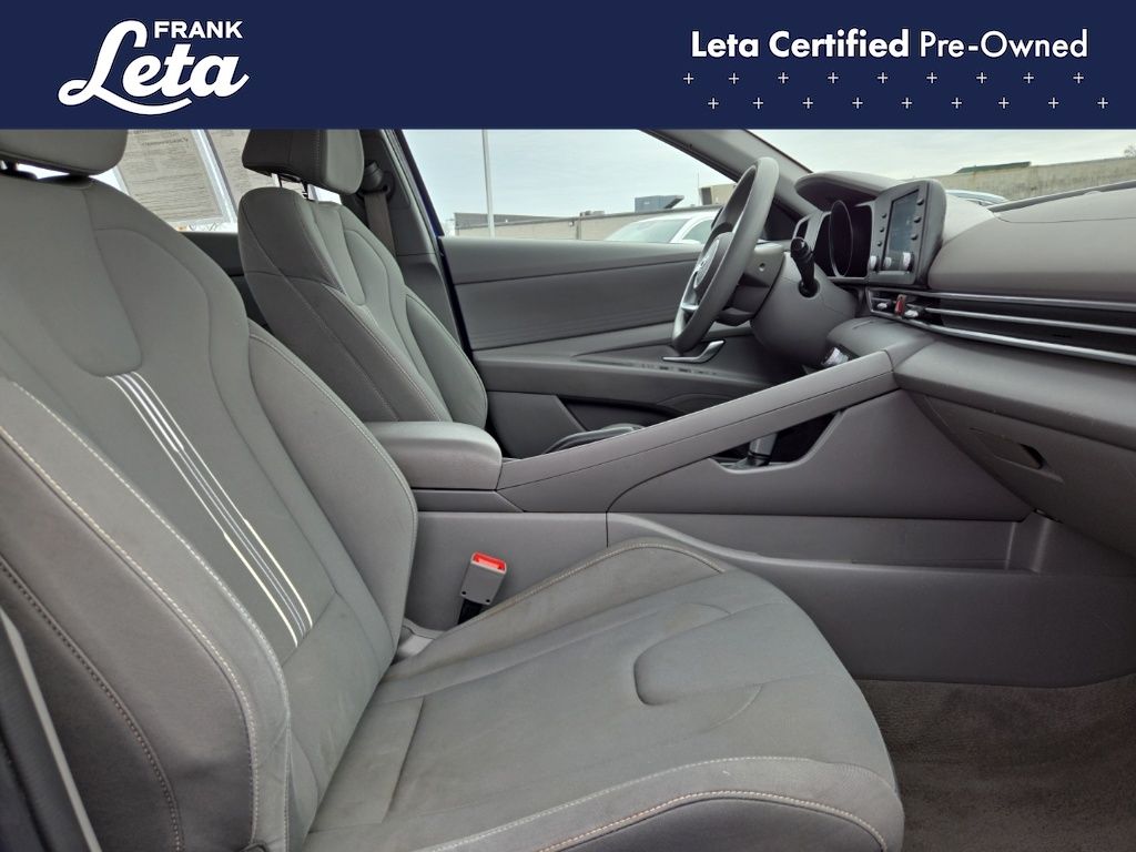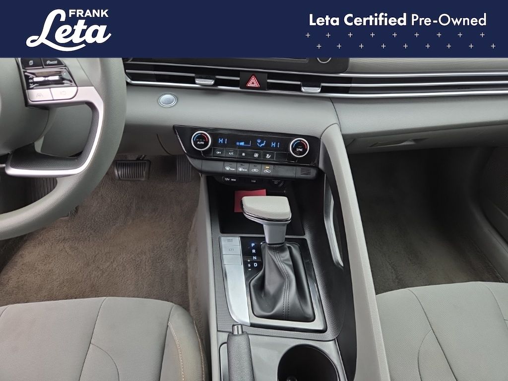 CARFAX One-Owner. 2023 Hyundai Elantra SEL Intense Blue Elantra SEL, Frank Leta Certified Certified, I4, FWD, Intense Blue, 16" x 6.5J Alloy Wheels, Apple CarPlay & Android Auto, Exterior Parking Camera Rear, Front dual zone A/C, Fully automatic headlights, 4-Wheel Disc Brakes, 6 Speakers, ABS brakes, Air Conditioning, AM/FM radio: SiriusXM, Auto High-beam Headlights, Automatic temperature control, Brake assist, Bumpers: body-color, Cargo Net, Cargo Side Bins, Carpeted Floor Mats, Cloth Seat Trim, Delay-off headlights, Driver door bin, Driver vanity mirror, Dual front impact airbags, Dual front side impact airbags, Electronic Stability Control, Emergency communication system: Blue Link Connected Car Service (3-year complimentary subscription), First Aid Kit, Front anti-roll bar, Front Bucket Seats, Front Center Armrest, Front reading lights, Front wheel independent suspension, Illuminated entry, Low tire pressure warning, Occupant sensing airbag, Option Group 01, Outside temperature display, Overhead airbag, Overhead console, Panic alarm, Passenger door bin, Passenger vanity mirror, Power door mirrors, Power steering, Power windows, Preferred Accessory Package, Radio: AM/FM/HD/SiriusXM Display Audio, Rear window defroster, Remote keyless entry, Security system, Speed control, Speed-sensing steering, Steering wheel mounted audio controls, Tachometer, Telescoping steering wheel, Tilt steering wheel, Traction control, Trip computer, Trunk/Cargo Hook, Variably intermittent wipers, Elantra SEL, I4, FWD, Intense Blue, 16" x 6.5J Alloy Wheels, Apple CarPlay & Android Auto, Exterior Parking Camera Rear, Front dual zone A/C, Fully automatic headlights. I4 CVT FWD 4D Sedan 30/40 City/Highway MPG