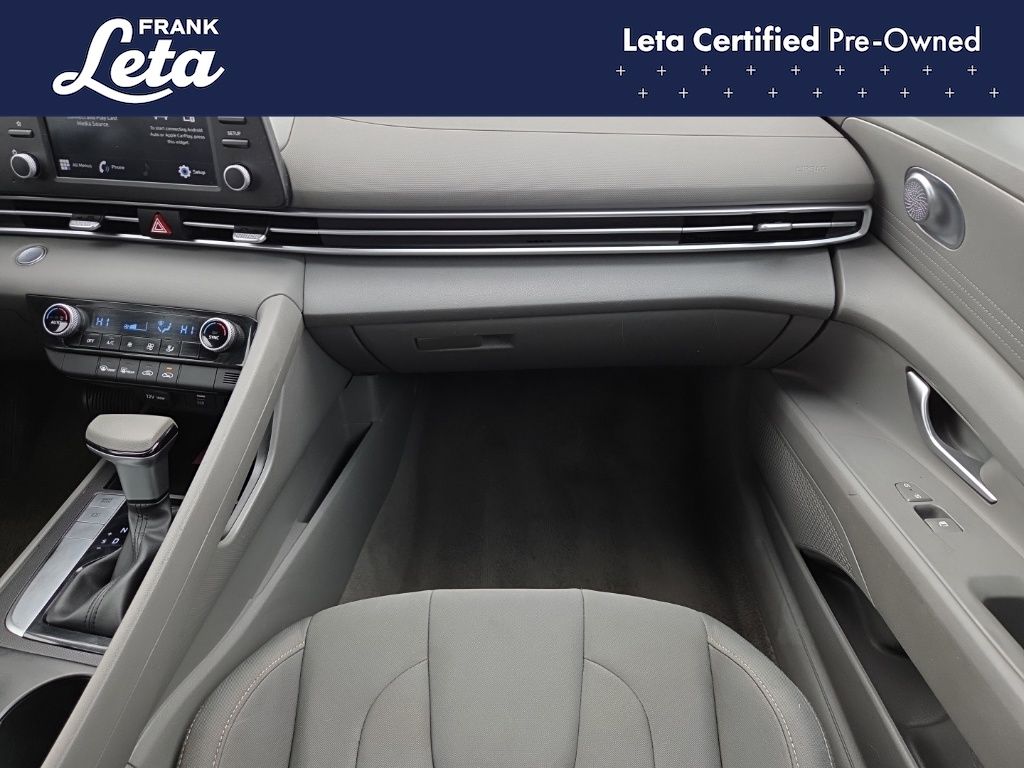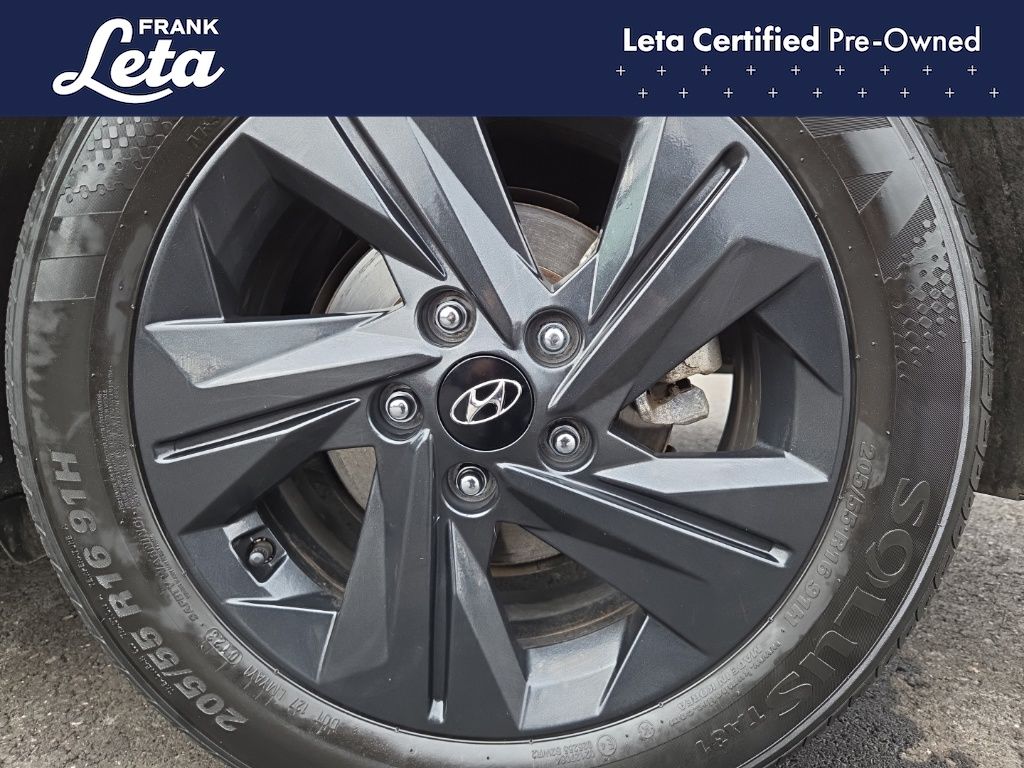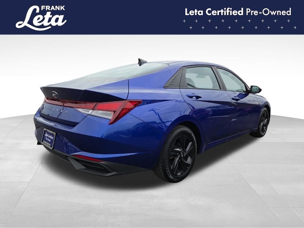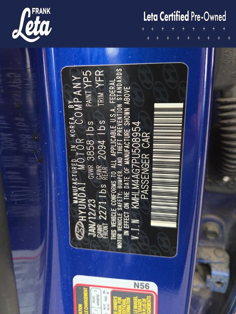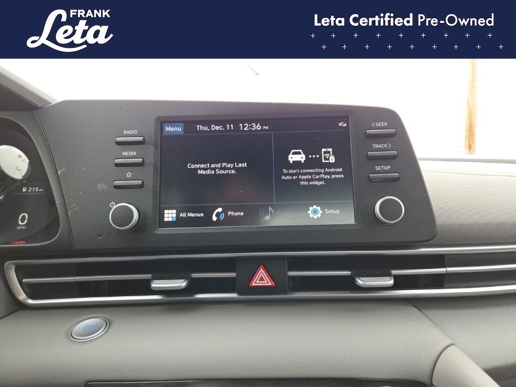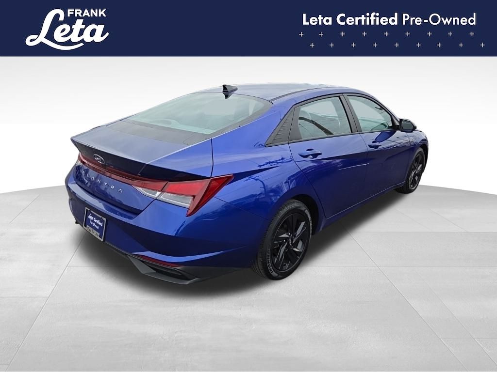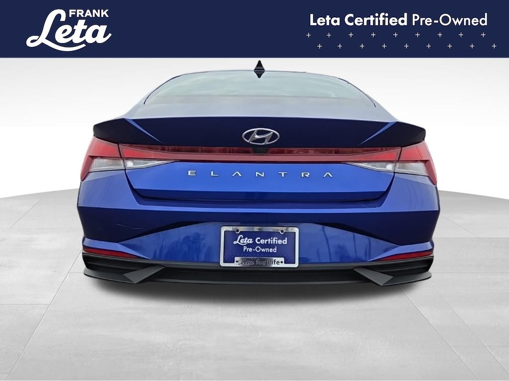 CARFAX One-Owner. 2023 Hyundai Elantra SEL Intense Blue Elantra SEL, Frank Leta Certified Certified, I4, FWD, Intense Blue, 16" x 6.5J Alloy Wheels, Apple CarPlay & Android Auto, Exterior Parking Camera Rear, Front dual zone A/C, Fully automatic headlights, 4-Wheel Disc Brakes, 6 Speakers, ABS brakes, Air Conditioning, AM/FM radio: SiriusXM, Auto High-beam Headlights, Automatic temperature control, Brake assist, Bumpers: body-color, Cargo Net, Cargo Side Bins, Carpeted Floor Mats, Cloth Seat Trim, Delay-off headlights, Driver door bin, Driver vanity mirror, Dual front impact airbags, Dual front side impact airbags, Electronic Stability Control, Emergency communication system: Blue Link Connected Car Service (3-year complimentary subscription), First Aid Kit, Front anti-roll bar, Front Bucket Seats, Front Center Armrest, Front reading lights, Front wheel independent suspension, Illuminated entry, Low tire pressure warning, Occupant sensing airbag, Option Group 01, Outside temperature display, Overhead airbag, Overhead console, Panic alarm, Passenger door bin, Passenger vanity mirror, Power door mirrors, Power steering, Power windows, Preferred Accessory Package, Radio: AM/FM/HD/SiriusXM Display Audio, Rear window defroster, Remote keyless entry, Security system, Speed control, Speed-sensing steering, Steering wheel mounted audio controls, Tachometer, Telescoping steering wheel, Tilt steering wheel, Traction control, Trip computer, Trunk/Cargo Hook, Variably intermittent wipers, Elantra SEL, I4, FWD, Intense Blue, 16" x 6.5J Alloy Wheels, Apple CarPlay & Android Auto, Exterior Parking Camera Rear, Front dual zone A/C, Fully automatic headlights. I4 CVT FWD 4D Sedan 30/40 City/Highway MPG