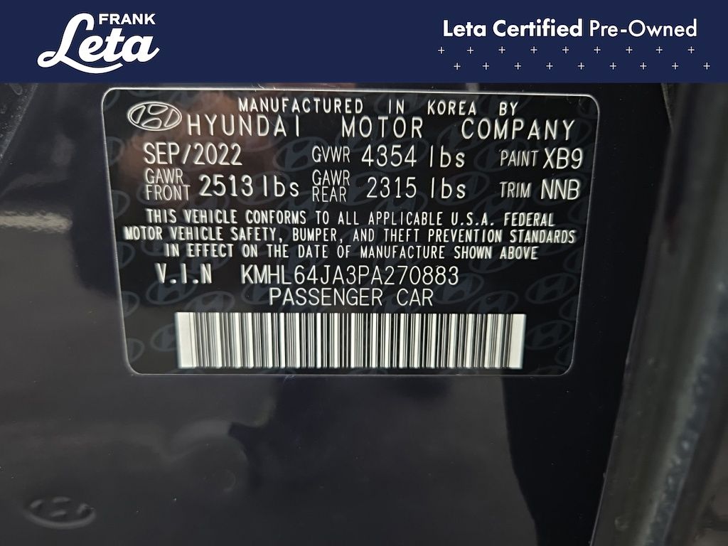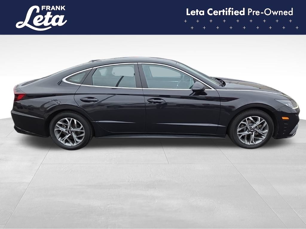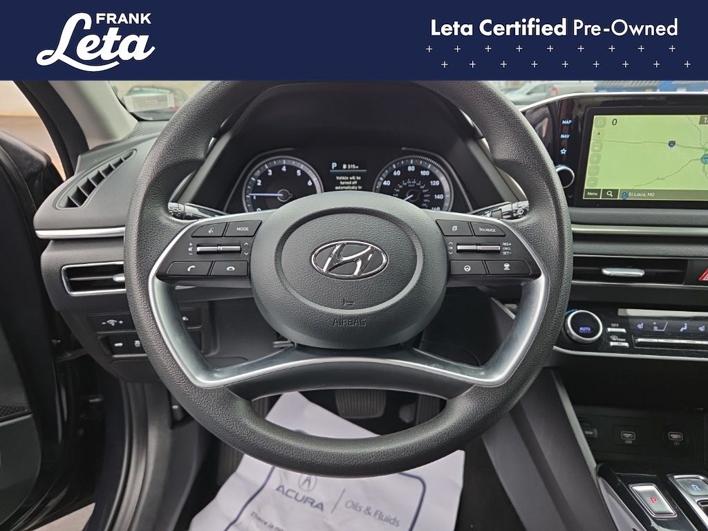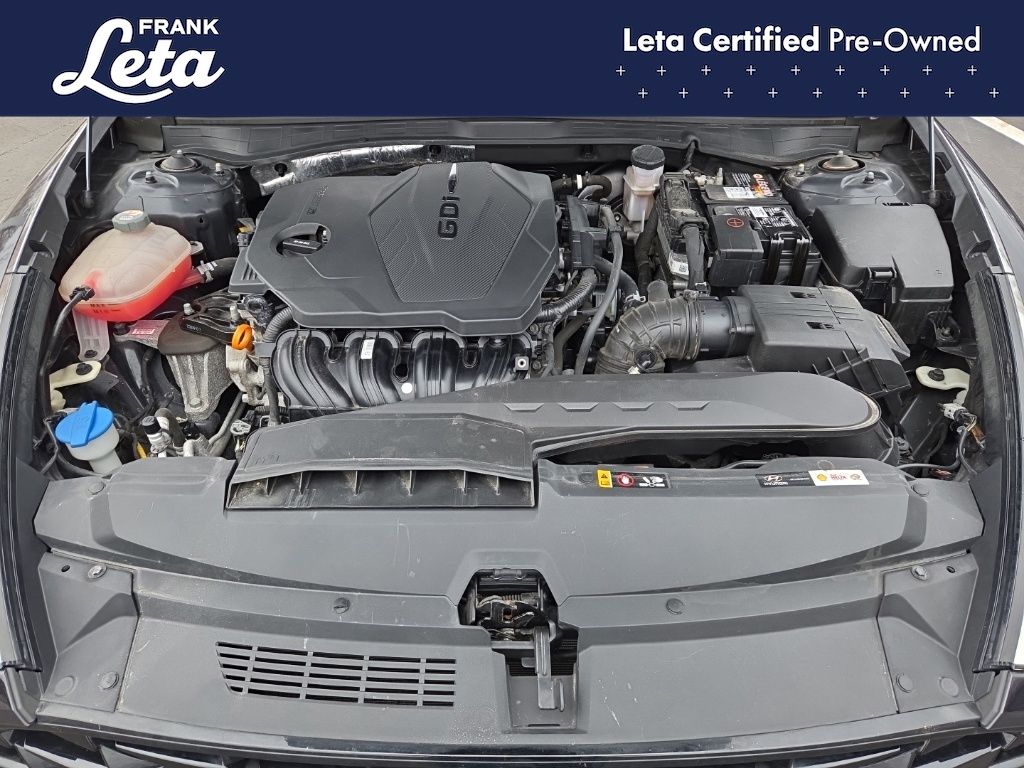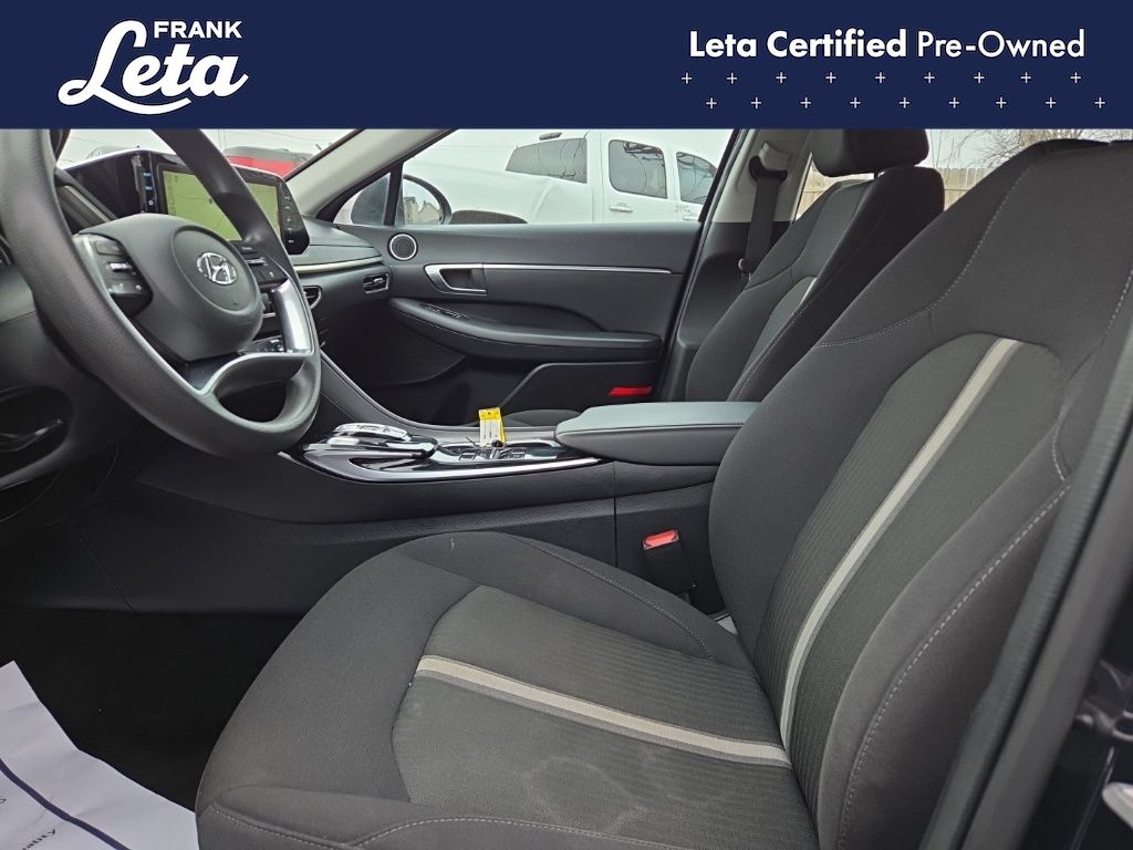 CARFAX One-Owner. 2023 Hyundai Sonata SEL Carbon Blue Sonata SEL, Frank Leta Certified Certified, 2.5L I4, FWD, Black w/Premium Cloth Seating Surfaces, 17" x 7.0J Aluminum Alloy Wheels, Apple CarPlay & Android Auto, Exterior Parking Camera Rear, Front dual zone A/C, Fully automatic headlights, Heated door mirrors, Heated front seats, Navigation System, 4-Wheel Disc Brakes, 6 Speakers, ABS brakes, Air Conditioning, AM/FM radio: SiriusXM, Auto High-beam Headlights, Automatic temperature control, Brake assist, Bumpers: body-color, Delay-off headlights, Driver door bin, Driver vanity mirror, Dual front impact airbags, Dual front side impact airbags, Electronic Stability Control, Emergency communication system: Blue Link Connected Car Service (3-year complimentary subscription), Four wheel independent suspension, Front anti-roll bar, Front Bucket Seats, Front Center Armrest, Front reading lights, Heated Front Bucket Seats, Illuminated entry, Knee airbag, Low tire pressure warning, Occupant sensing airbag, Option Group 01, Outside temperature display, Overhead airbag, Overhead console, Panic alarm, Passenger door bin, Passenger vanity mirror, Power door mirrors, Power driver seat, Power steering, Power windows, Premium Cloth Seating Surfaces, Radio data system, Radio: AM/FM/MP3/HD/SiriusXM Display Audio w/Nav, Rear anti-roll bar, Rear seat center armrest, Rear side impact airbag, Rear window defroster, Remote keyless entry, Security system, Speed control, Speed-sensing steering, Speed-Sensitive Wipers, Split folding rear seat, Steering wheel mounted audio controls, Tachometer, Telescoping steering wheel, Tilt steering wheel, Traction control, Trip computer, Turn signal indicator mirrors, Variably intermittent wipers, Sonata SEL, 2.5L I4, FWD, Black w/Premium Cloth Seating Surfaces, 17" x 7.0J Aluminum Alloy Wheels, Apple CarPlay & Android Auto, Exterior Parking Camera Rear, Front dual zone A/C, Fully automatic headlights, Heated door mirrors, Heated front seats, Navigation System. 2.5L I4 8-Speed Automatic with SHIFTRONIC FWD 4D Sedan 27/37 City/Highway MPG