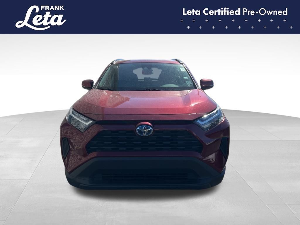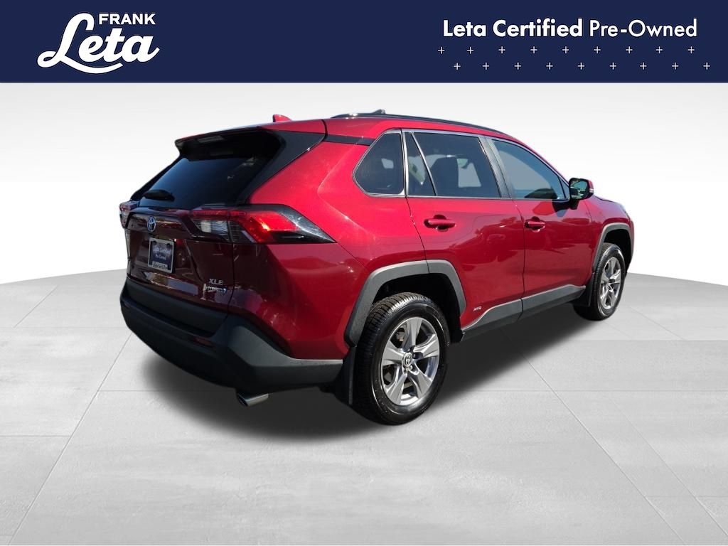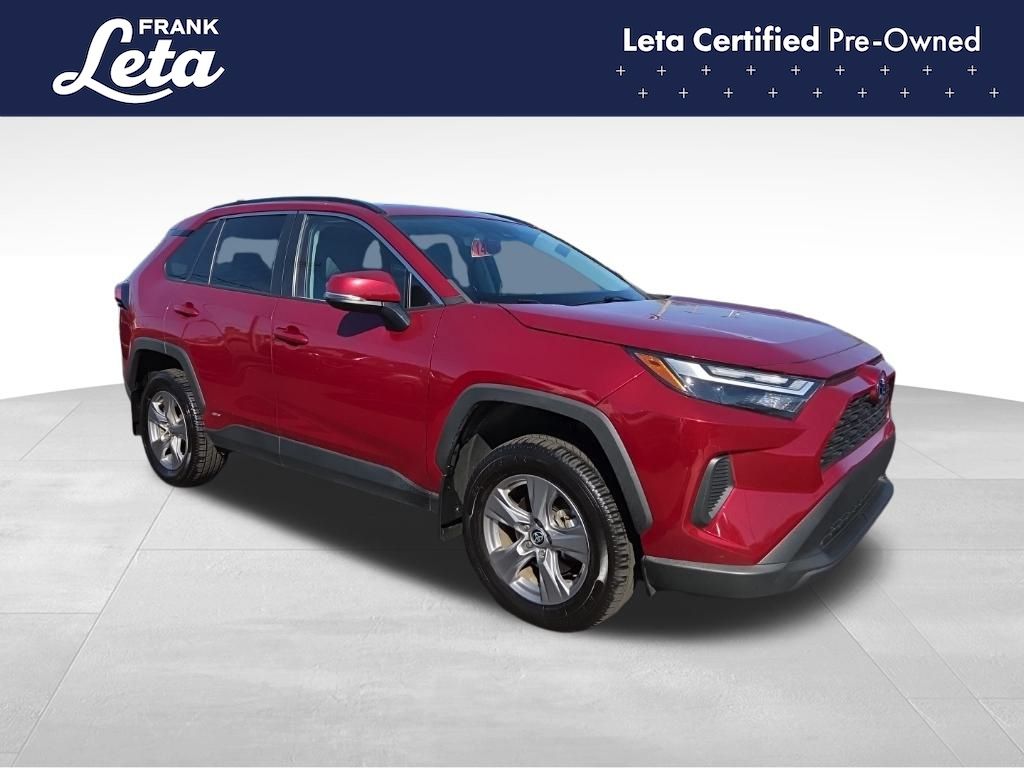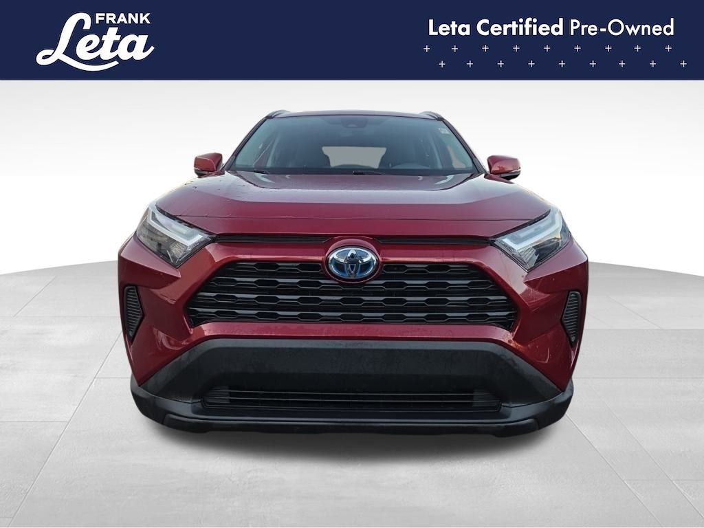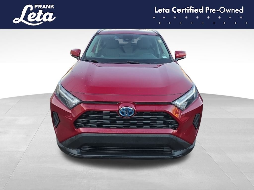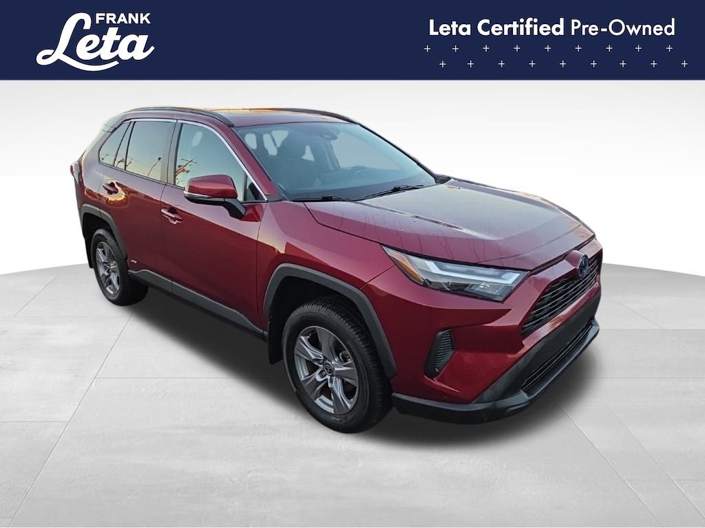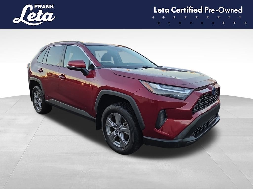 CARFAX One-Owner. 2023 Toyota RAV4 Hybrid XLE Ruby Flare Pearl RAV4 Hybrid XLE, Frank Leta Certified Certified, 2.5L 4-Cylinder, AWD, Ruby Flare Pearl, Black w/Fabric Seat Trim, Exterior Parking Camera Rear, Front dual zone A/C, Fully automatic headlights, Lane Departure Warning System, Wheels: 17" x 7.0J Silver Aluminum Alloy, 4-Wheel Disc Brakes, 6 Speakers, ABS brakes, Air Conditioning, AM/FM radio: SiriusXM, Auto High-beam Headlights, Automatic temperature control, Axle Ratio: TBD, Brake assist, Bumpers: body-color, Delay-off headlights, Driver door bin, Driver vanity mirror, Dual front impact airbags, Dual front side impact airbags, Electronic Stability Control, Emergency communication system: Safety Connect (1-year trial), Fabric Seat Trim, Four wheel independent suspension, Front anti-roll bar, Front Bucket Seats, Front Center Armrest, Front reading lights, Front Sport Seats, Heated door mirrors, Illuminated entry, Knee airbag, Low tire pressure warning, Occupant sensing airbag, Outside temperature display, Overhead airbag, Overhead console, Panic alarm, Passenger door bin, Passenger vanity mirror, Power door mirrors, Power driver seat, Power steering, Power windows, Radio data system, Radio: AM/FM/XM Audio System, Rear anti-roll bar, Rear seat center armrest, Rear window defroster, Rear window wiper, Remote keyless entry, Speed control, Speed-sensing steering, Split folding rear seat, Spoiler, Steering wheel mounted audio controls, Telescoping steering wheel, Tilt steering wheel, Traction control, Trip computer, Turn signal indicator mirrors, Variably intermittent wipers, RAV4 Hybrid XLE, 2.5L 4-Cylinder, AWD, Ruby Flare Pearl, Black w/Fabric Seat Trim, Exterior Parking Camera Rear, Front dual zone A/C, Fully automatic headlights, Lane Departure Warning System, Wheels: 17" x 7.0J Silver Aluminum Alloy. 2.5L 4-Cylinder eCVT AWD 4D Sport Utility 41/38 City/Highway MPG