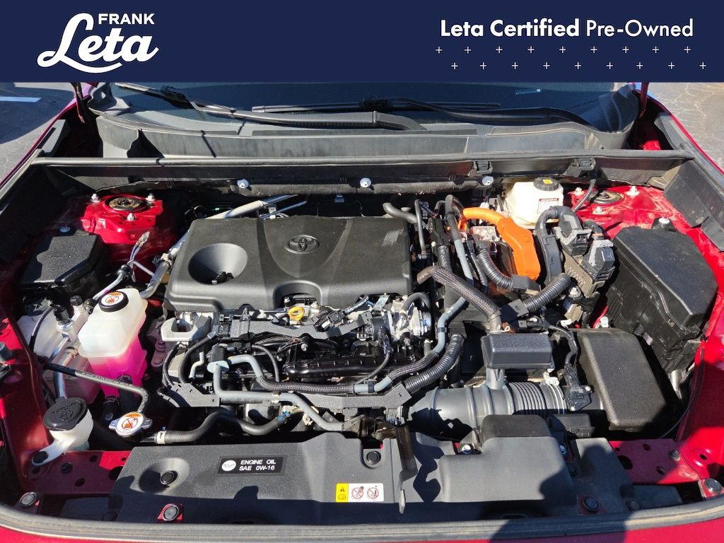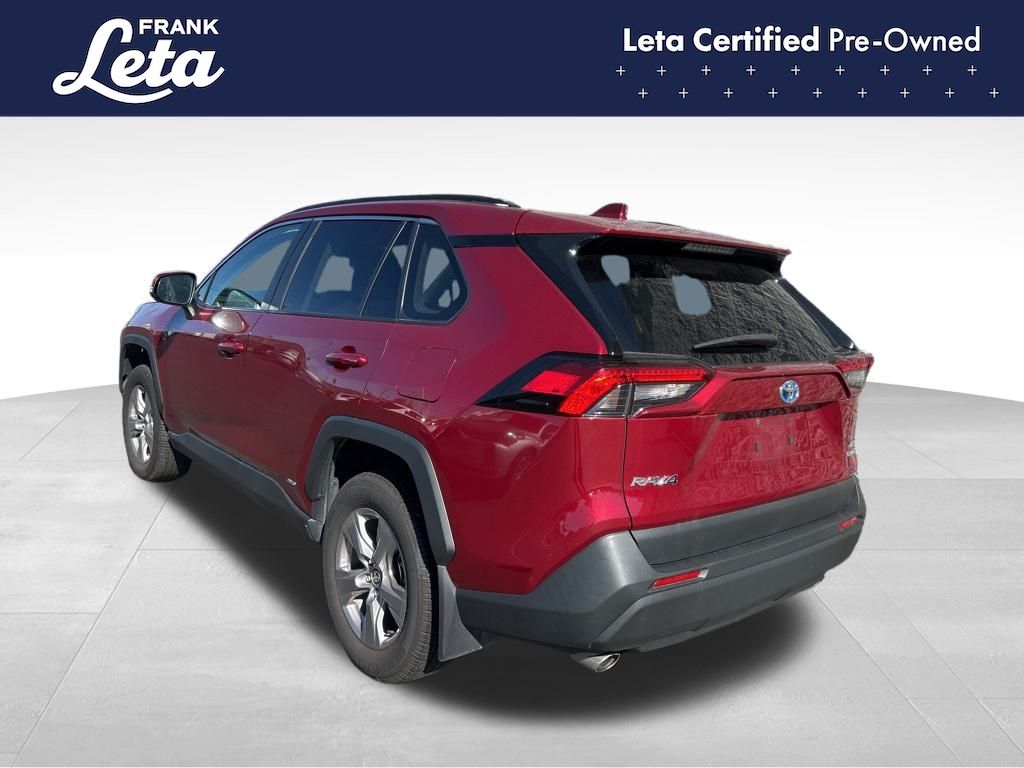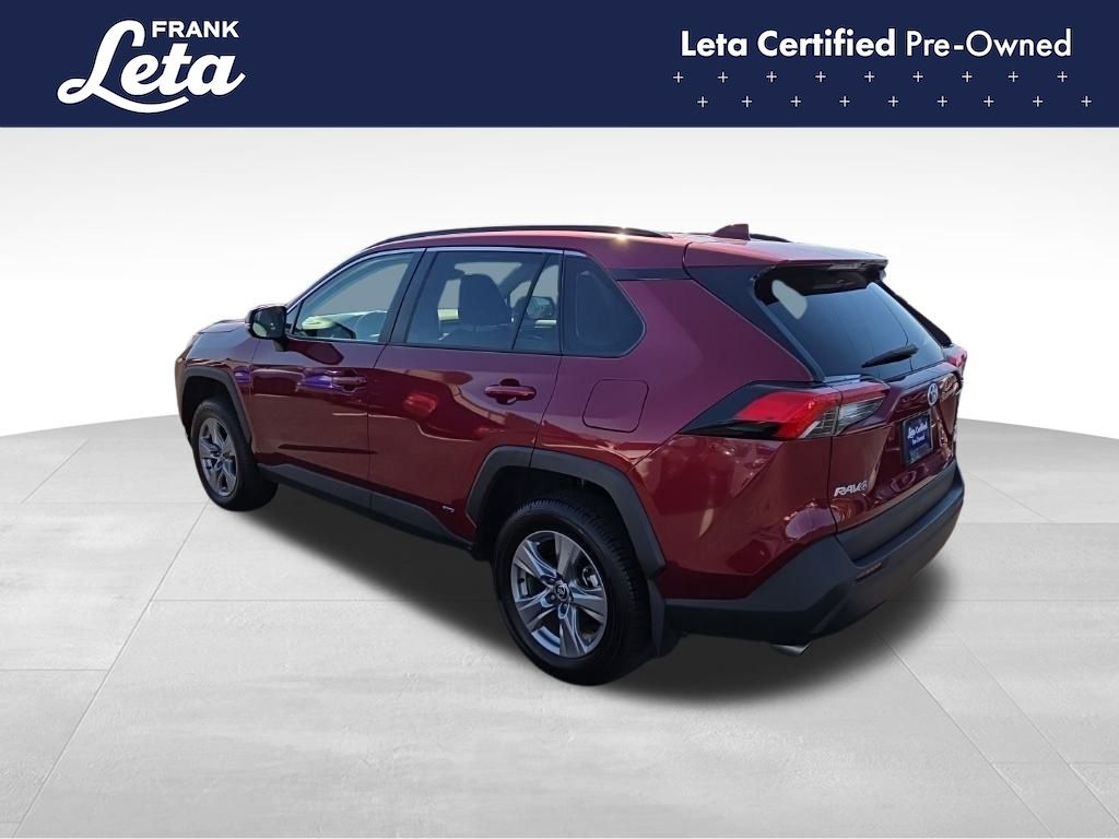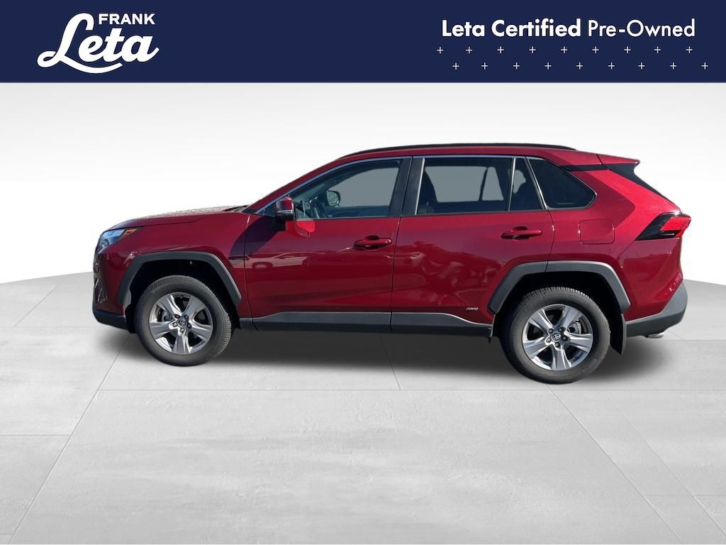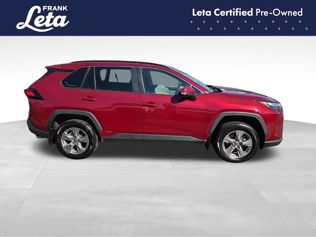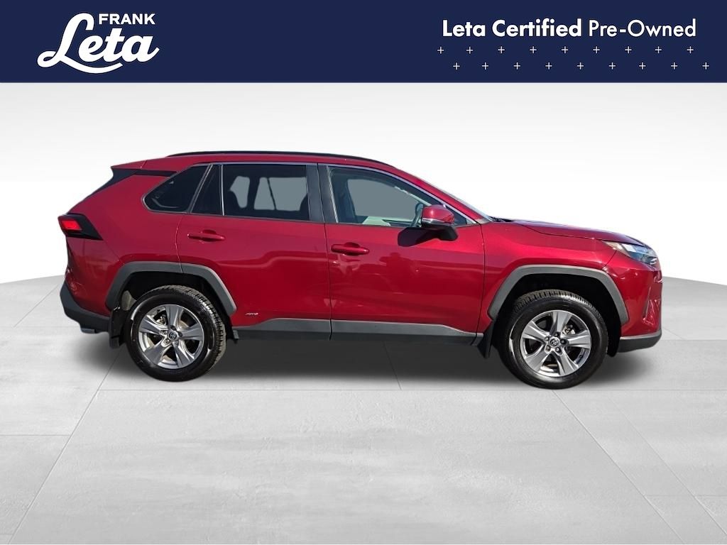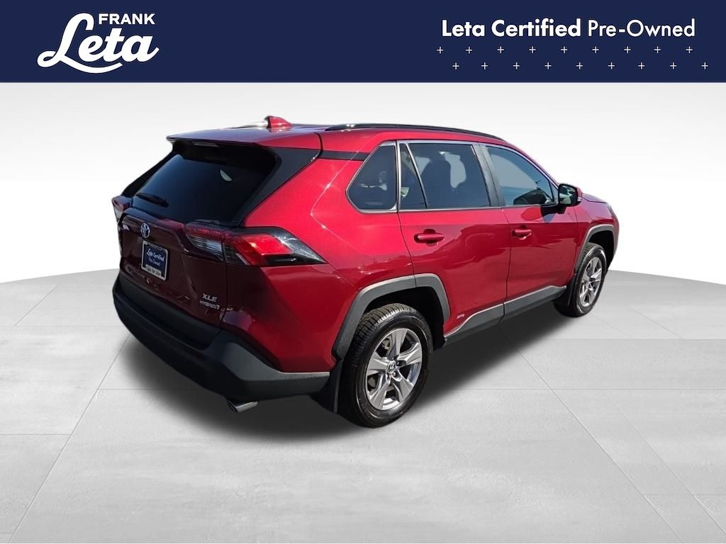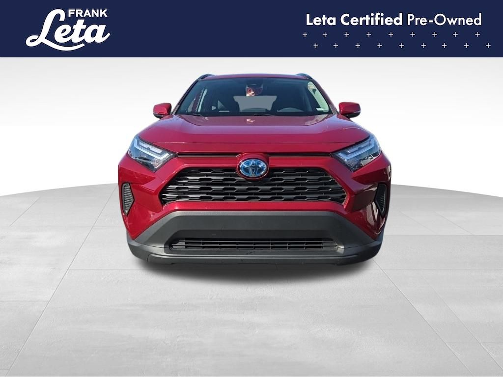 CARFAX One-Owner. 2023 Toyota RAV4 Hybrid XLE Ruby Flare Pearl RAV4 Hybrid XLE, Frank Leta Certified Certified, 2.5L 4-Cylinder, AWD, Ruby Flare Pearl, Black w/Fabric Seat Trim, Exterior Parking Camera Rear, Front dual zone A/C, Fully automatic headlights, Lane Departure Warning System, Wheels: 17" x 7.0J Silver Aluminum Alloy, 4-Wheel Disc Brakes, 6 Speakers, ABS brakes, Air Conditioning, AM/FM radio: SiriusXM, Auto High-beam Headlights, Automatic temperature control, Axle Ratio: TBD, Brake assist, Bumpers: body-color, Delay-off headlights, Driver door bin, Driver vanity mirror, Dual front impact airbags, Dual front side impact airbags, Electronic Stability Control, Emergency communication system: Safety Connect (1-year trial), Fabric Seat Trim, Four wheel independent suspension, Front anti-roll bar, Front Bucket Seats, Front Center Armrest, Front reading lights, Front Sport Seats, Heated door mirrors, Illuminated entry, Knee airbag, Low tire pressure warning, Occupant sensing airbag, Outside temperature display, Overhead airbag, Overhead console, Panic alarm, Passenger door bin, Passenger vanity mirror, Power door mirrors, Power driver seat, Power steering, Power windows, Radio data system, Radio: AM/FM/XM Audio System, Rear anti-roll bar, Rear seat center armrest, Rear window defroster, Rear window wiper, Remote keyless entry, Speed control, Speed-sensing steering, Split folding rear seat, Spoiler, Steering wheel mounted audio controls, Telescoping steering wheel, Tilt steering wheel, Traction control, Trip computer, Turn signal indicator mirrors, Variably intermittent wipers, RAV4 Hybrid XLE, 2.5L 4-Cylinder, AWD, Ruby Flare Pearl, Black w/Fabric Seat Trim, Exterior Parking Camera Rear, Front dual zone A/C, Fully automatic headlights, Lane Departure Warning System, Wheels: 17" x 7.0J Silver Aluminum Alloy. 2.5L 4-Cylinder eCVT AWD 4D Sport Utility 41/38 City/Highway MPG