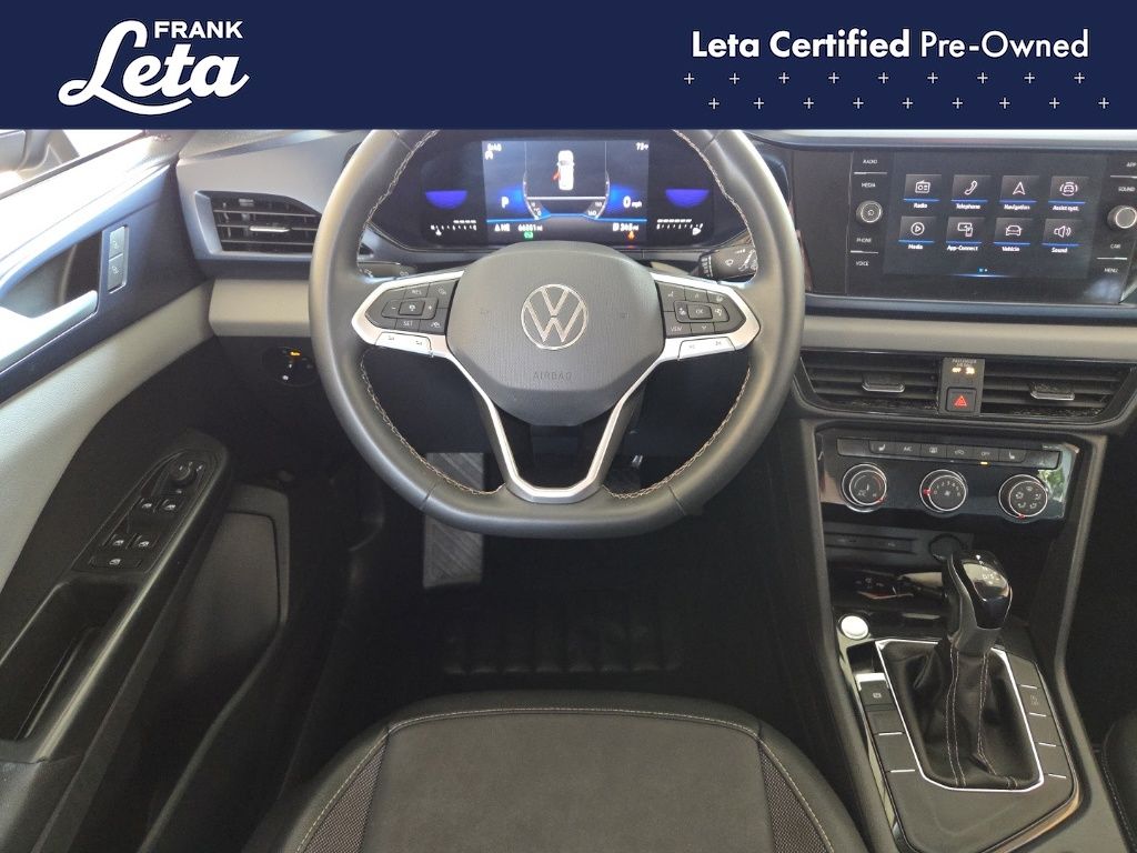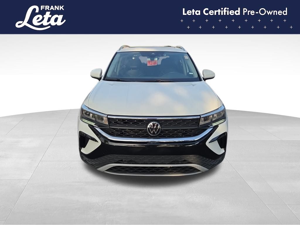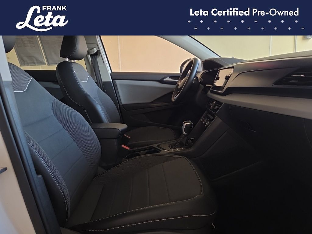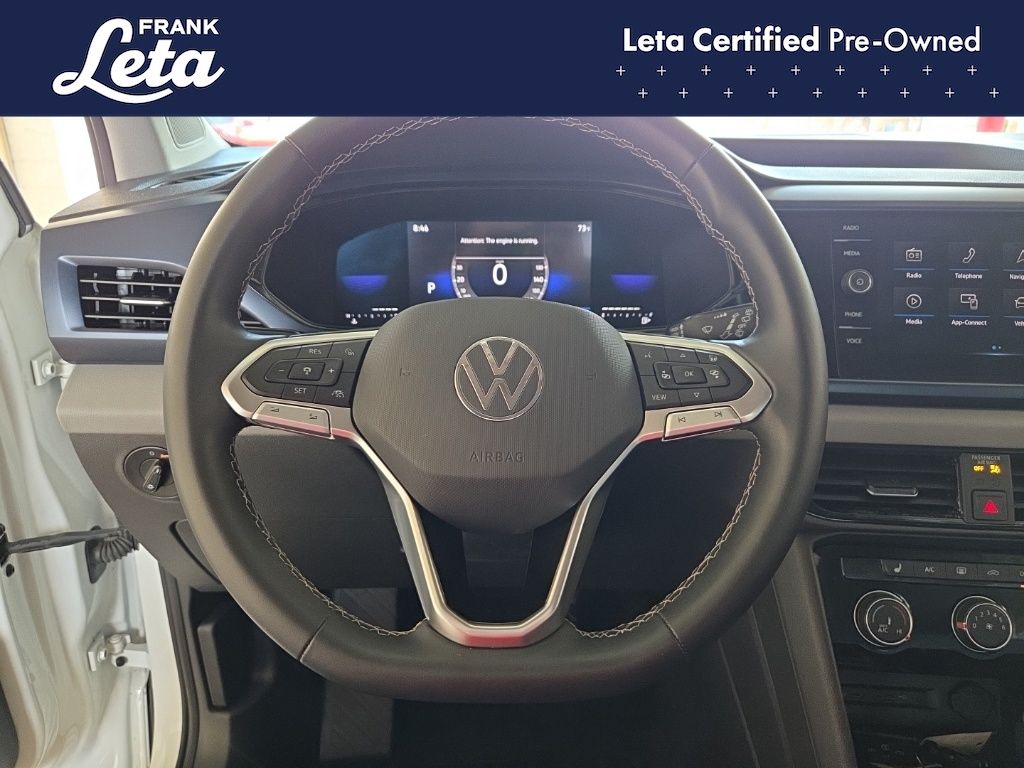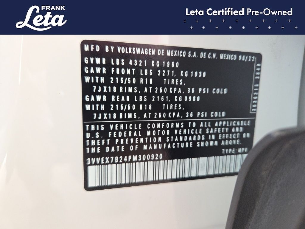 2023 Volkswagen Taos 1.5T SE Pure White Taos 1.5T SE, Frank Leta Certified Certified, 1.5L I4 Turbocharged DOHC 16V LEV3-SULEV30 158hp, Pure White, Black w/CloudTex & Cloth Seating Surfaces, Exterior Parking Camera Rear, Fully automatic headlights, Heated front seats, Wheels: 18" 2-Tone Machined Alloy, 3.23 Axle Ratio, 4-Wheel Disc Brakes, 6 Speakers, ABS brakes, Active Blind Spot Monitor, Air Conditioning, AM/FM radio: SiriusXM with 360L, Auto High-beam Headlights, Brake assist, Bumpers: body-color, CloudTex & Cloth Seating Surfaces, Compass, Delay-off headlights, Driver door bin, Driver vanity mirror, Dual front impact airbags, Dual front side impact airbags, Electronic Stability Control, Emergency communication system: VW Car-Net Safe & Secure 5-year, Front anti-roll bar, Front Bucket Seats, Front Center Armrest, Front reading lights, Front Strut Rear Torsion Beam Suspension, Front wheel independent suspension, Heated door mirrors, Heated Front Comfort Seats, Heated steering wheel, Illuminated entry, Leather Shift Knob, Low tire pressure warning, Occupant sensing airbag, Outside temperature display, Overhead airbag, Overhead console, Panic alarm, Passenger door bin, Passenger vanity mirror, Power door mirrors, Power driver seat, Power steering, Power windows, Radio data system, Radio: MIB3 Composition Media AM/FM/HD, Rain sensing wipers, Rear anti-roll bar, Rear seat center armrest, Rear window defroster, Rear window wiper, Remote keyless entry, Roof rack: rails only, Security system, Speed control, Speed-sensing steering, Split folding rear seat, Spoiler, Steering wheel mounted audio controls, Tachometer, Telescoping steering wheel, Tilt steering wheel, Traction control, Trip computer, Variably intermittent wipers, Taos 1.5T SE, 1.5L I4 Turbocharged DOHC 16V LEV3-SULEV30 158hp, Pure White, Black w/CloudTex & Cloth Seating Surfaces, Exterior Parking Camera Rear, Fully automatic headlights, Heated front seats, Wheels: 18" 2-Tone Machined Alloy. 1.5L I4 Turbocharged DOHC 16V LEV3-SULEV30 158hp 8-Speed Automatic with Tiptronic FWD 4D Sport Utility 28/36 City/Highway MPG