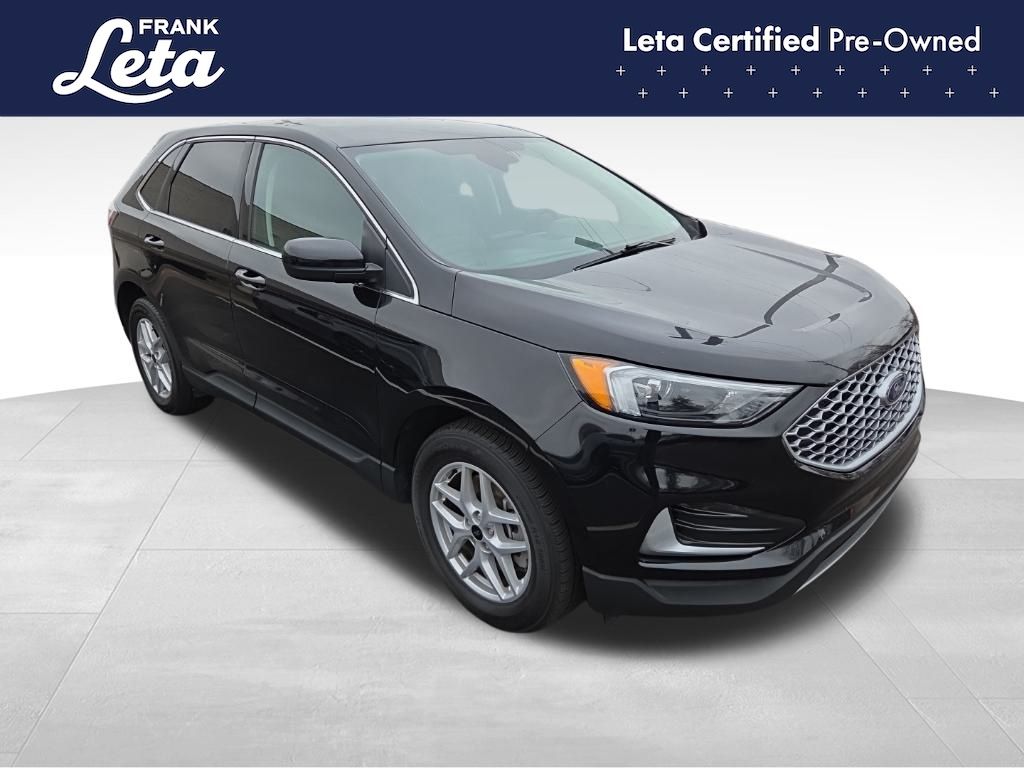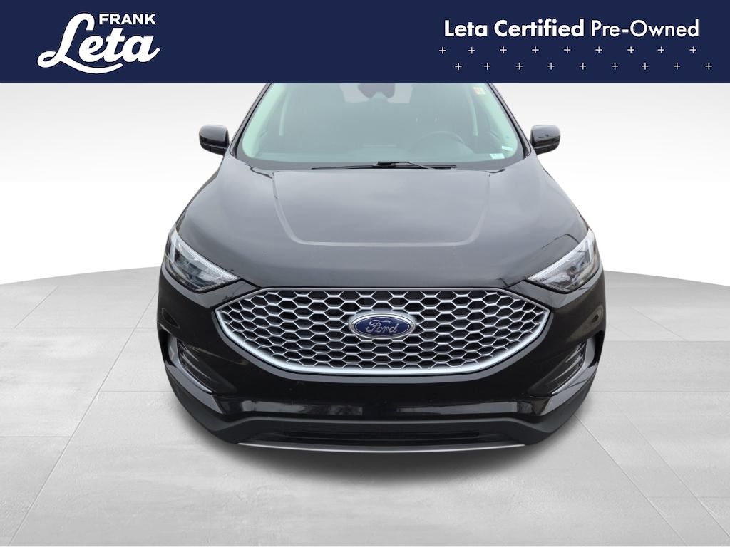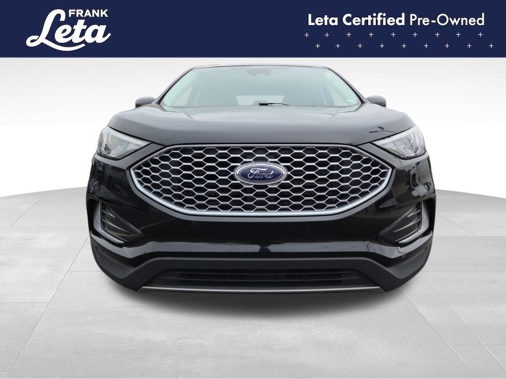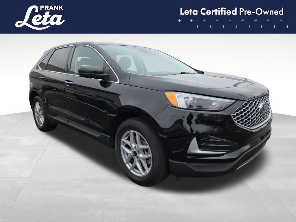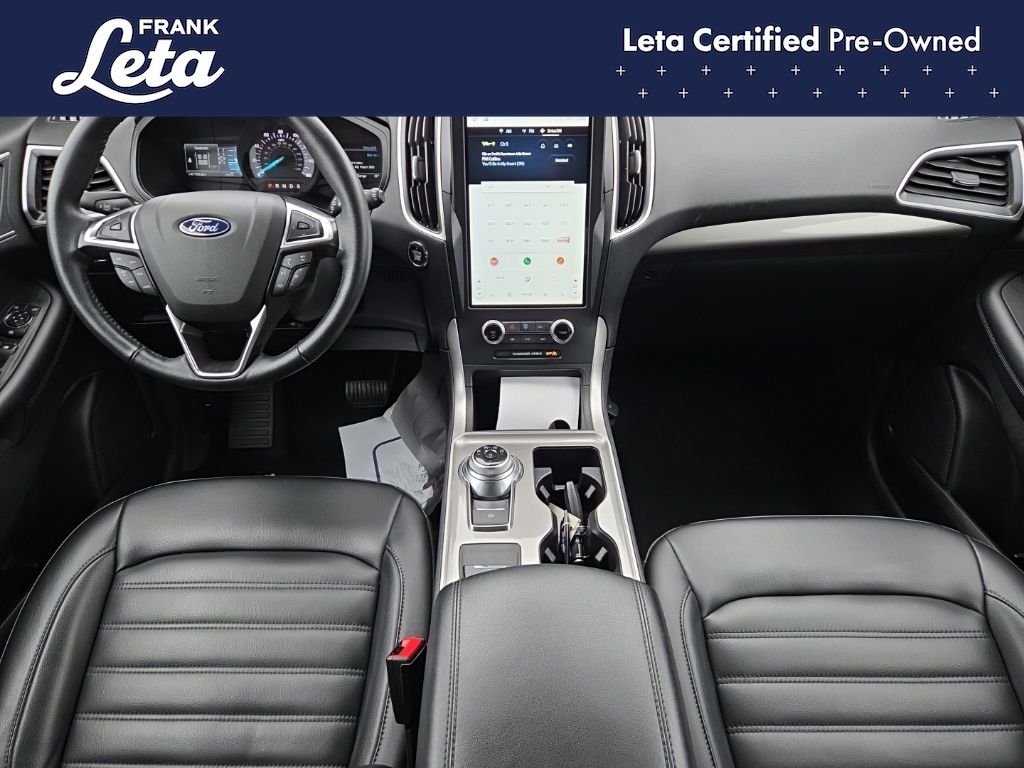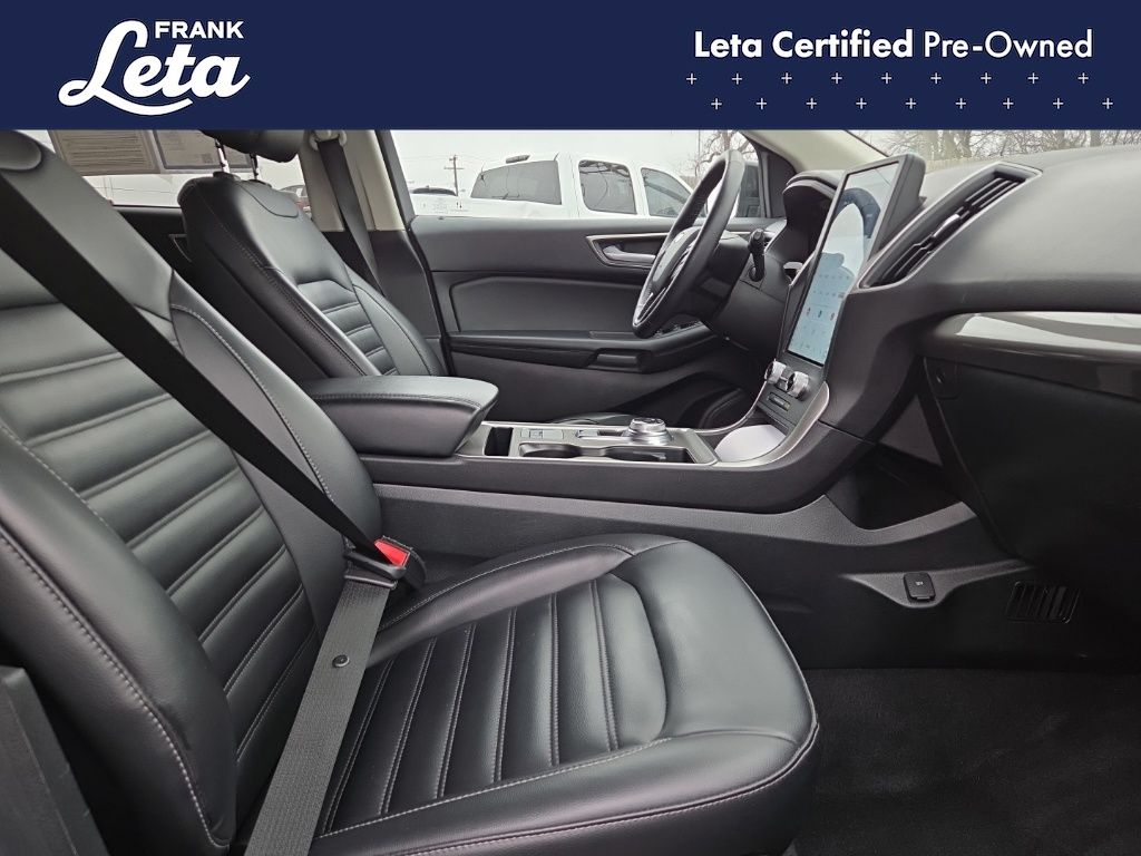 CARFAX One-Owner. 2024 Ford Edge SEL Black Metallic Edge SEL, Frank Leta Certified Certified, EcoBoost 2.0L I4 GTDi DOHC Turbocharged VCT, AWD, Black Metallic, Ebony w/ActiveX Trimmed Heated Bucket Seats, ActiveX Trimmed Heated Bucket Seats, Auto-dimming Rear-View mirror, Front dual zone A/C, Fully automatic headlights, Heated door mirrors, Heated front seats, Leather steering wheel, Power Liftgate, Rear Parking Sensors, Wheels: 18" Sparkle Silver-Painted Aluminum, 3.80 Axle Ratio, 4-Wheel Disc Brakes, 6 Speakers, ABS brakes, Air Conditioning, AM/FM radio: SiriusXM with 360L, AM/FM Stereo, Auto High-beam Headlights, Automatic temperature control, Brake assist, Bumpers: body-color, Compass, Delay-off headlights, Driver door bin, Driver vanity mirror, Dual front impact airbags, Dual front side impact airbags, Electronic Stability Control, Emergency communication system: SYNC 4 911 Assist, FordPass Connect, Four wheel independent suspension, Front anti-roll bar, Front Bucket Seats, Front Center Armrest w/Storage, Front reading lights, Illuminated entry, Knee airbag, Low tire pressure warning, Occupant sensing airbag, Outside temperature display, Overhead airbag, Overhead console, Panic alarm, Passenger door bin, Passenger vanity mirror, Power door mirrors, Power driver seat, Power passenger seat, Power steering, Power windows, Rear anti-roll bar, Rear reading lights, Rear seat center armrest, Rear window defroster, Rear window wiper, Remote keyless entry, SiriusXM w/360L, Speed control, Speed-Sensitive Wipers, Split folding rear seat, Spoiler, Steering wheel mounted audio controls, SYNC 4A w/Enhanced Voice Recognition, Tachometer, Telescoping steering wheel, Tilt steering wheel, Traction control, Trip computer, Variably intermittent wipers, Edge SEL, EcoBoost 2.0L I4 GTDi DOHC Turbocharged VCT, AWD, Black Metallic, Ebony w/ActiveX Trimmed Heated Bucket Seats, ActiveX Trimmed Heated Bucket Seats, Auto-dimming Rear-View mirror, Front dual zone A/C, Fully automatic headlights, Heated door mirrors, Heated front seats, Leather steering wheel, Power Liftgate, Rear Parking Sensors, Wheels: 18" Sparkle Silver-Painted Aluminum. EcoBoost 2.0L I4 GTDi DOHC Turbocharged VCT 8-Speed Automatic AWD 4D Sport Utility 21/28 City/Highway MPG