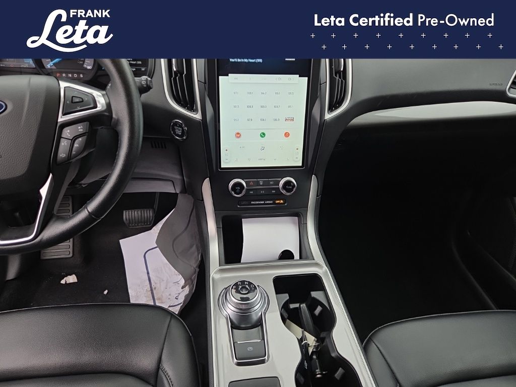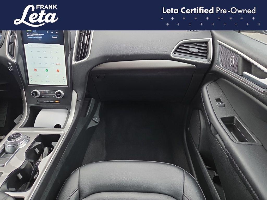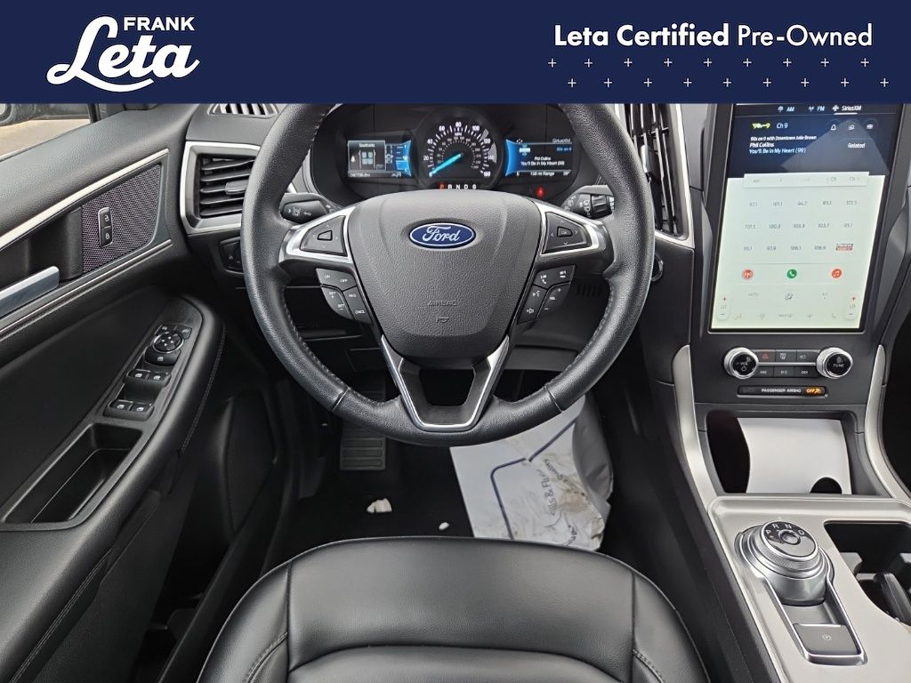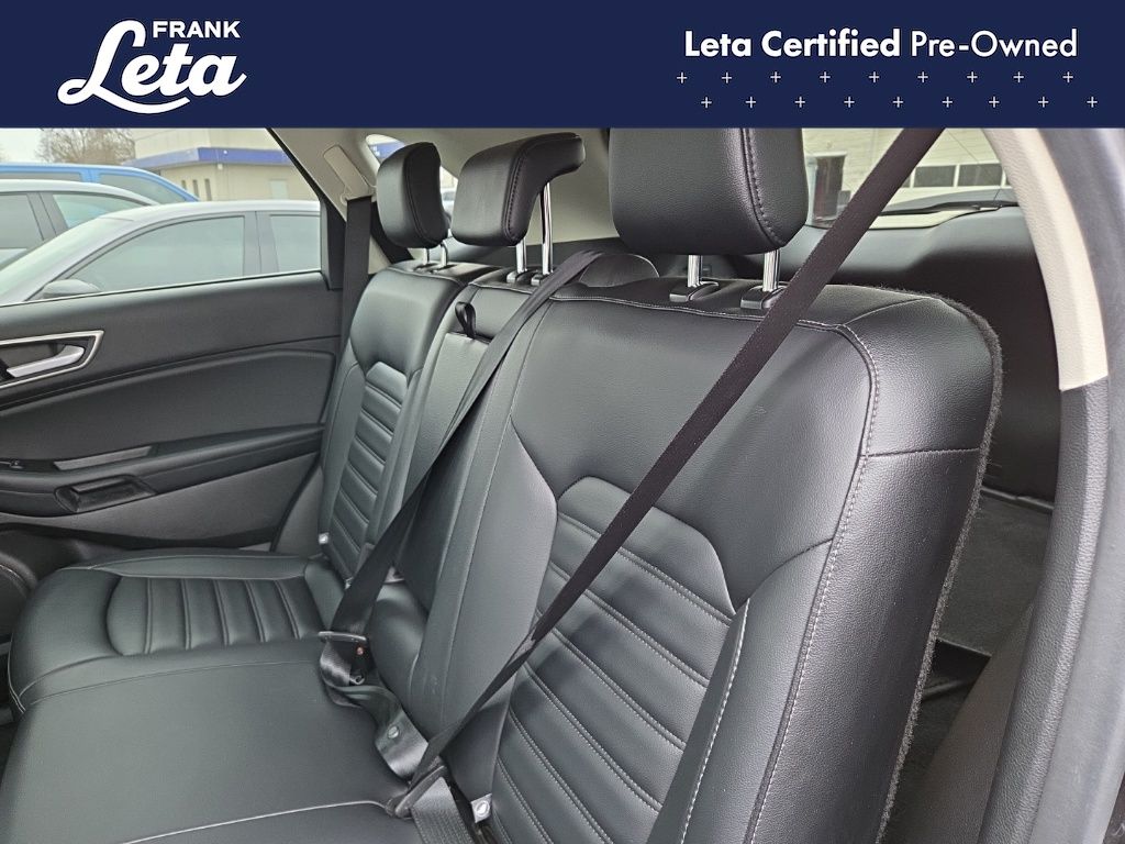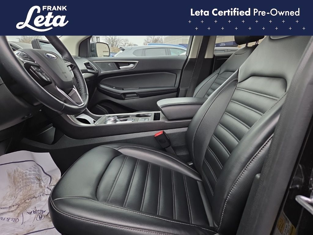 CARFAX One-Owner. 2024 Ford Edge SEL Black Metallic Edge SEL, Frank Leta Certified Certified, EcoBoost 2.0L I4 GTDi DOHC Turbocharged VCT, AWD, Black Metallic, Ebony w/ActiveX Trimmed Heated Bucket Seats, ActiveX Trimmed Heated Bucket Seats, Auto-dimming Rear-View mirror, Front dual zone A/C, Fully automatic headlights, Heated door mirrors, Heated front seats, Leather steering wheel, Power Liftgate, Rear Parking Sensors, Wheels: 18" Sparkle Silver-Painted Aluminum, 3.80 Axle Ratio, 4-Wheel Disc Brakes, 6 Speakers, ABS brakes, Air Conditioning, AM/FM radio: SiriusXM with 360L, AM/FM Stereo, Auto High-beam Headlights, Automatic temperature control, Brake assist, Bumpers: body-color, Compass, Delay-off headlights, Driver door bin, Driver vanity mirror, Dual front impact airbags, Dual front side impact airbags, Electronic Stability Control, Emergency communication system: SYNC 4 911 Assist, FordPass Connect, Four wheel independent suspension, Front anti-roll bar, Front Bucket Seats, Front Center Armrest w/Storage, Front reading lights, Illuminated entry, Knee airbag, Low tire pressure warning, Occupant sensing airbag, Outside temperature display, Overhead airbag, Overhead console, Panic alarm, Passenger door bin, Passenger vanity mirror, Power door mirrors, Power driver seat, Power passenger seat, Power steering, Power windows, Rear anti-roll bar, Rear reading lights, Rear seat center armrest, Rear window defroster, Rear window wiper, Remote keyless entry, SiriusXM w/360L, Speed control, Speed-Sensitive Wipers, Split folding rear seat, Spoiler, Steering wheel mounted audio controls, SYNC 4A w/Enhanced Voice Recognition, Tachometer, Telescoping steering wheel, Tilt steering wheel, Traction control, Trip computer, Variably intermittent wipers, Edge SEL, EcoBoost 2.0L I4 GTDi DOHC Turbocharged VCT, AWD, Black Metallic, Ebony w/ActiveX Trimmed Heated Bucket Seats, ActiveX Trimmed Heated Bucket Seats, Auto-dimming Rear-View mirror, Front dual zone A/C, Fully automatic headlights, Heated door mirrors, Heated front seats, Leather steering wheel, Power Liftgate, Rear Parking Sensors, Wheels: 18" Sparkle Silver-Painted Aluminum. EcoBoost 2.0L I4 GTDi DOHC Turbocharged VCT 8-Speed Automatic AWD 4D Sport Utility 21/28 City/Highway MPG