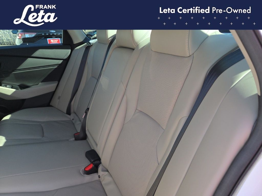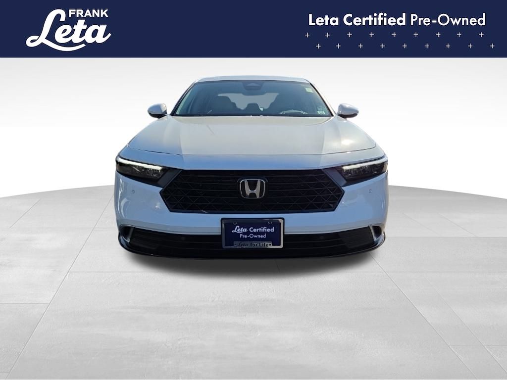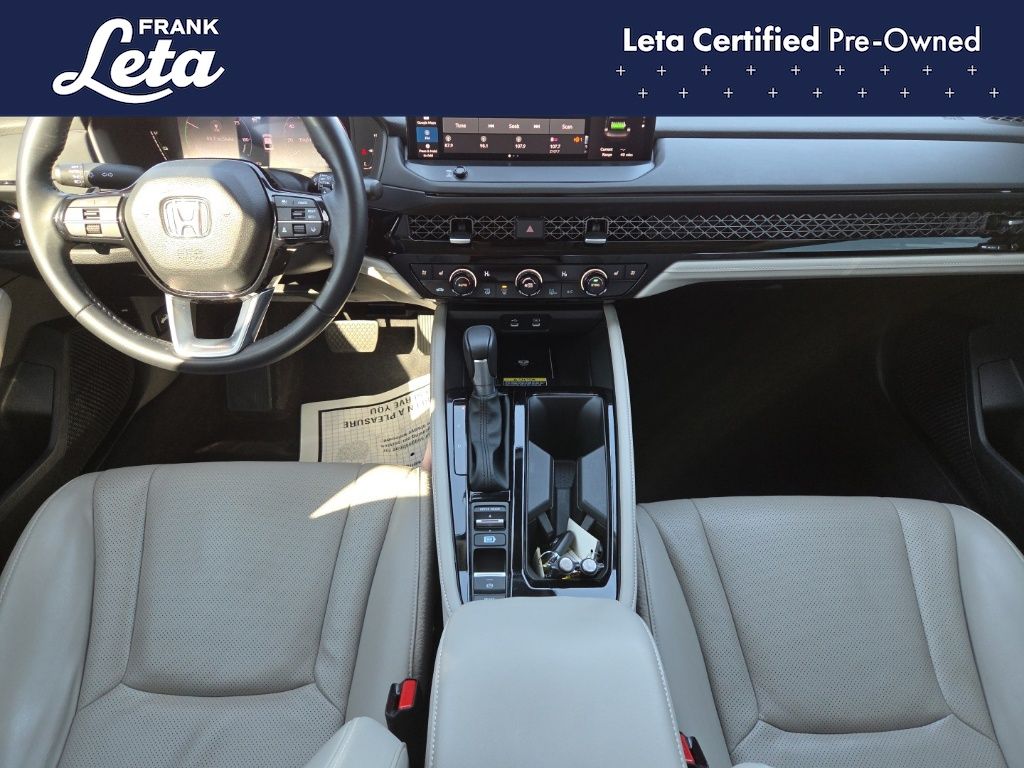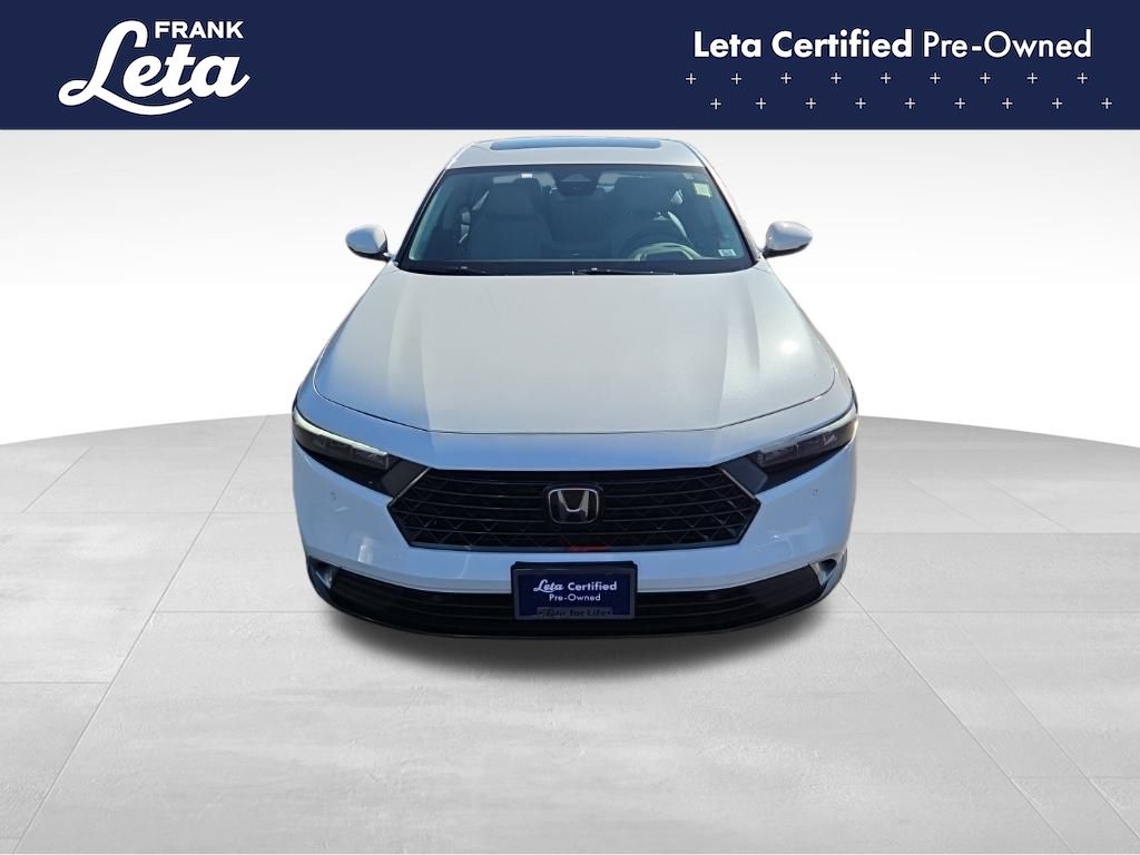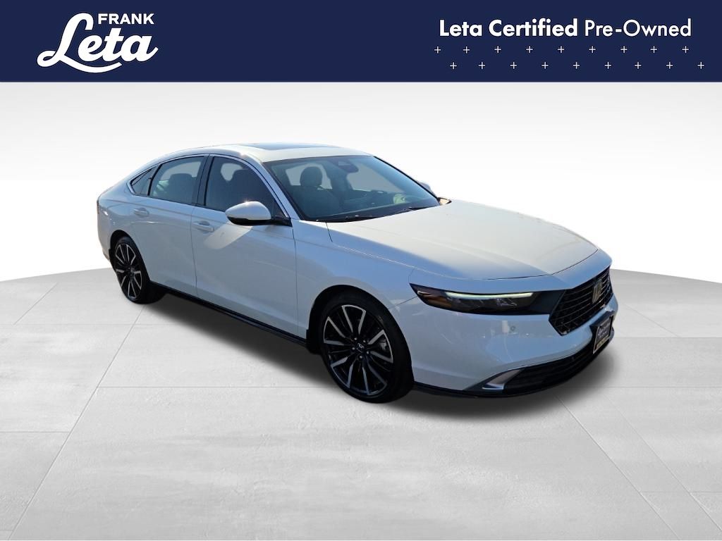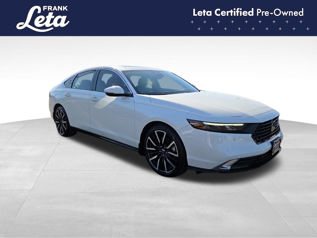 CARFAX One-Owner. 2024 Honda Accord Hybrid Touring Platinum White Pearl Accord Hybrid Touring, Frank Leta Certified Certified, 2.0L 16V DOHC, Platinum White Pearl, Gray w/Leather-Trimmed Seat Trim, Adaptive Cruise Control: Adaptive Cruise Control (ACC) with Low-Speed Follow, Apple CarPlay/Android Auto, Auto-dimming Rear-View mirror, Blind Spot Information (BSI) System warning, Bose Premium Sound System, Exterior Parking Camera Rear, Front dual zone A/C, Fully automatic headlights, Heads-Up Display, Heated front seats, Heated rear seats, Lane departure: Lane Keeping Assist System (LKAS) active, Memory seat, Navigation System, Power moonroof, Ventilated front seats, Wheels: 19" x 8.5J Berlina Black, 12 Speakers, 4-Wheel Disc Brakes, ABS brakes, Adaptive suspension, Air Conditioning, AM/FM radio, Auto High-beam Headlights, Automatic temperature control, Brake assist, Bumpers: body-color, Compass, Delay-off headlights, Driver door bin, Driver vanity mirror, Dual front impact airbags, Dual front side impact airbags, Electronic Stability Control, Emergency communication system: HondaLink, Four wheel independent suspension, Front anti-roll bar, Front Bucket Seats, Front Center Armrest, Front reading lights, Heated & Ventilated Front Bucket Seats, Heated door mirrors, Illuminated entry, Knee airbag, Leather Shift Knob, Leather steering wheel, Leather-Trimmed Seat Trim, Low tire pressure warning, Occupant sensing airbag, Outside temperature display, Overhead airbag, Overhead console, Panic alarm, Passenger door bin, Passenger vanity mirror, Power door mirrors, Power driver seat, Power passenger seat, Power steering, Power windows, Radio data system, Rain sensing wipers, Rear anti-roll bar, Rear reading lights, Rear seat center armrest, Rear side impact airbag, Rear window defroster, Remote keyless entry, Security system, Speed control, Speed-sensing steering, Speed-Sensitive Wipers, Split folding rear seat, Steering wheel mounted audio controls, Telescoping steering wheel, Tilt steering wheel, Traction control, Trip computer, Turn signal indicator mirrors, Variably intermittent wipers, Accord Hybrid Touring, 2.0L 16V DOHC, Platinum White Pearl, Black w/Leather-Trimmed Seat Trim, Adaptive Cruise Control: Adaptive Cruise Control (ACC) with Low-Speed Follow, Apple CarPlay/Android Auto, Auto-dimming Rear-View mirror, Blind Spot Information (BSI) System warning, Bose Premium Sound System, Exterior Parking Camera Rear, Front dual zone A/C, Fully automatic headlights, Heads-Up Display, Heated front seats, Heated rear seats, Lane departure: Lane Keeping Assist System (LKAS) active, Memory seat, Navigation System, Power moonroof, Ventilated front seats, Wheels: 19" x 8.5J Berlina Black. 2.0L 16V DOHC eCVT FWD 4D Sedan 46/41 City/Highway MPG