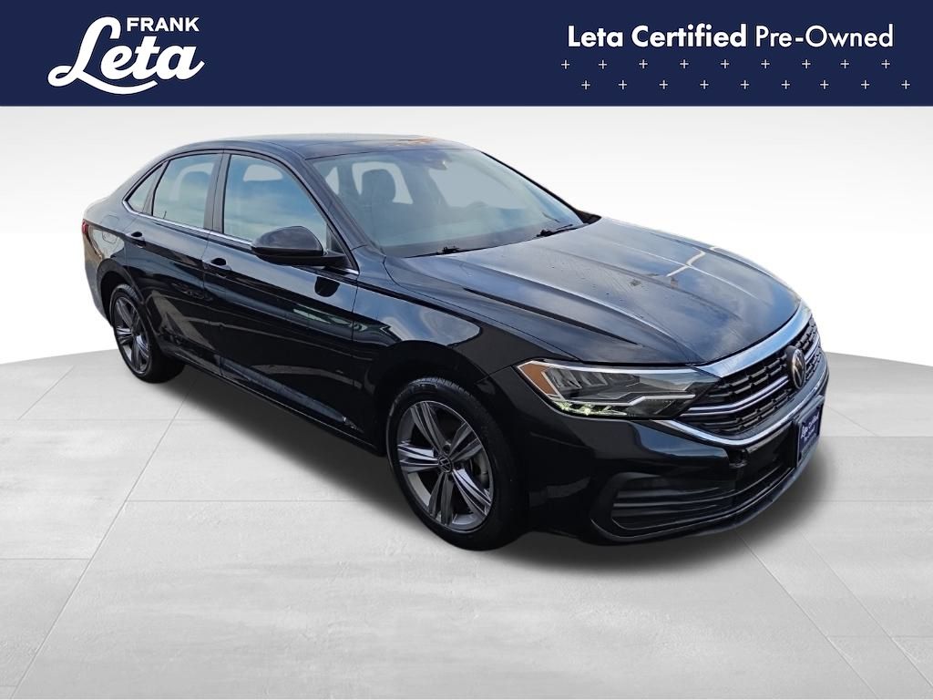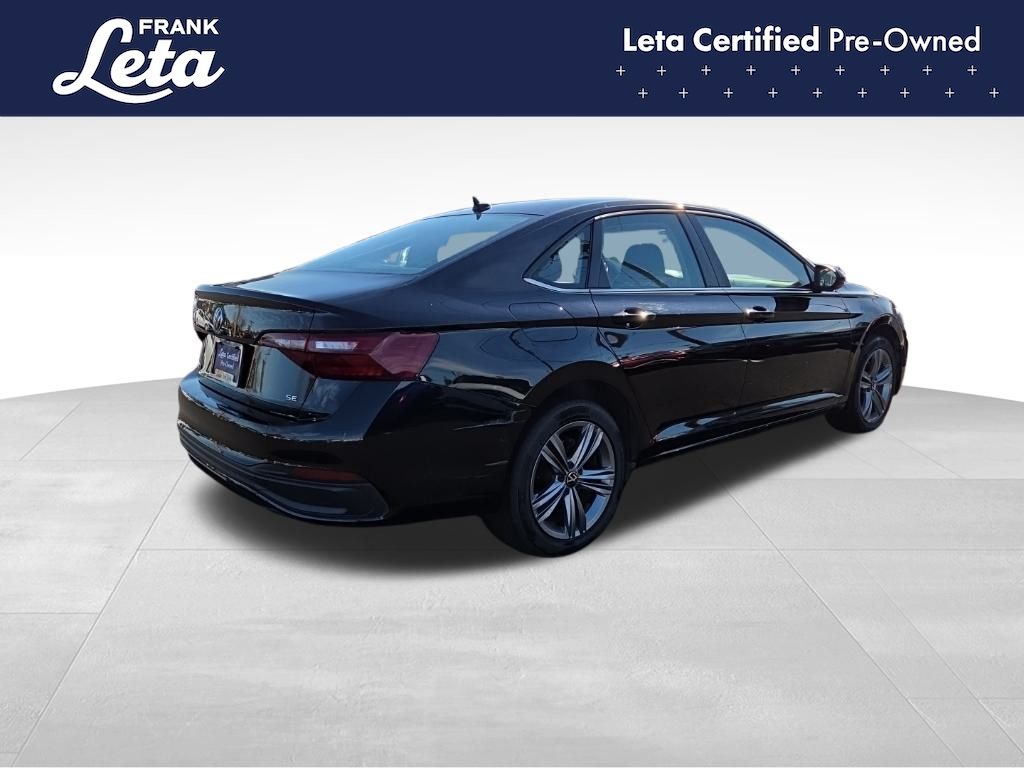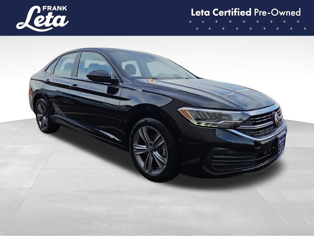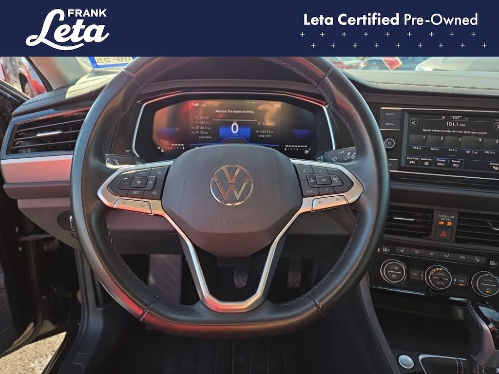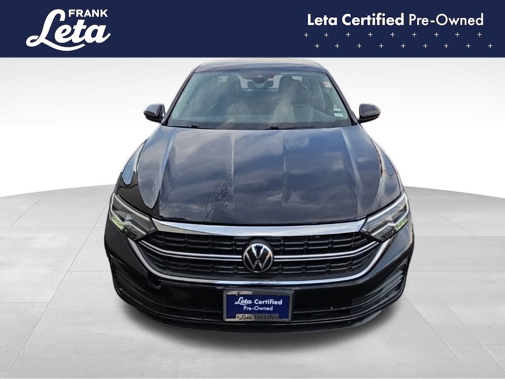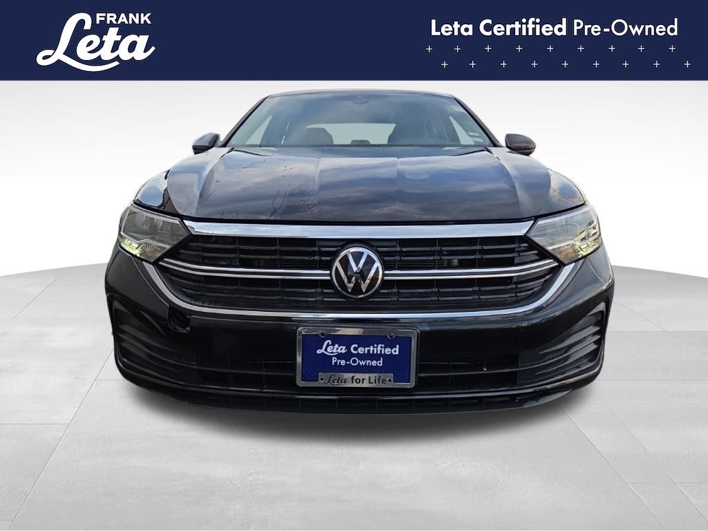 CARFAX One-Owner. 2024 Volkswagen Jetta 1.5T SE Deep Black Pearl Jetta 1.5T SE, Frank Leta Certified Certified, 1.5L I-4 DI DOHC Turbocharged, 8-Speed Automatic with Tiptronic, Deep Black Pearl, Titan Black w/V-Tex Leatherette Seat Trim, Auto-dimming Rear-View mirror, Exterior Parking Camera Rear, Front dual zone A/C, Fully automatic headlights, Heated Front Seats, V-Tex Leatherette Seat Trim, Wheels: 17" Twin 5-Spoke Silver Painted Alloy, 4 Speakers, 4-Wheel Disc Brakes, ABS brakes, Active Blind Spot Monitor, Air Conditioning, Automatic temperature control, Brake assist, Bumpers: body-color, Delay-off headlights, Driver door bin, Driver vanity mirror, Dual front impact airbags, Dual front side impact airbags, Electronic Stability Control, Emergency communication system: VW Car-Net Safe & Secure 5-year, Front anti-roll bar, Front Bucket Seats, Front Center Armrest, Front wheel independent suspension, Heated door mirrors, Heated front seats, Illuminated entry, Leather Shift Knob, Leather steering wheel, Low tire pressure warning, Occupant sensing airbag, Outside temperature display, Overhead airbag, Overhead console, Panic alarm, Passenger door bin, Passenger vanity mirror, Power door mirrors, Power driver seat, Power steering, Power windows, Radio data system, Radio: MIB3 Composition Color w/6.5" Touchscreen, Rain sensing wipers, Rear anti-roll bar, Rear reading lights, Rear seat center armrest, Rear window defroster, Remote keyless entry, Speed control, Speed-sensing steering, Split folding rear seat, Steering wheel mounted audio controls, Tachometer, Telescoping steering wheel, Tilt steering wheel, Traction control, Trip computer, Variably intermittent wipers, Jetta 1.5T SE, 1.5L I-4 DI DOHC Turbocharged, 8-Speed Automatic with Tiptronic, Deep Black Pearl, Titan Black w/V-Tex Leatherette Seat Trim, Auto-dimming Rear-View mirror, Exterior Parking Camera Rear, Front dual zone A/C, Fully automatic headlights, Heated Front Seats, V-Tex Leatherette Seat Trim, Wheels: 17" Twin 5-Spoke Silver Painted Alloy. 1.5L I-4 DI DOHC Turbocharged 8-Speed Automatic with Tiptronic FWD 4D Sedan 29/40 City/Highway MPG