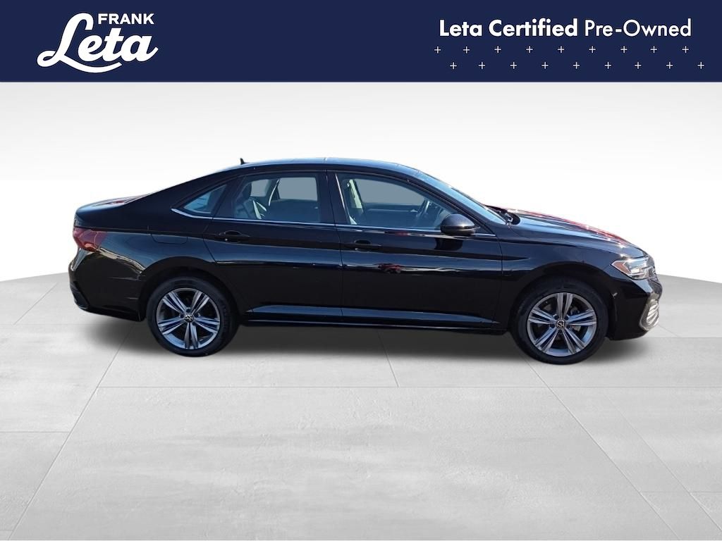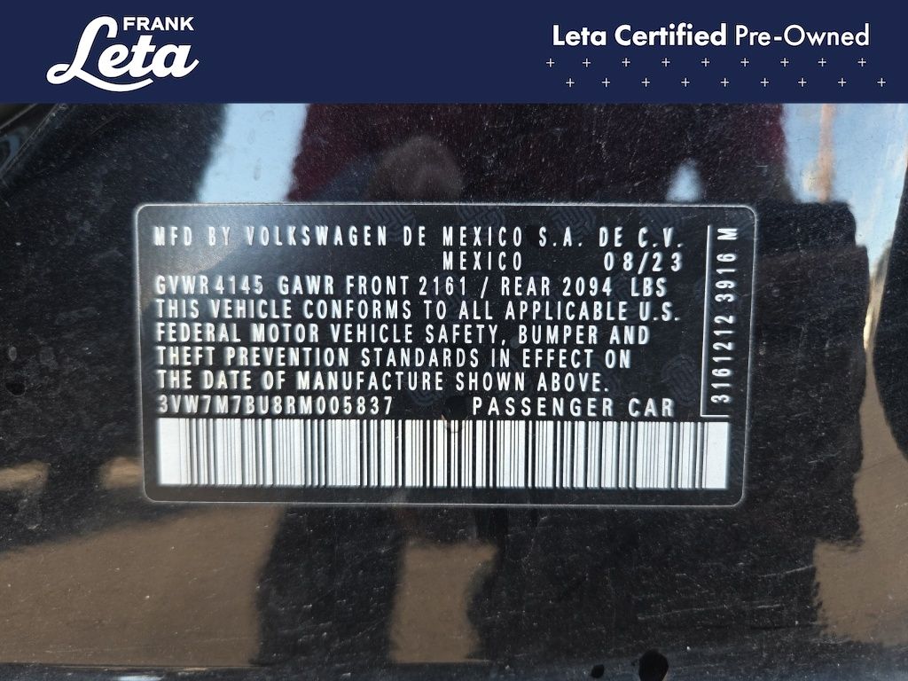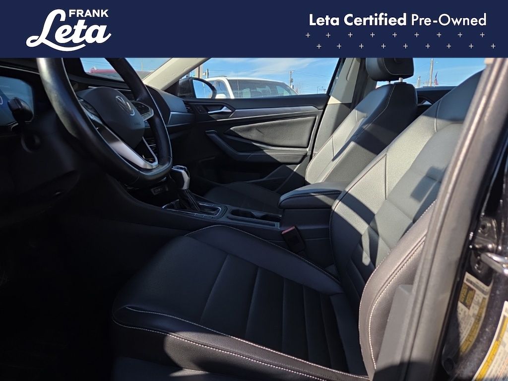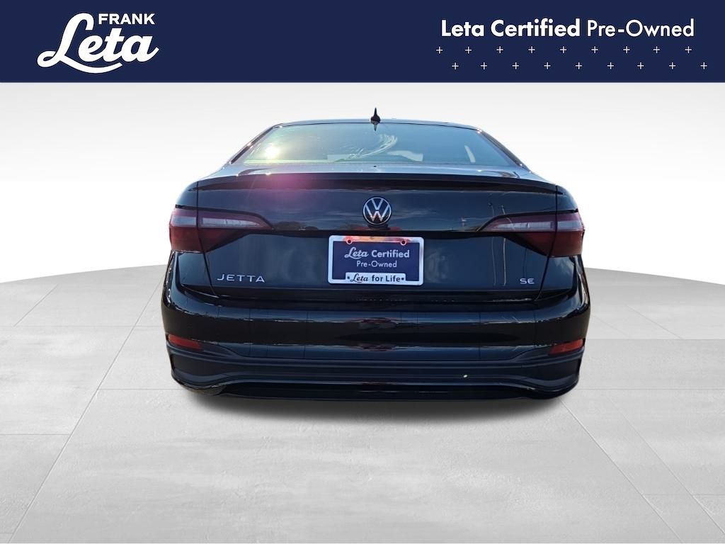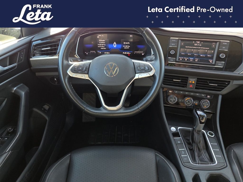 CARFAX One-Owner. 2024 Volkswagen Jetta 1.5T SE Deep Black Pearl Jetta 1.5T SE, Frank Leta Certified Certified, 1.5L I-4 DI DOHC Turbocharged, 8-Speed Automatic with Tiptronic, Deep Black Pearl, Titan Black w/V-Tex Leatherette Seat Trim, Auto-dimming Rear-View mirror, Exterior Parking Camera Rear, Front dual zone A/C, Fully automatic headlights, Heated Front Seats, V-Tex Leatherette Seat Trim, Wheels: 17" Twin 5-Spoke Silver Painted Alloy, 4 Speakers, 4-Wheel Disc Brakes, ABS brakes, Active Blind Spot Monitor, Air Conditioning, Automatic temperature control, Brake assist, Bumpers: body-color, Delay-off headlights, Driver door bin, Driver vanity mirror, Dual front impact airbags, Dual front side impact airbags, Electronic Stability Control, Emergency communication system: VW Car-Net Safe & Secure 5-year, Front anti-roll bar, Front Bucket Seats, Front Center Armrest, Front wheel independent suspension, Heated door mirrors, Heated front seats, Illuminated entry, Leather Shift Knob, Leather steering wheel, Low tire pressure warning, Occupant sensing airbag, Outside temperature display, Overhead airbag, Overhead console, Panic alarm, Passenger door bin, Passenger vanity mirror, Power door mirrors, Power driver seat, Power steering, Power windows, Radio data system, Radio: MIB3 Composition Color w/6.5" Touchscreen, Rain sensing wipers, Rear anti-roll bar, Rear reading lights, Rear seat center armrest, Rear window defroster, Remote keyless entry, Speed control, Speed-sensing steering, Split folding rear seat, Steering wheel mounted audio controls, Tachometer, Telescoping steering wheel, Tilt steering wheel, Traction control, Trip computer, Variably intermittent wipers, Jetta 1.5T SE, 1.5L I-4 DI DOHC Turbocharged, 8-Speed Automatic with Tiptronic, Deep Black Pearl, Titan Black w/V-Tex Leatherette Seat Trim, Auto-dimming Rear-View mirror, Exterior Parking Camera Rear, Front dual zone A/C, Fully automatic headlights, Heated Front Seats, V-Tex Leatherette Seat Trim, Wheels: 17" Twin 5-Spoke Silver Painted Alloy. 1.5L I-4 DI DOHC Turbocharged 8-Speed Automatic with Tiptronic FWD 4D Sedan 29/40 City/Highway MPG