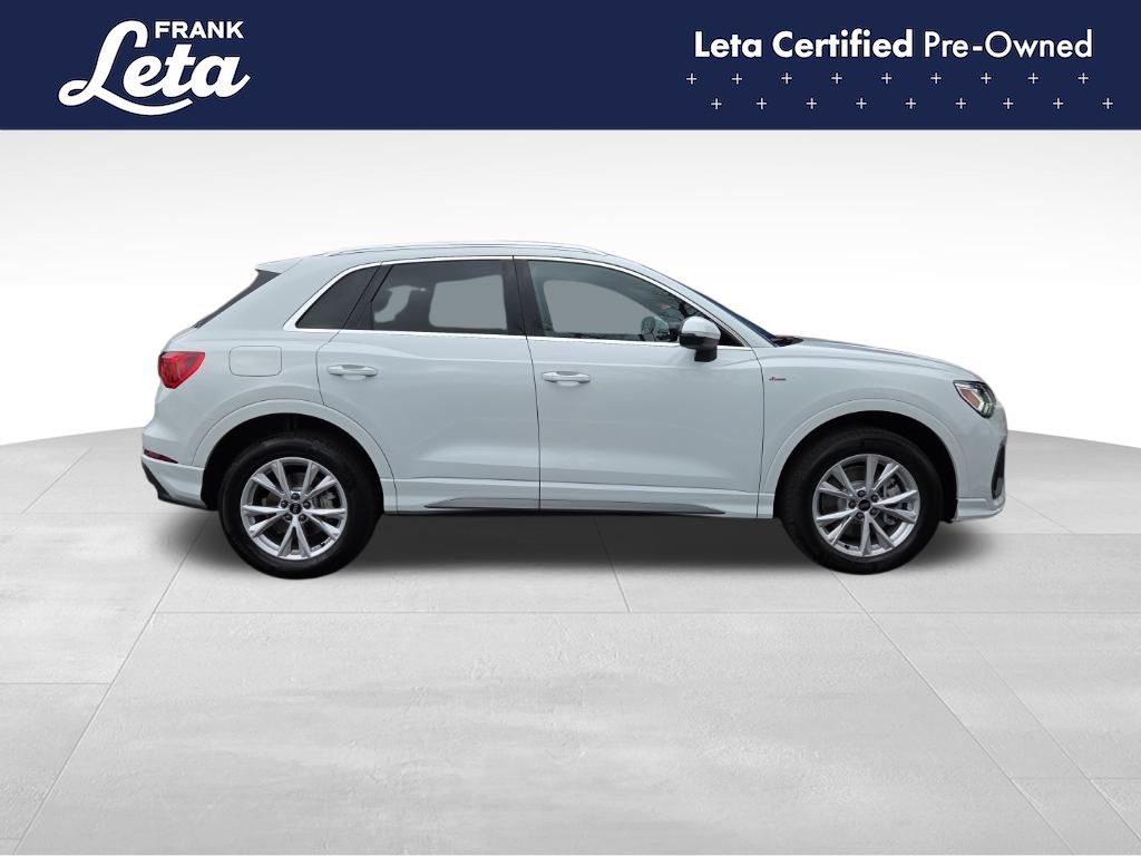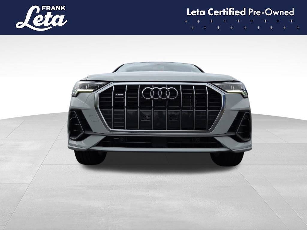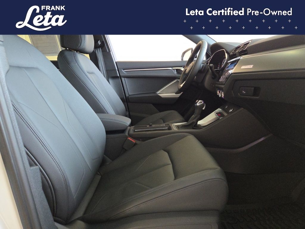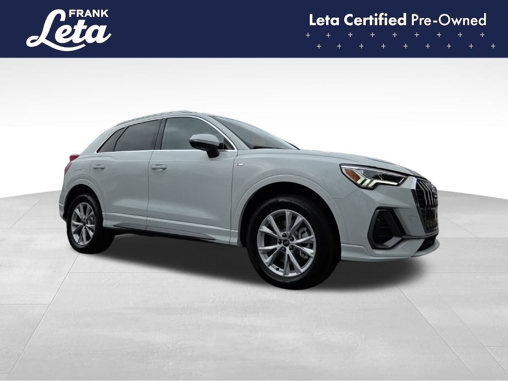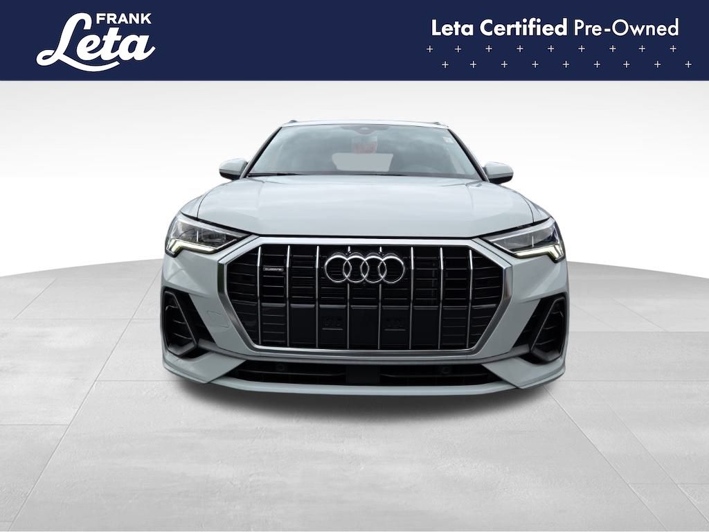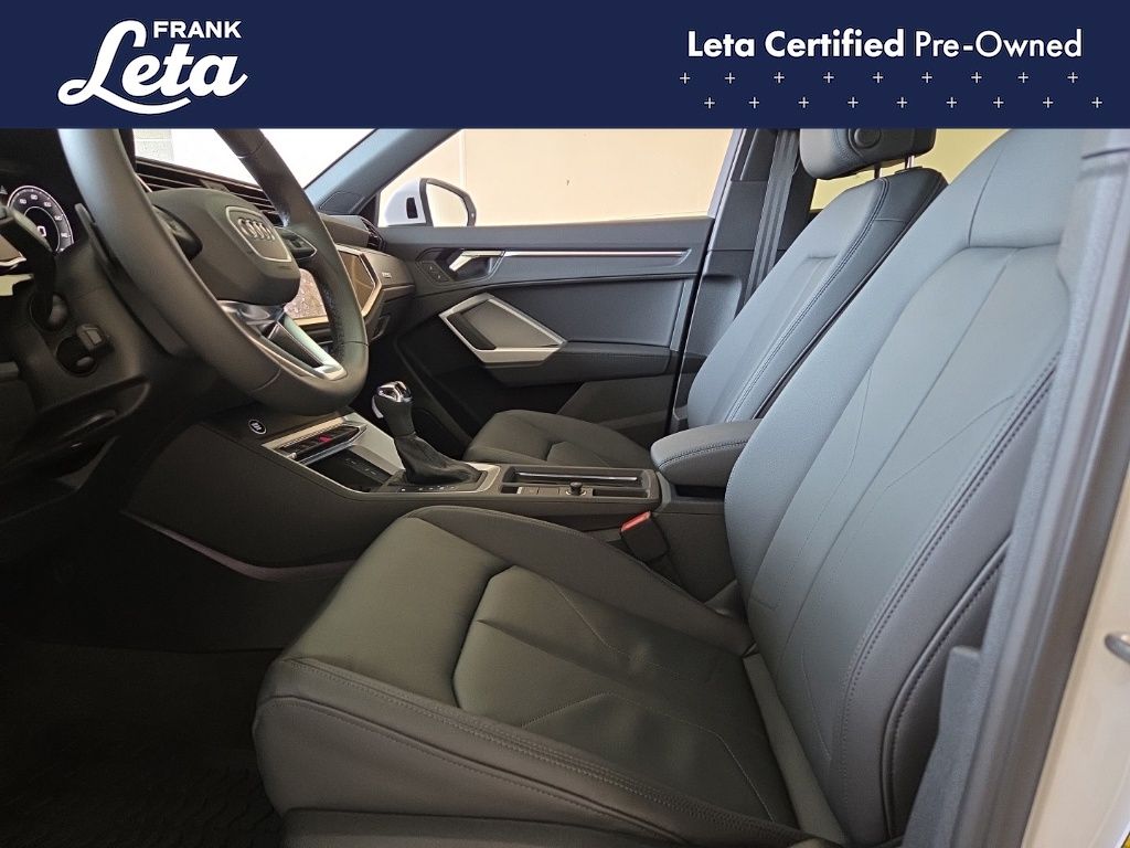 CARFAX One-Owner. 2025 Audi Q3 Premium Plus S Line quattro Arkona White Q3 Premium Plus S Line quattro, Frank Leta Certified Certified, 2.0L 4-Cylinder TFSI, 8-Speed Automatic with Tiptronic, quattro, Arkona White, Black w/Leather Seating Surfaces, 10 Speakers, Audi smartphone interface (Apple CarPlay/Android Auto), Exterior Parking Camera Rear, Front dual zone A/C, Front fog lights, Fully automatic headlights, Heated front seats, Power Liftgate, Power moonroof: Panoramic, Wheels: 18" 5-V-Spoke-S Design, 4-Wheel Disc Brakes, ABS brakes, Air Conditioning, AM/FM radio, Auto High-beam Headlights, Automatic temperature control, Brake assist, Bumpers: body-color, Delay-off headlights, Driver door bin, Driver vanity mirror, Dual front impact airbags, Dual front side impact airbags, Electronic Stability Control, Emergency communication system: Audi connect CARE, Four wheel independent suspension, Front anti-roll bar, Front Bucket Seats, Front Center Armrest, Front reading lights, Heated door mirrors, Heated Front Bucket Seats, Illuminated entry, Knee airbag, Leather Seating Surfaces, Leather Shift Knob, Leather steering wheel, Low tire pressure warning, Occupant sensing airbag, Outside temperature display, Overhead airbag, Overhead console, Panic alarm, Passenger door bin, Passenger vanity mirror, Power door mirrors, Power driver seat, Power passenger seat, Power steering, Power windows, Radio data system, Radio: Audi Sound System, Rain sensing wipers, Rear air conditioning, Rear anti-roll bar, Rear fog lights, Rear reading lights, Rear seat center armrest, Rear window defroster, Rear window wiper, Remote keyless entry, Speed control, Speed-sensing steering, Split folding rear seat, Spoiler, Steering wheel mounted audio controls, Tachometer, Telescoping steering wheel, Tilt steering wheel, Traction control, Trip computer, Turn signal indicator mirrors, Variably intermittent wipers, Q3 Premium Plus S Line quattro, 2.0L 4-Cylinder TFSI, 8-Speed Automatic with Tiptronic, quattro, Arkona White, Black w/Leather Seating Surfaces, 10 Speakers, Audi smartphone interface (Apple CarPlay/Android Auto), Exterior Parking Camera Rear, Front dual zone A/C, Front fog lights, Fully automatic headlights, Heated front seats, Power Liftgate, Power moonroof: Panoramic, Wheels: 18" 5-V-Spoke-S Design. 2.0L 4-Cylinder TFSI 8-Speed Automatic with Tiptronic quattro 4D Sport Utility 20/28 City/Highway MPG