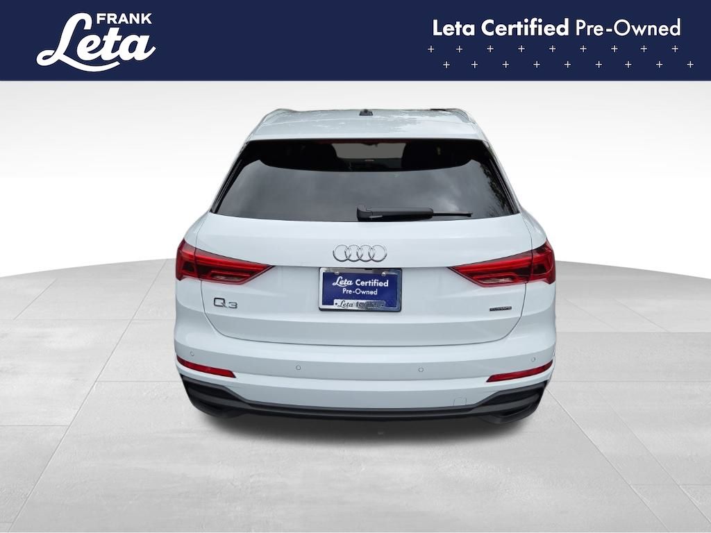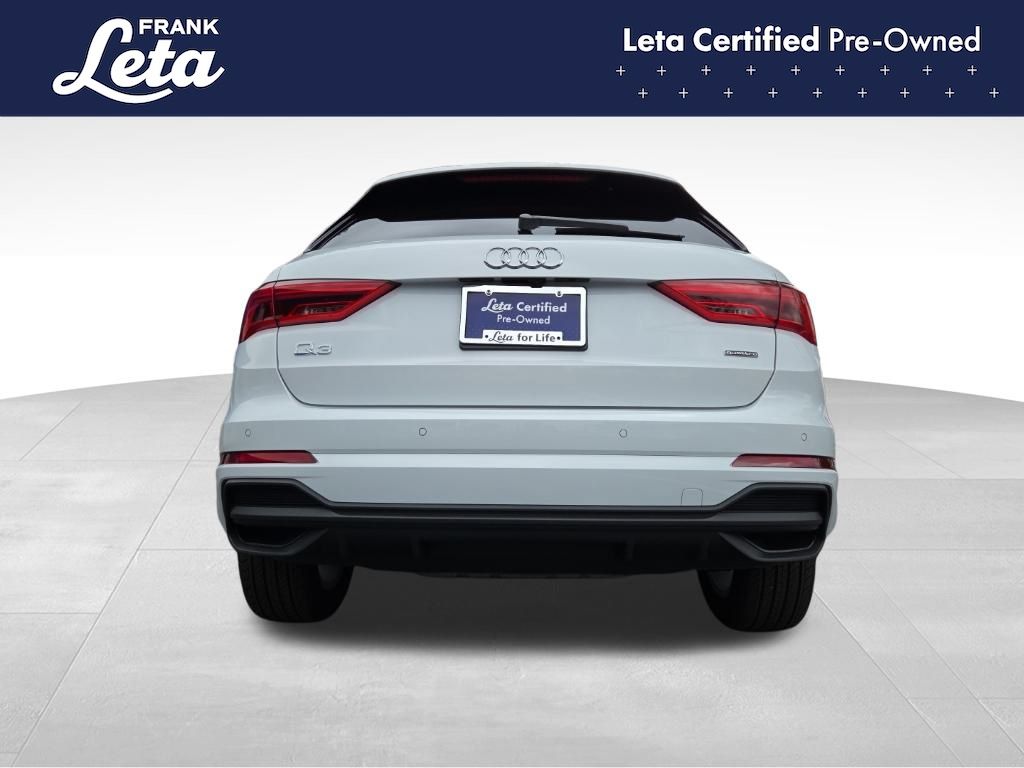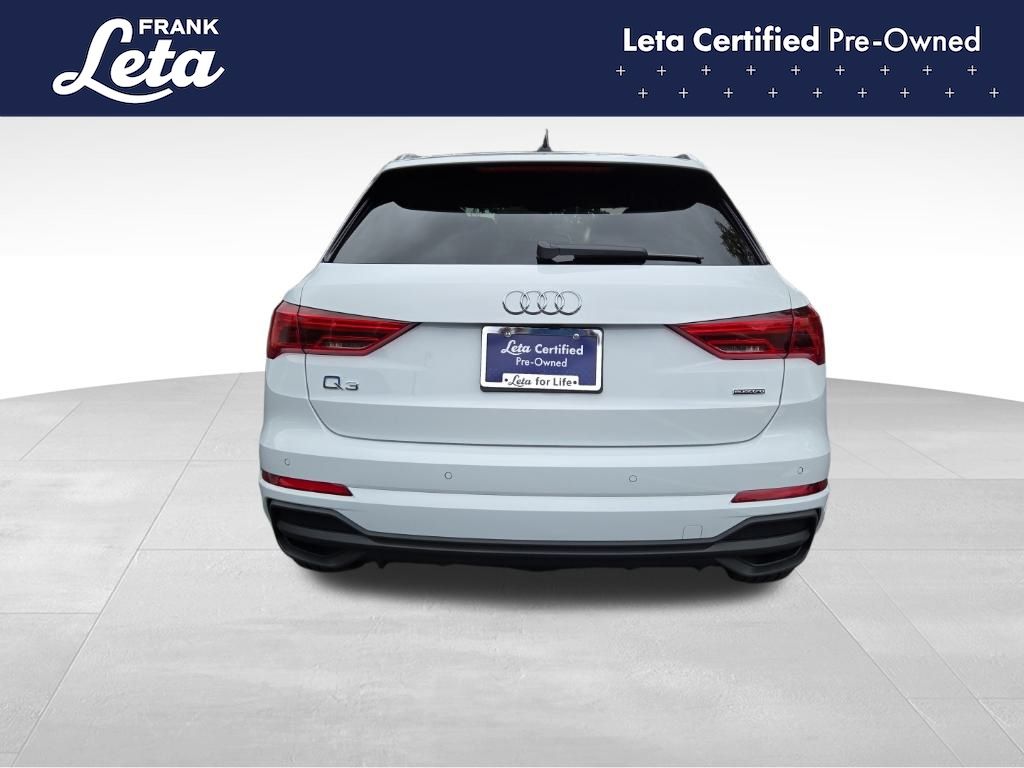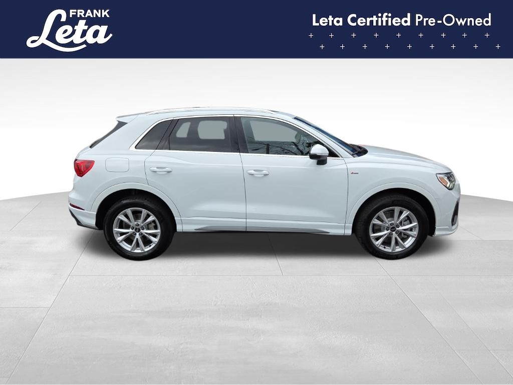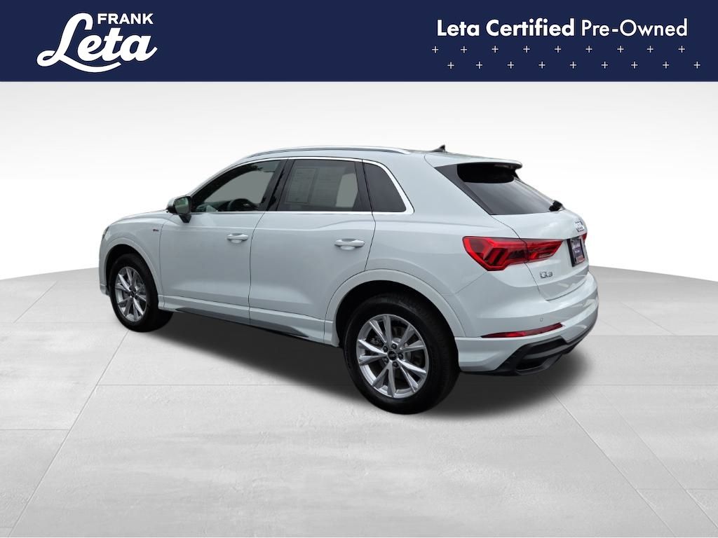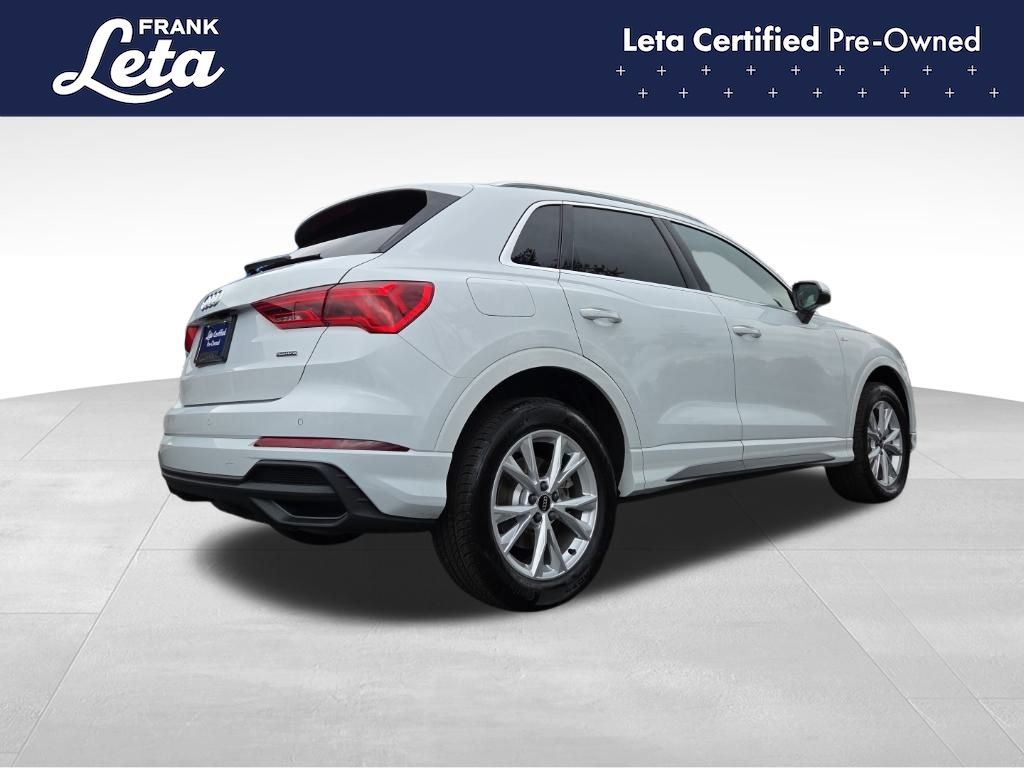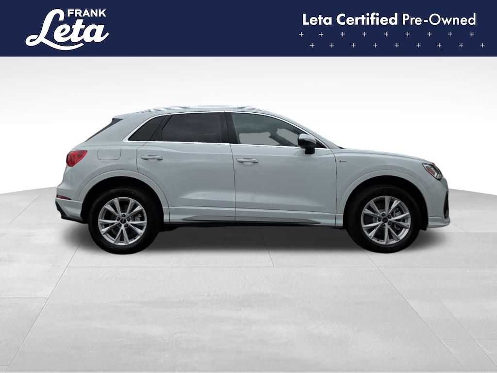 CARFAX One-Owner. 2025 Audi Q3 Premium Plus S Line quattro Arkona White Q3 Premium Plus S Line quattro, Frank Leta Certified Certified, 2.0L 4-Cylinder TFSI, 8-Speed Automatic with Tiptronic, quattro, Arkona White, Black w/Leather Seating Surfaces, 10 Speakers, Audi smartphone interface (Apple CarPlay/Android Auto), Exterior Parking Camera Rear, Front dual zone A/C, Front fog lights, Fully automatic headlights, Heated front seats, Power Liftgate, Power moonroof: Panoramic, Wheels: 18" 5-V-Spoke-S Design, 4-Wheel Disc Brakes, ABS brakes, Air Conditioning, AM/FM radio, Auto High-beam Headlights, Automatic temperature control, Brake assist, Bumpers: body-color, Delay-off headlights, Driver door bin, Driver vanity mirror, Dual front impact airbags, Dual front side impact airbags, Electronic Stability Control, Emergency communication system: Audi connect CARE, Four wheel independent suspension, Front anti-roll bar, Front Bucket Seats, Front Center Armrest, Front reading lights, Heated door mirrors, Heated Front Bucket Seats, Illuminated entry, Knee airbag, Leather Seating Surfaces, Leather Shift Knob, Leather steering wheel, Low tire pressure warning, Occupant sensing airbag, Outside temperature display, Overhead airbag, Overhead console, Panic alarm, Passenger door bin, Passenger vanity mirror, Power door mirrors, Power driver seat, Power passenger seat, Power steering, Power windows, Radio data system, Radio: Audi Sound System, Rain sensing wipers, Rear air conditioning, Rear anti-roll bar, Rear fog lights, Rear reading lights, Rear seat center armrest, Rear window defroster, Rear window wiper, Remote keyless entry, Speed control, Speed-sensing steering, Split folding rear seat, Spoiler, Steering wheel mounted audio controls, Tachometer, Telescoping steering wheel, Tilt steering wheel, Traction control, Trip computer, Turn signal indicator mirrors, Variably intermittent wipers, Q3 Premium Plus S Line quattro, 2.0L 4-Cylinder TFSI, 8-Speed Automatic with Tiptronic, quattro, Arkona White, Black w/Leather Seating Surfaces, 10 Speakers, Audi smartphone interface (Apple CarPlay/Android Auto), Exterior Parking Camera Rear, Front dual zone A/C, Front fog lights, Fully automatic headlights, Heated front seats, Power Liftgate, Power moonroof: Panoramic, Wheels: 18" 5-V-Spoke-S Design. 2.0L 4-Cylinder TFSI 8-Speed Automatic with Tiptronic quattro 4D Sport Utility 20/28 City/Highway MPG